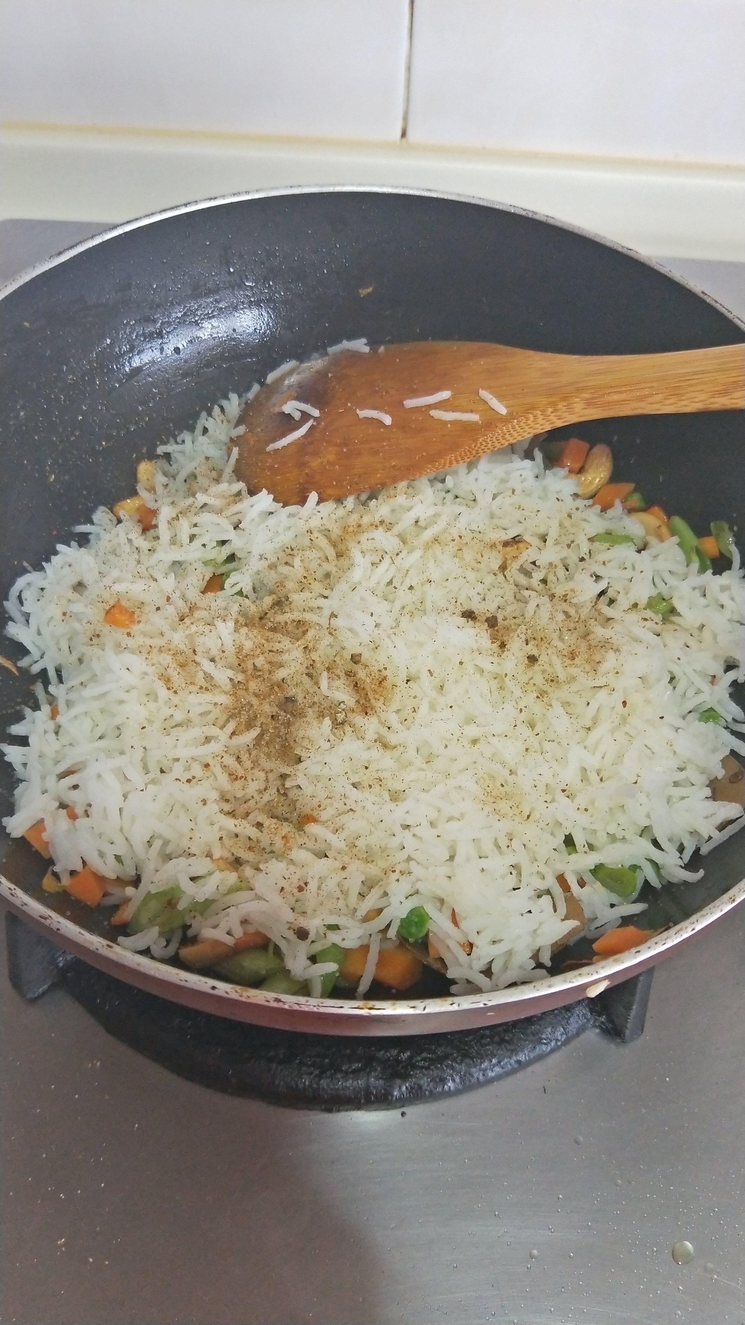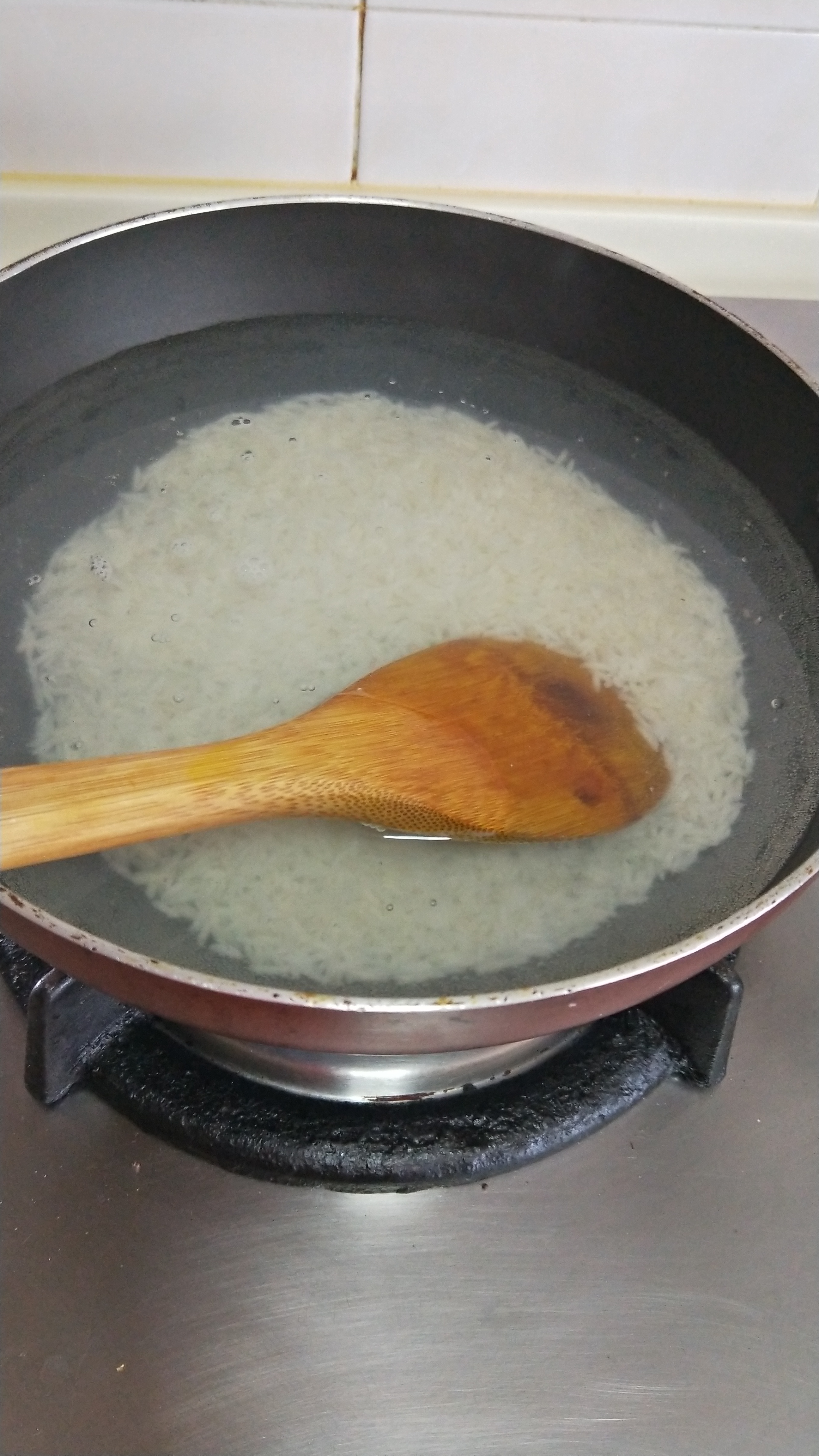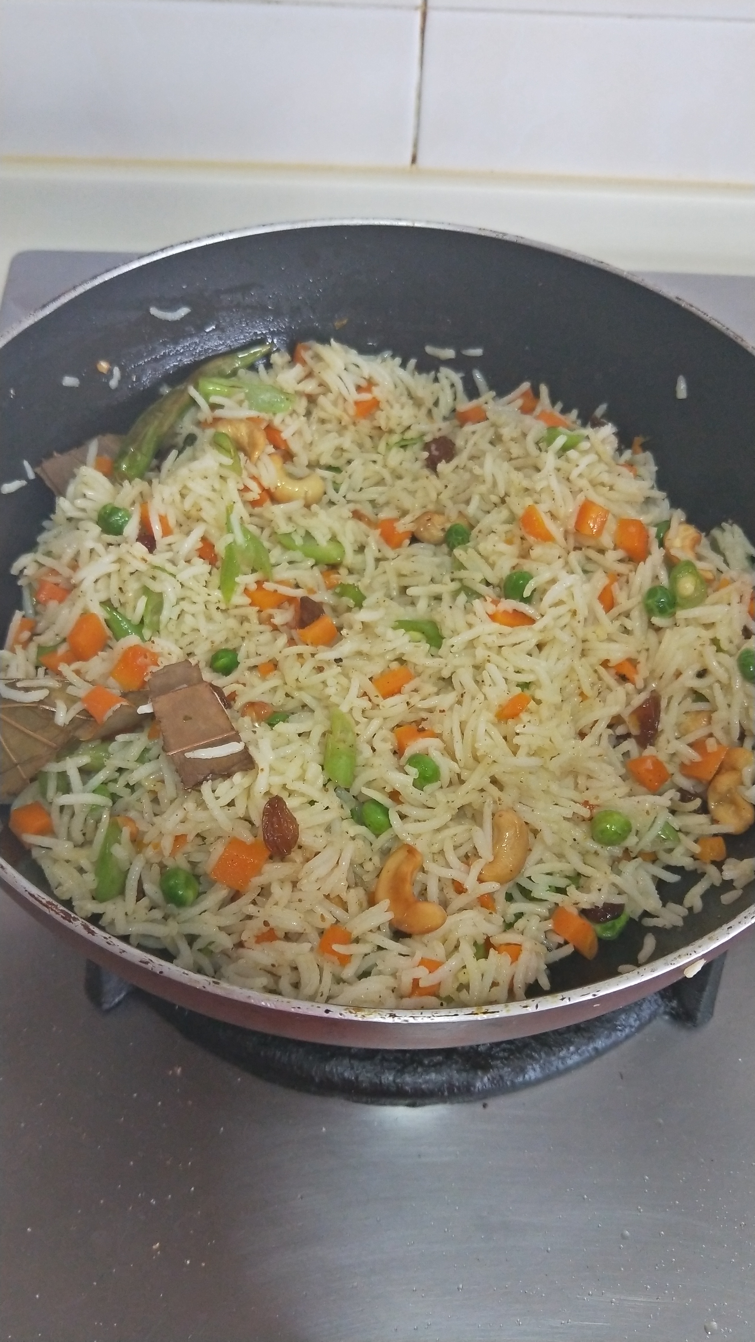 • Once rice is soaked, add one more cup of water to it and salt and cook on stove top till 90% done.