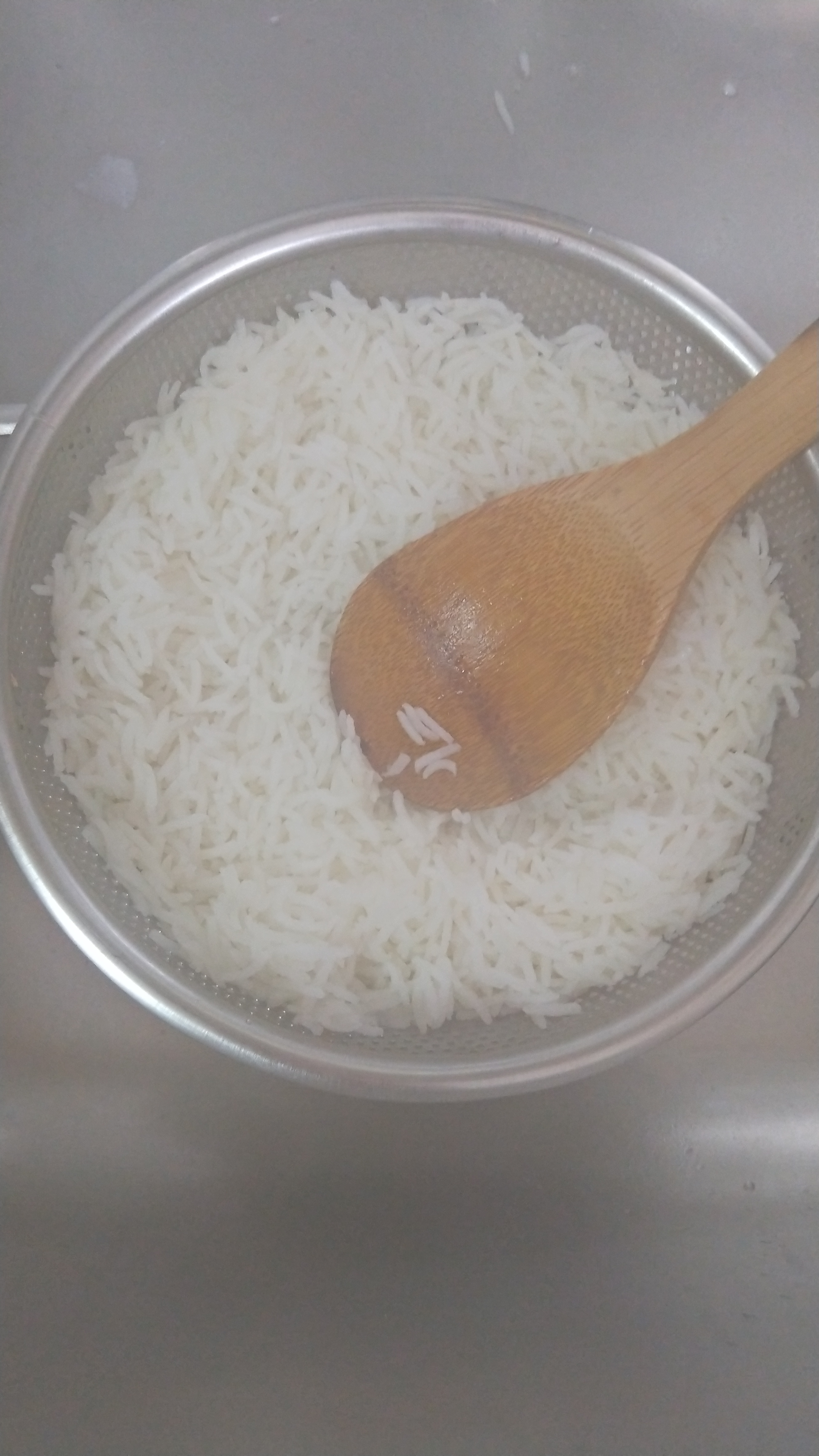 Once rice is soaked, add one more cup of water to it and salt and cook on stove top till 90% done. This is so because the rice will cook further in the last few steps. We definitely dont want mushy rice here. So your rice must be a tad under cooked. Switch off flame and drain rice completely. Fluff with a fork.