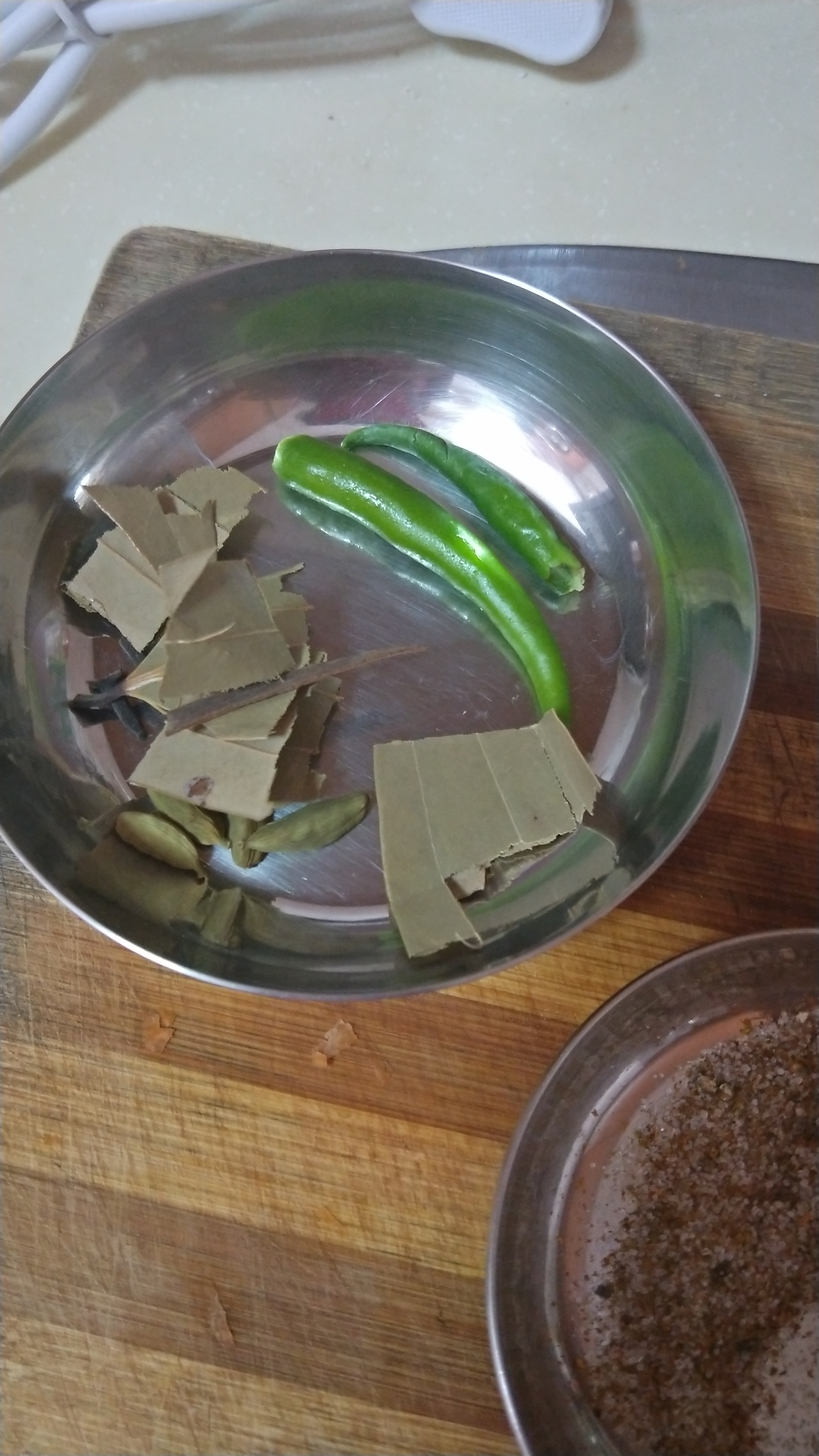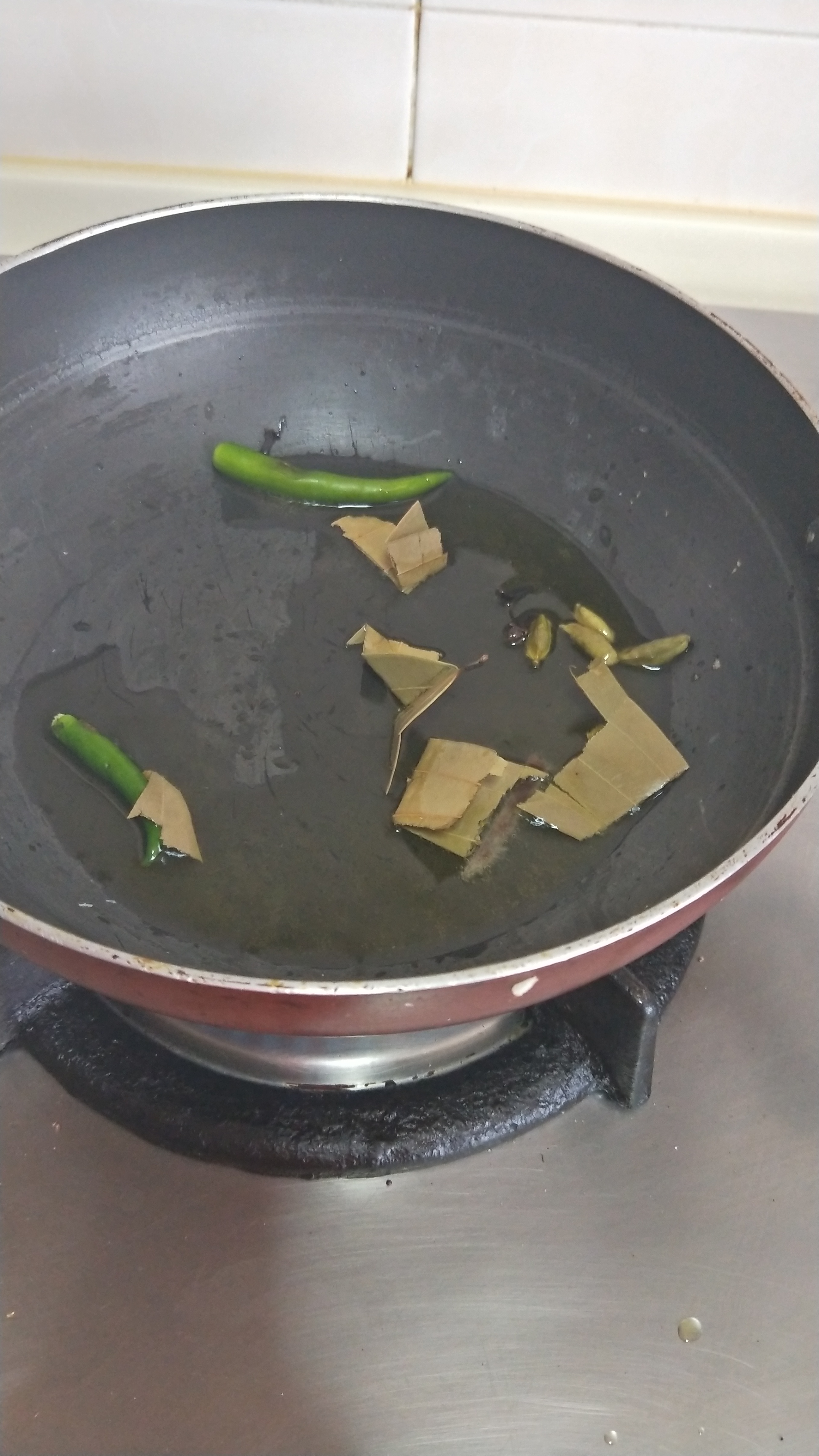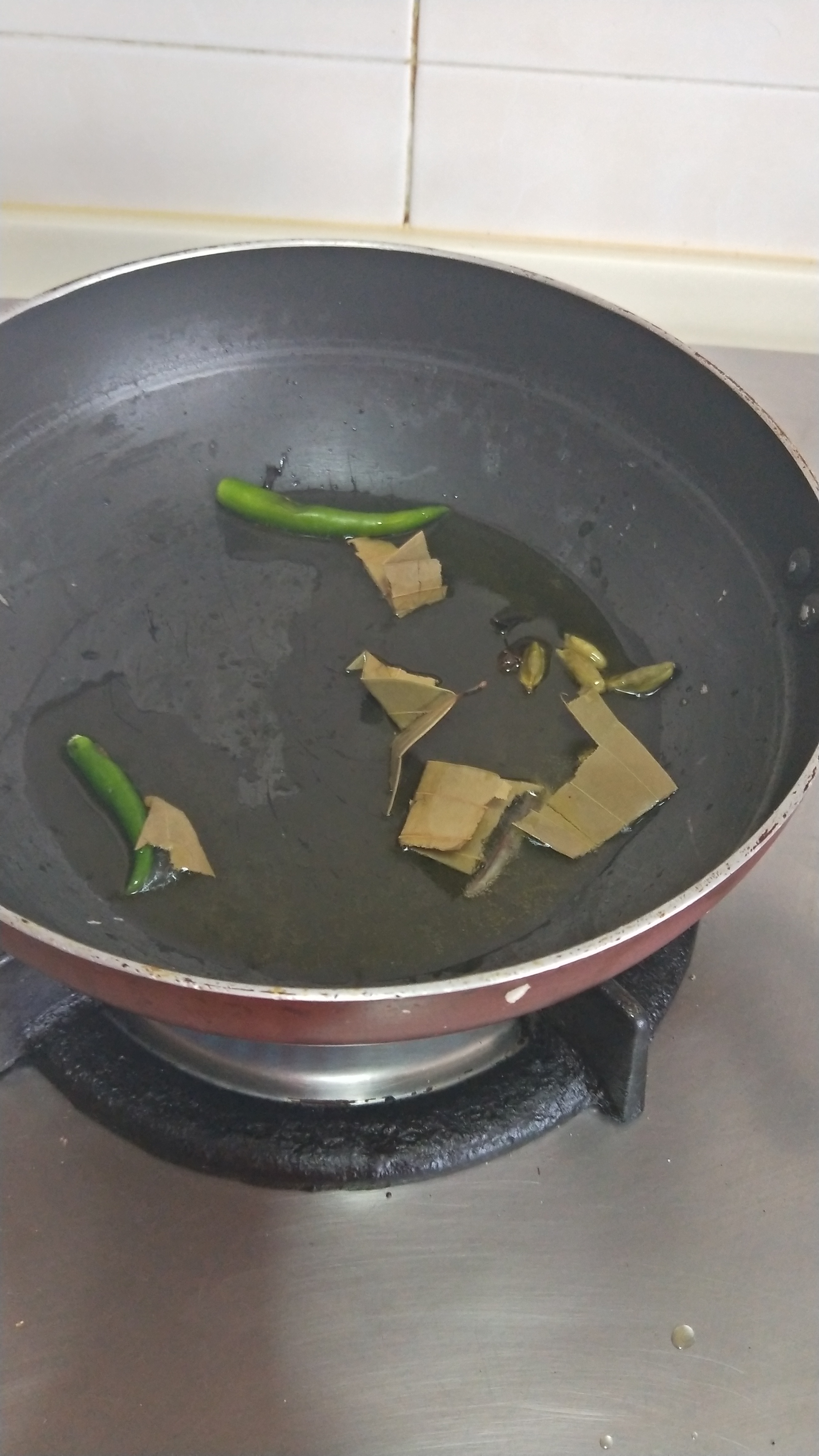 • Add whole spices along with green chili and cook for 10 to 20 secs.