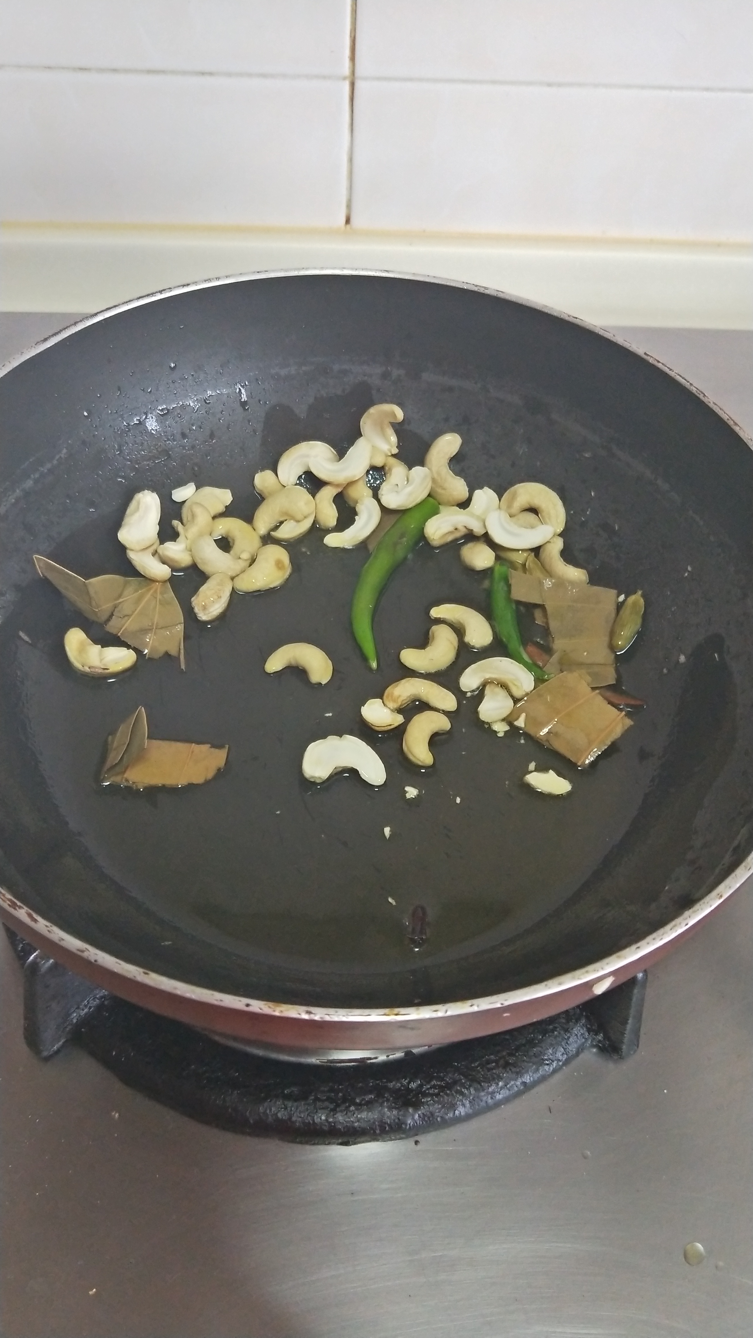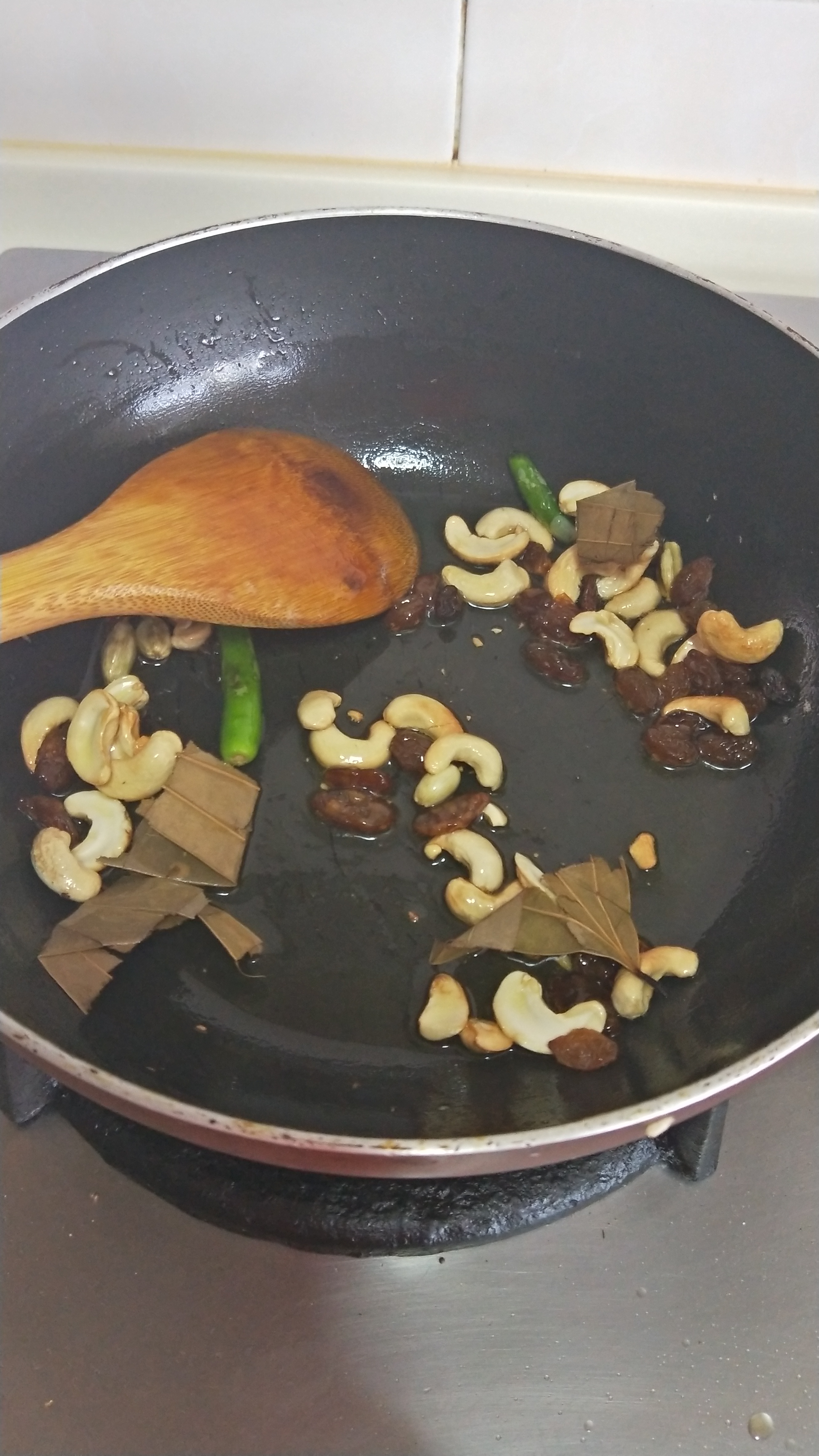 Now, heat a large pan with oil and ghee. Once hot,Add cashews and fry till golden. Drain. Tip in raisins and fry till they are puffed up.  Add whole spices along with green chili  and cook for 10 to 20 secs.