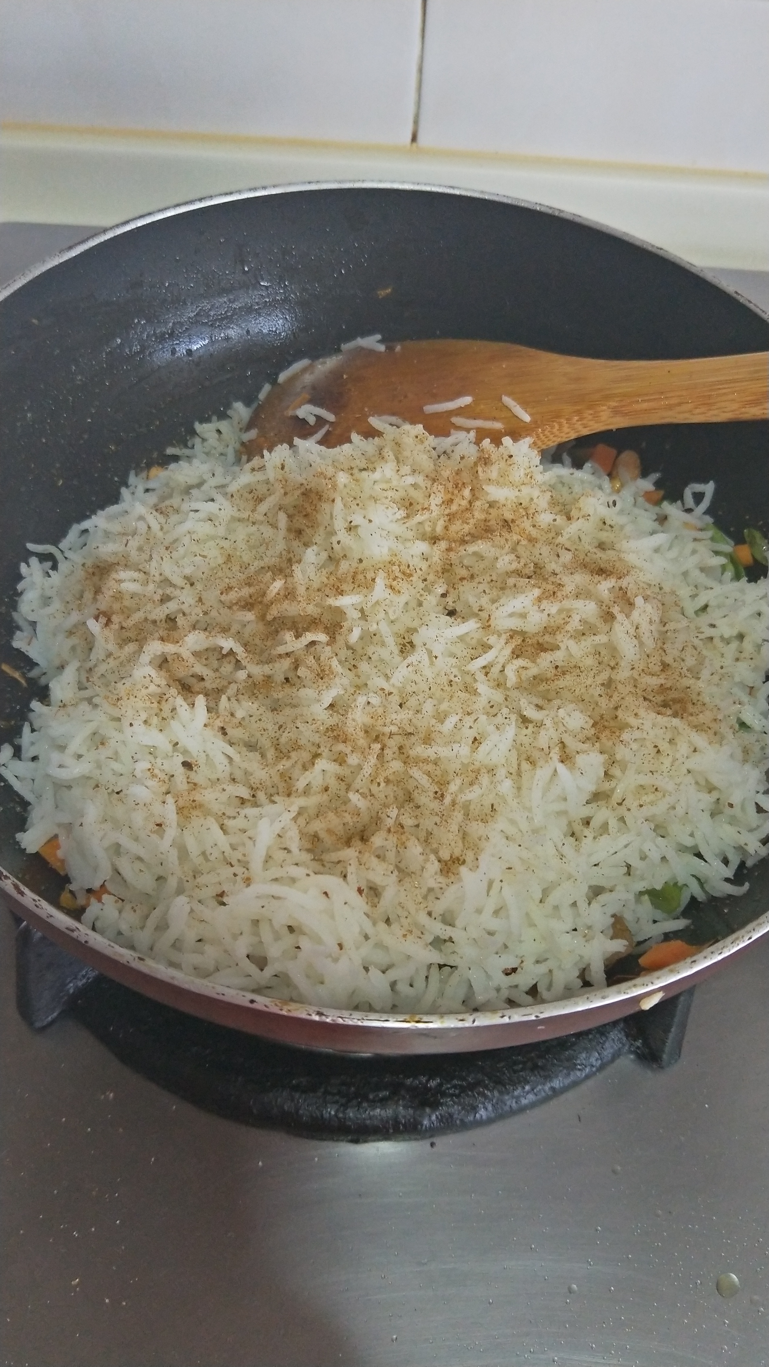 Next, divide the rice into two batches. Add one batch to the pan and spread evenly. Add half of the seasoning mix. Do not mix this. Add remaining rice and spread evenly. Sprinkle the remaining seasoning over the rice. Now, gently mix in the rice using a folding motion. Once, everything mixes up properly, place on low flame and cook covered for 10 mins. Your pulao is ready. Garnish with coriander leaves and serve hot with kadai paneer, dhaba style dal or shahi paneer.