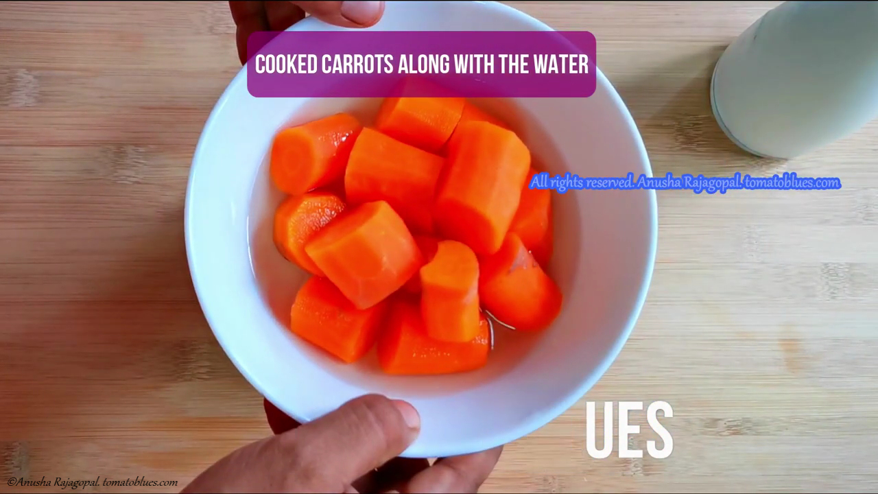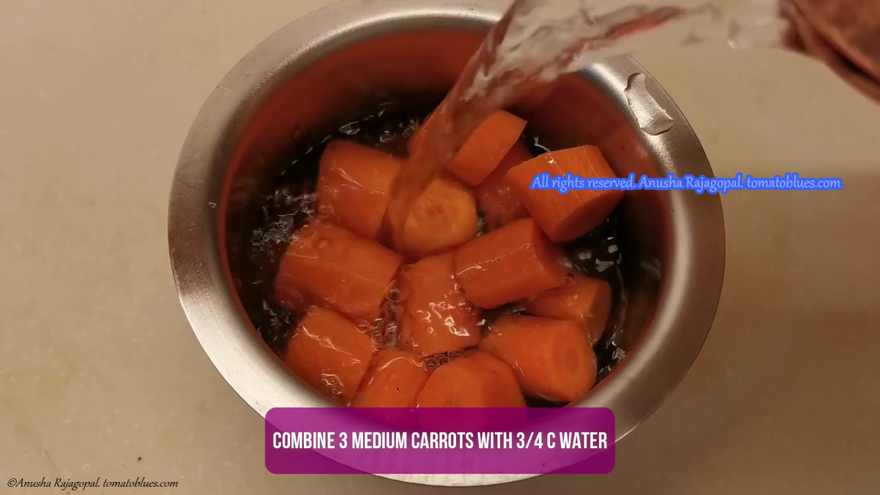 - Pressure cook carrots with 3/4 c water for 2 whistles. Let pressure release naturally. Allow carrots to cool.