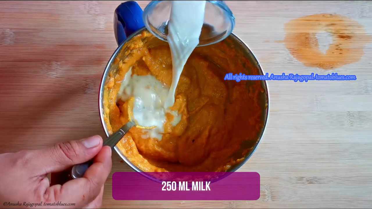 Next, add milk to the blended carrot puree. Blend again to a smooth puree to a smoothie-like consistency.