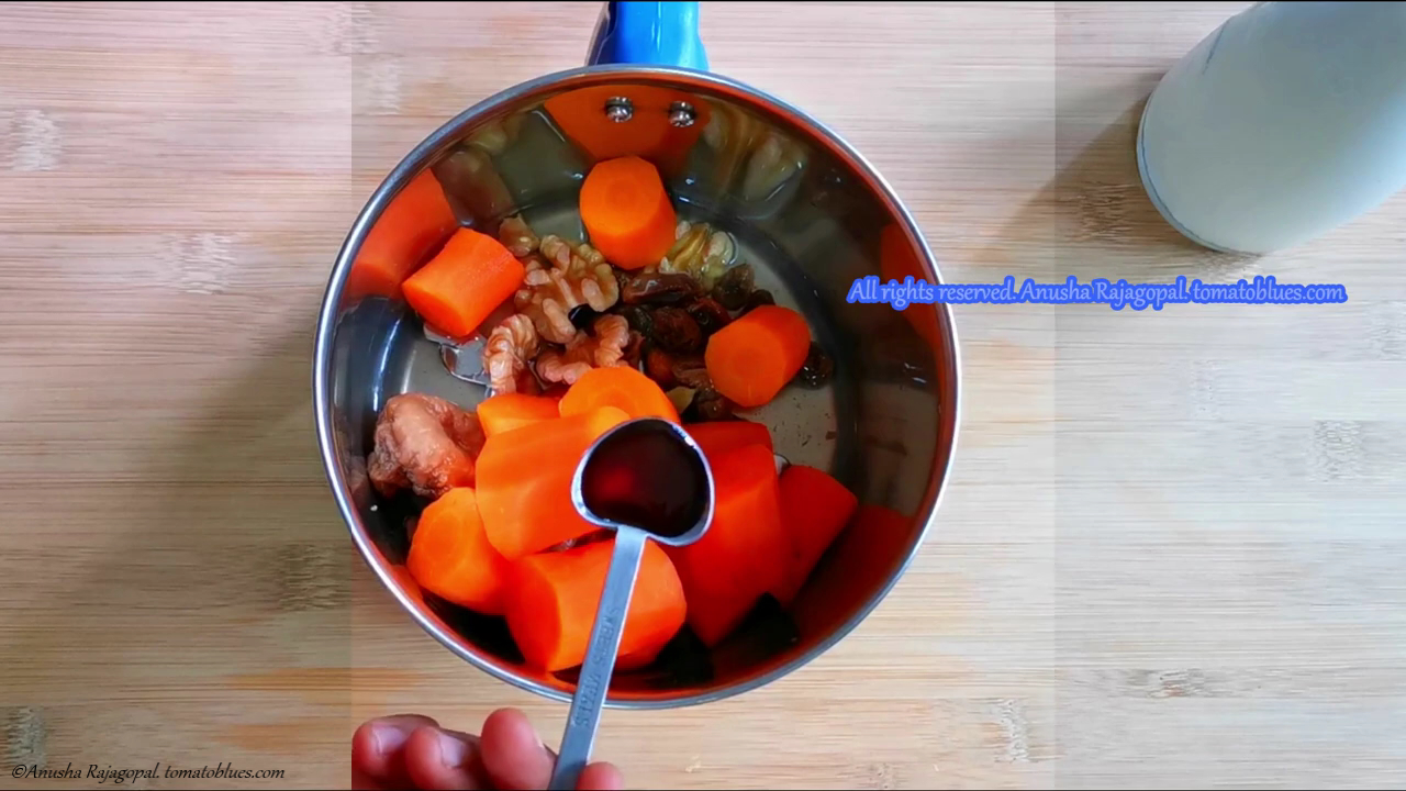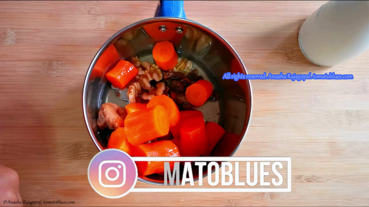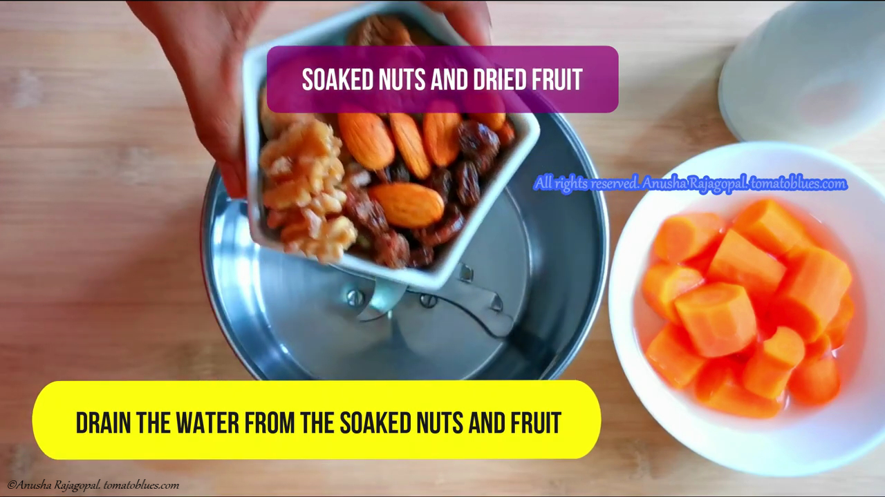 - Add the nuts and fruit to a blender.Add cooked carrots along with the water used for cooking to a blender.