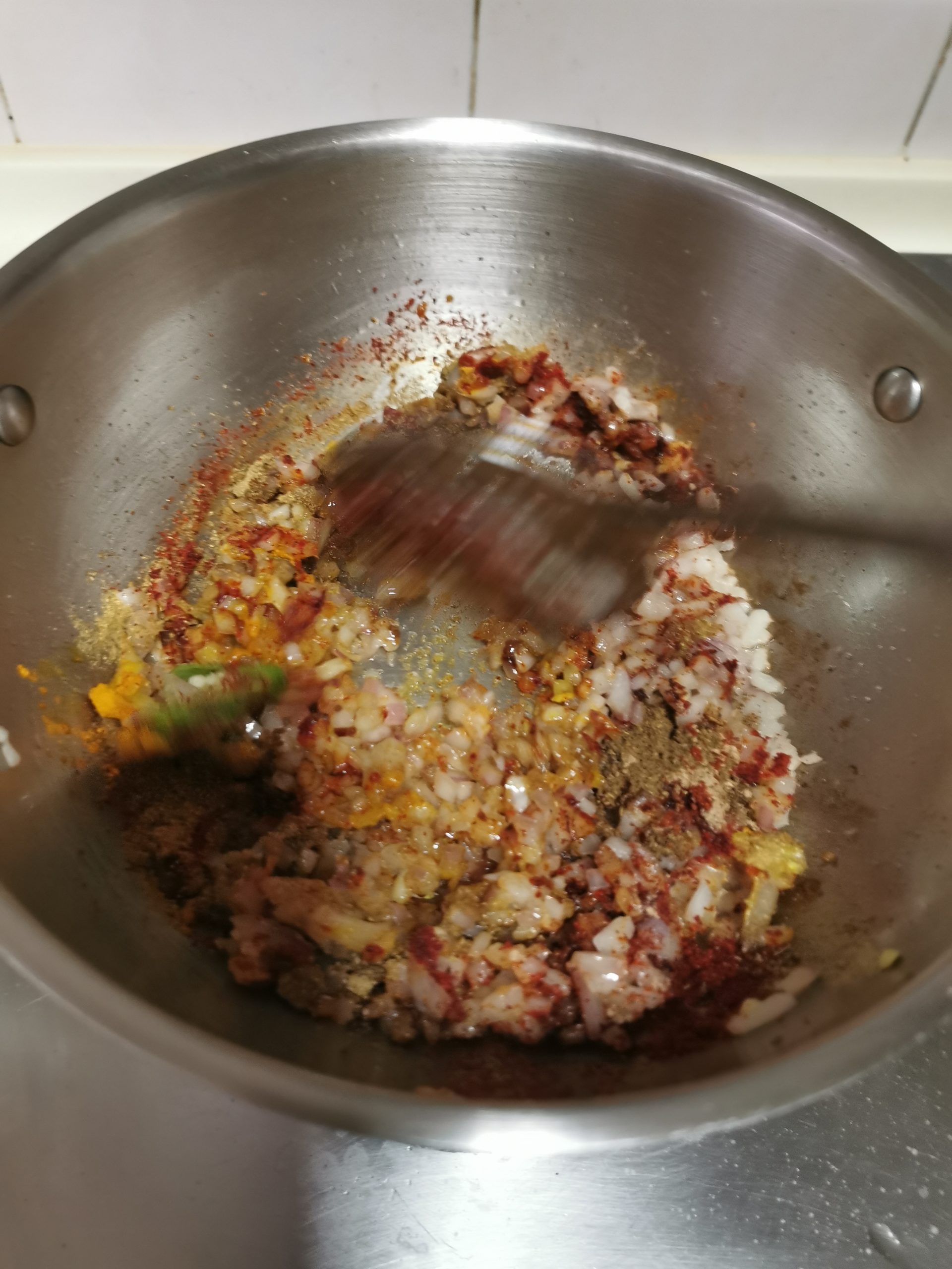 - At this point, add the onions and mix well. Add salt to the onions to help cook them faster.
