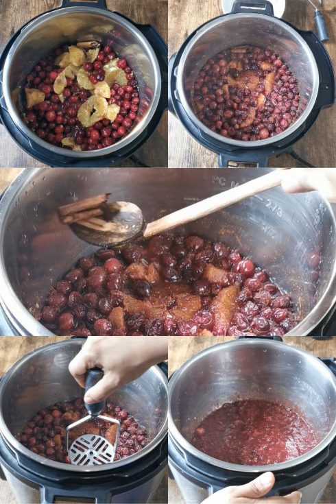 Insert the inner pot into the instant pot. Add the frozen cranberries, oranges, orange zest, grated ginger, ground spices, whole spices, vinegar, coconut sugar, salt, water and orange juice. Mix well to combine.