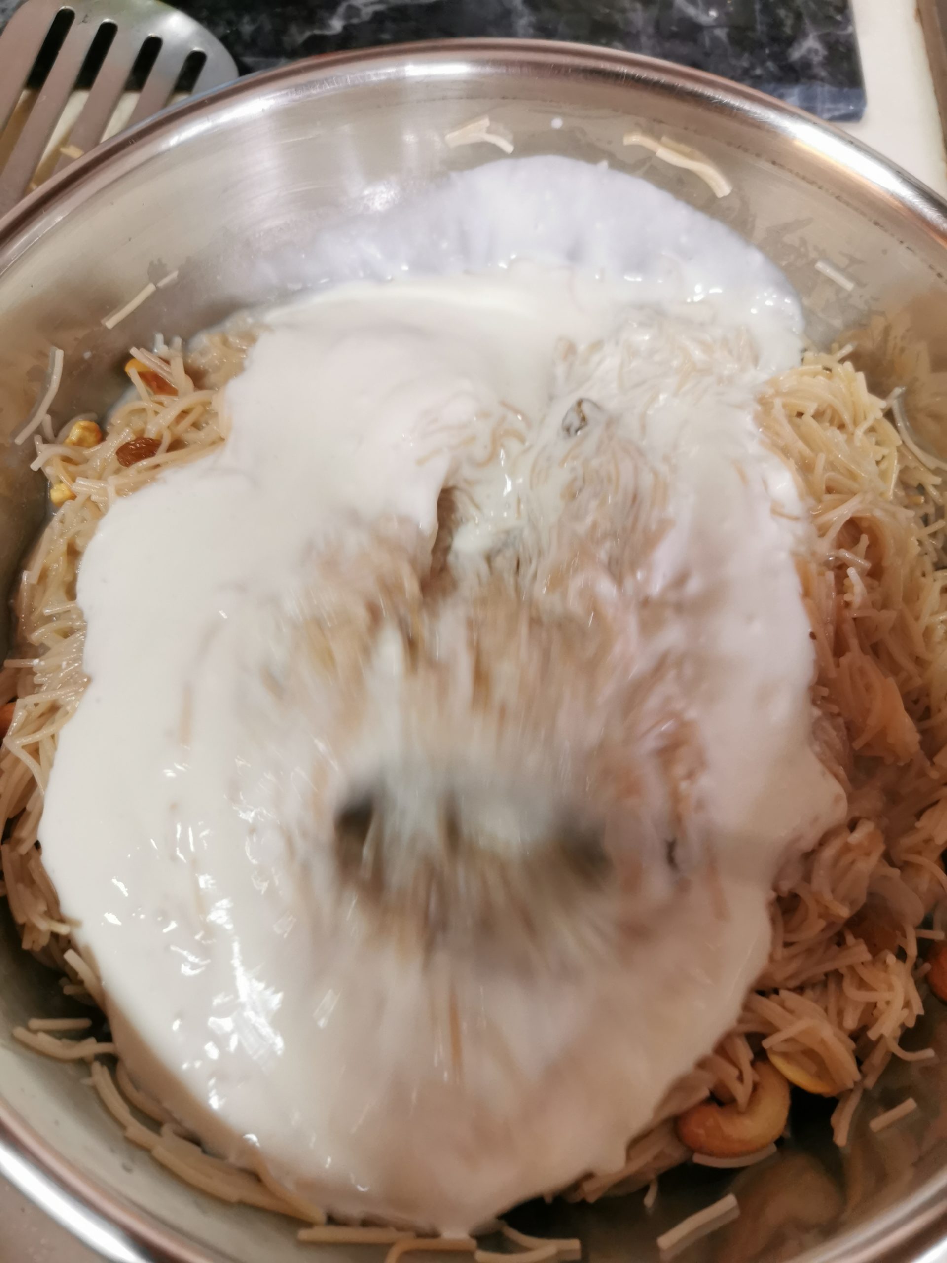 - Whisk the curd well and mix with the milk and add to the vermicelli and combine well.