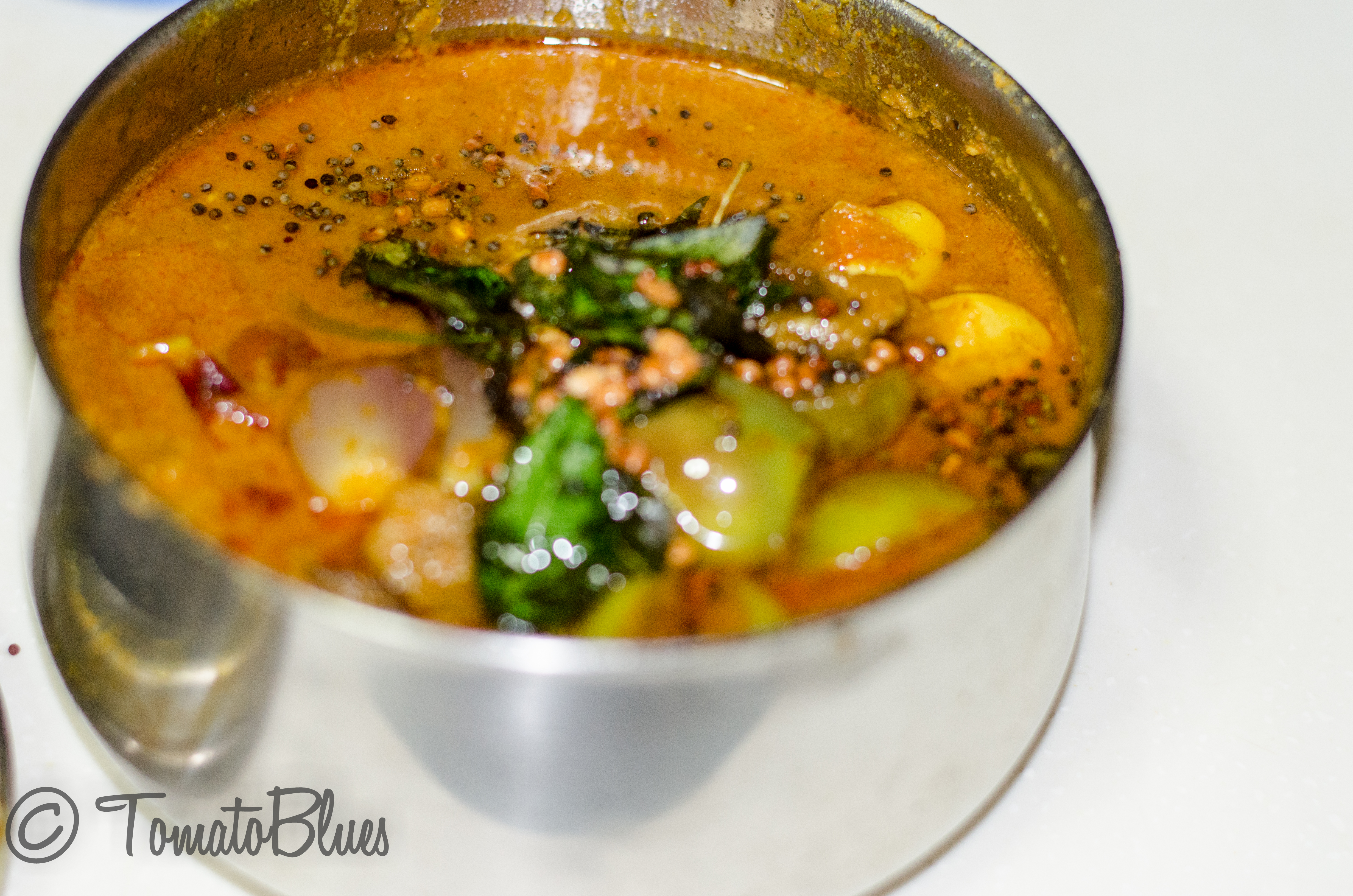 MAA VATHAL KUZHAMBU- SUN DRIED MANGOES, EGGPLANTS IN A TANGY SAUCE.