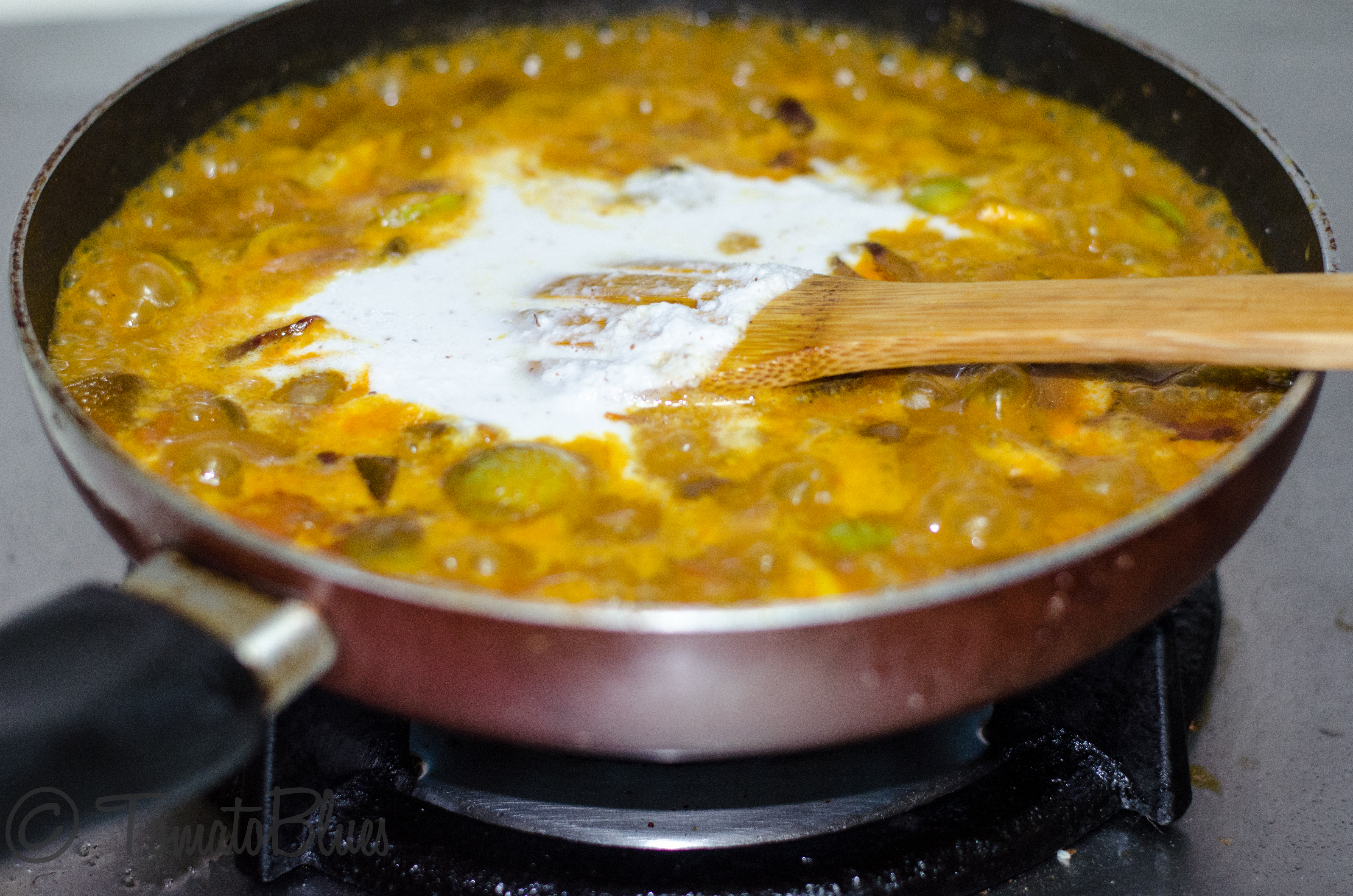 - Add tamarind extract next along with salt and jaggery and mix well.
