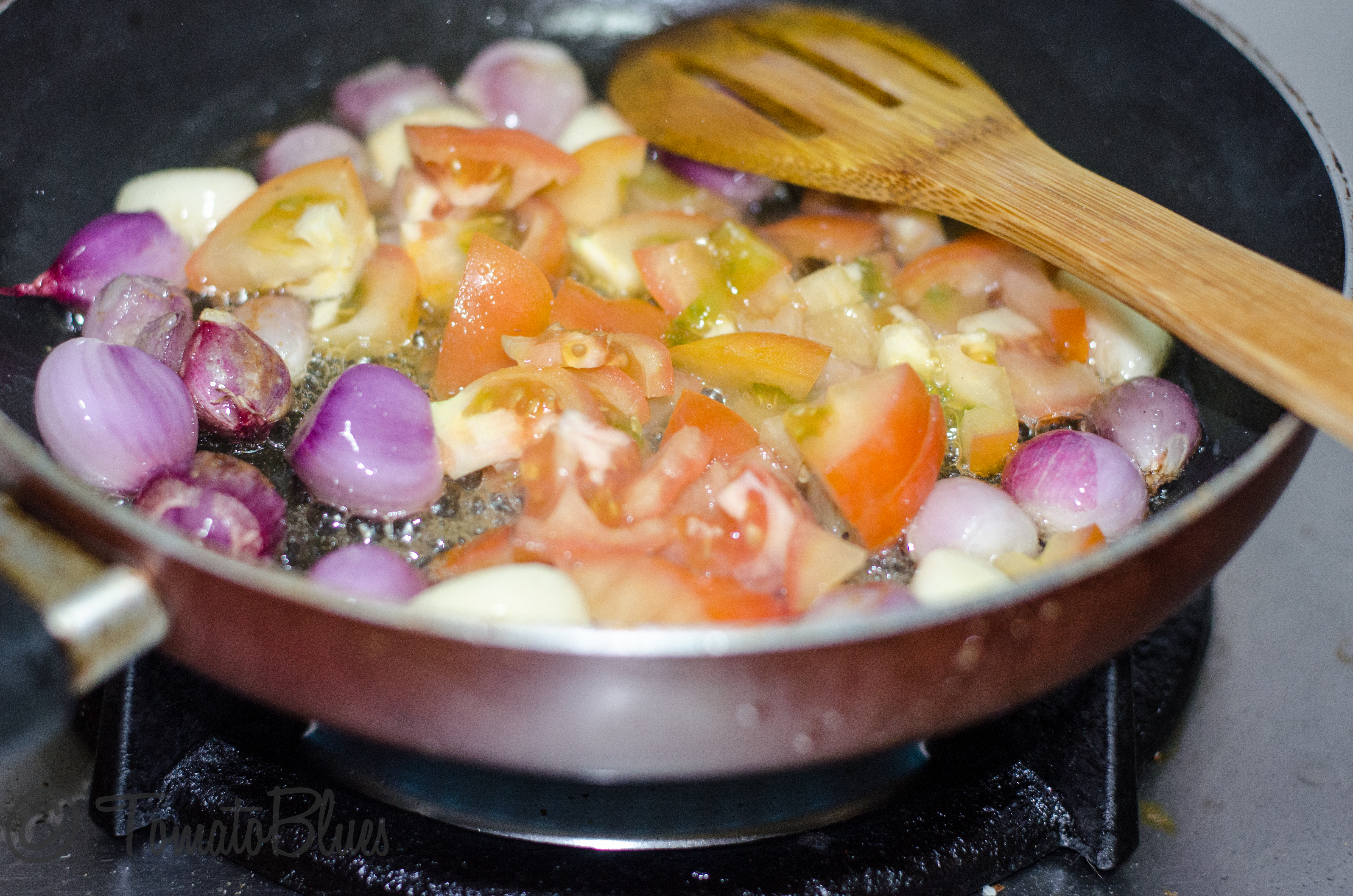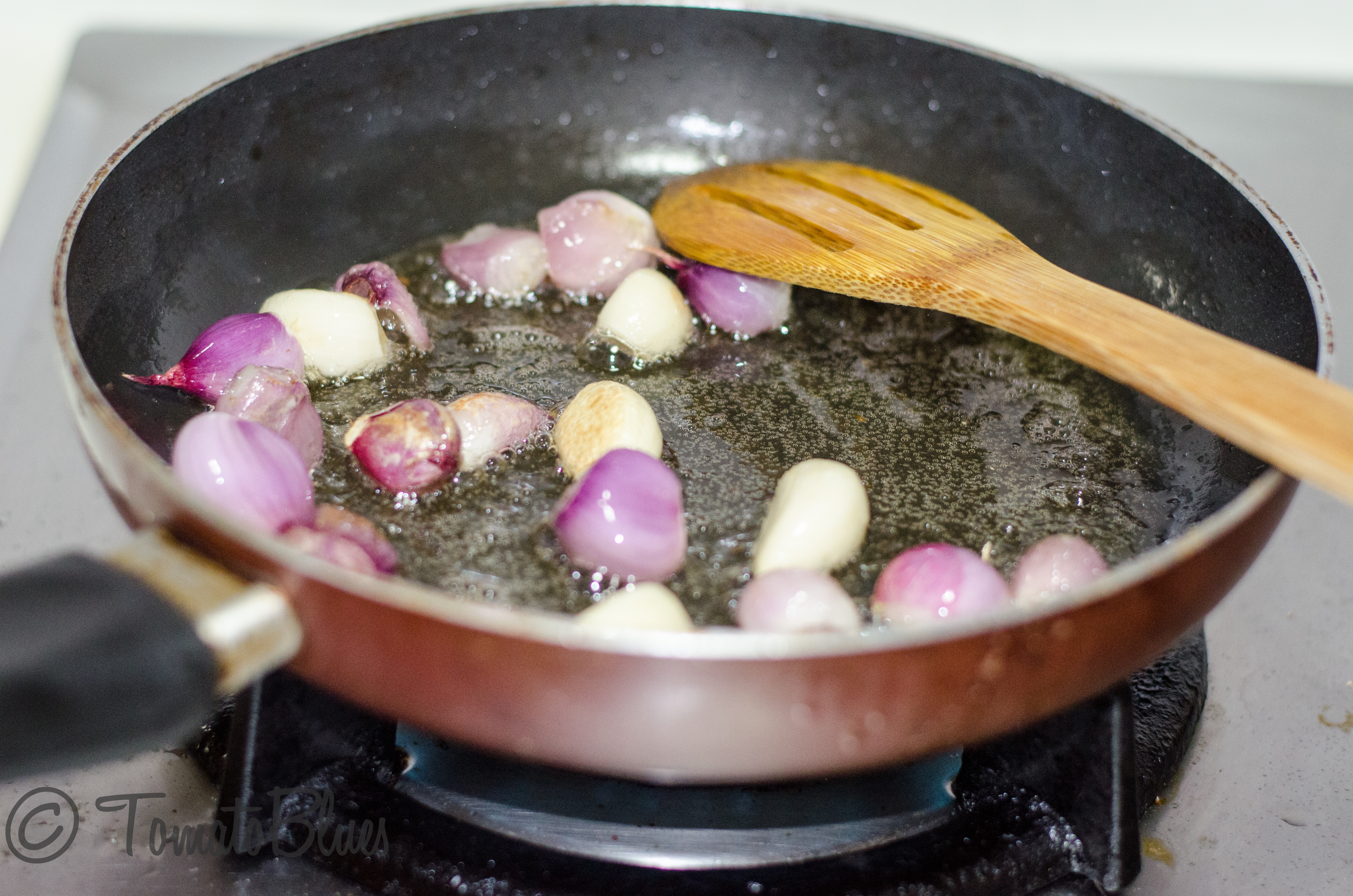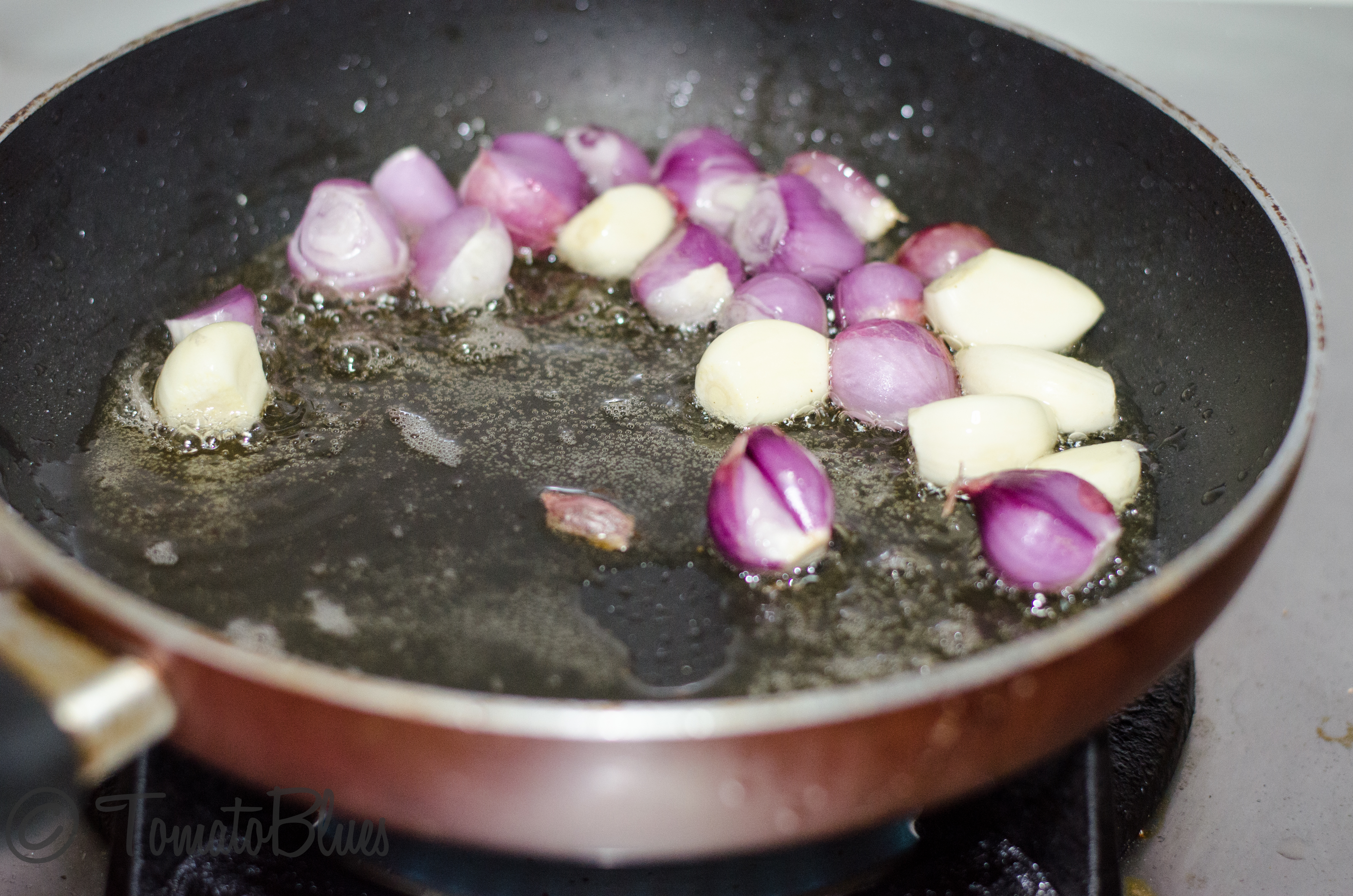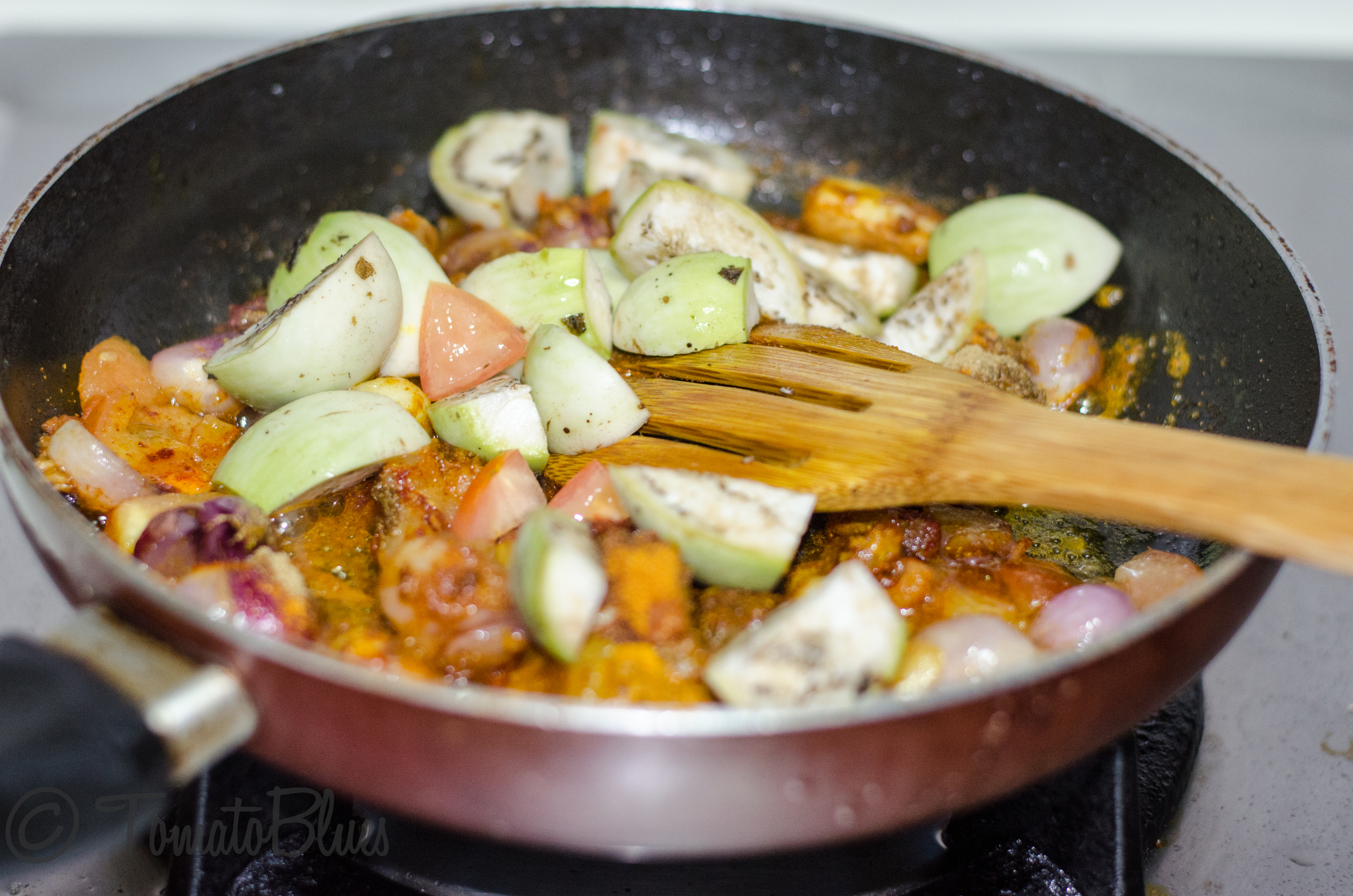 Heat a pan with sesame oil. Add the shallots and garlic and saute till they turn brown. Once done, add eggplants and tomatoes and fry till mushy.