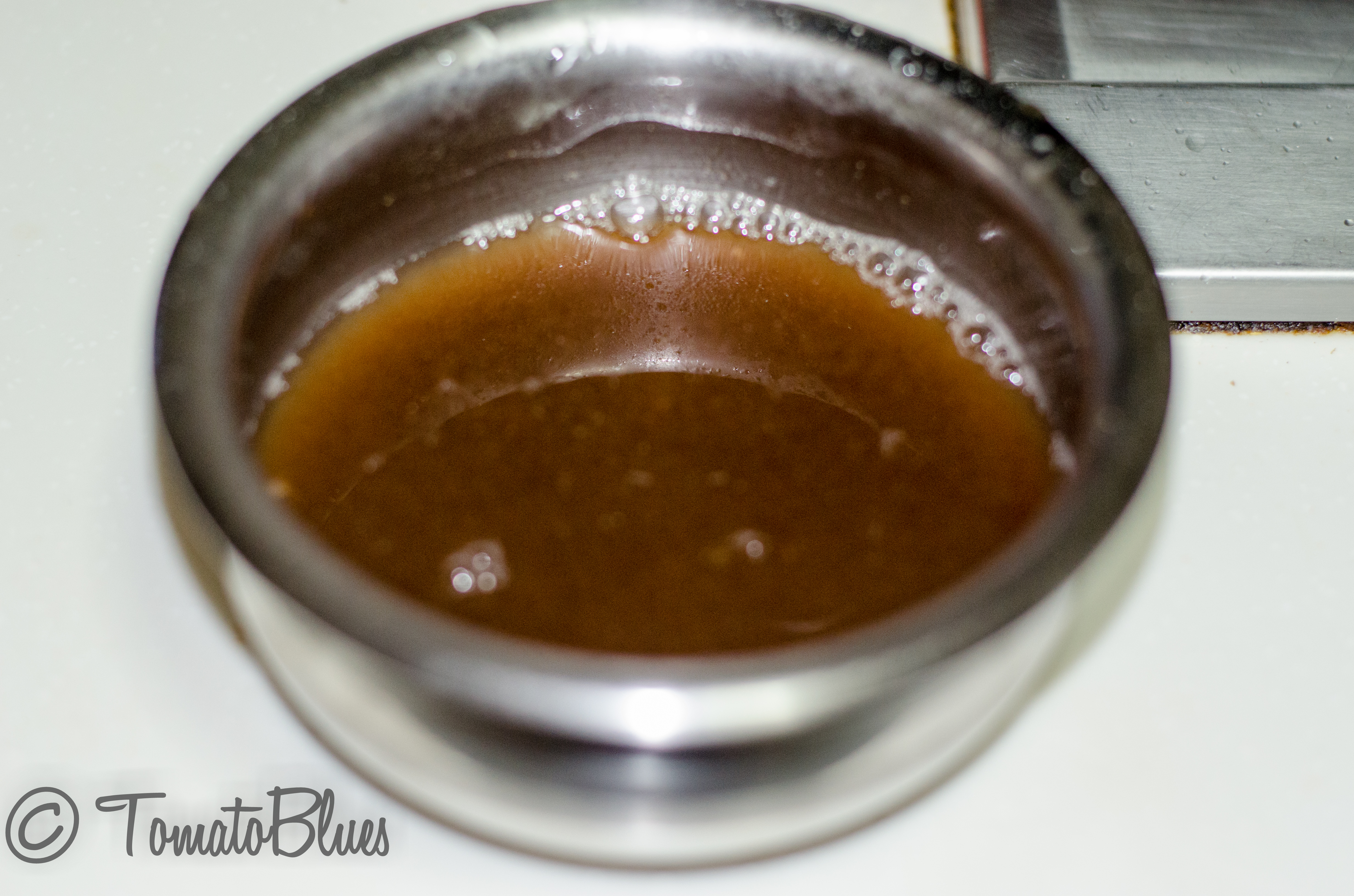 - Soak a small ball of tamarind in hot water and make a thick tamarind extract.