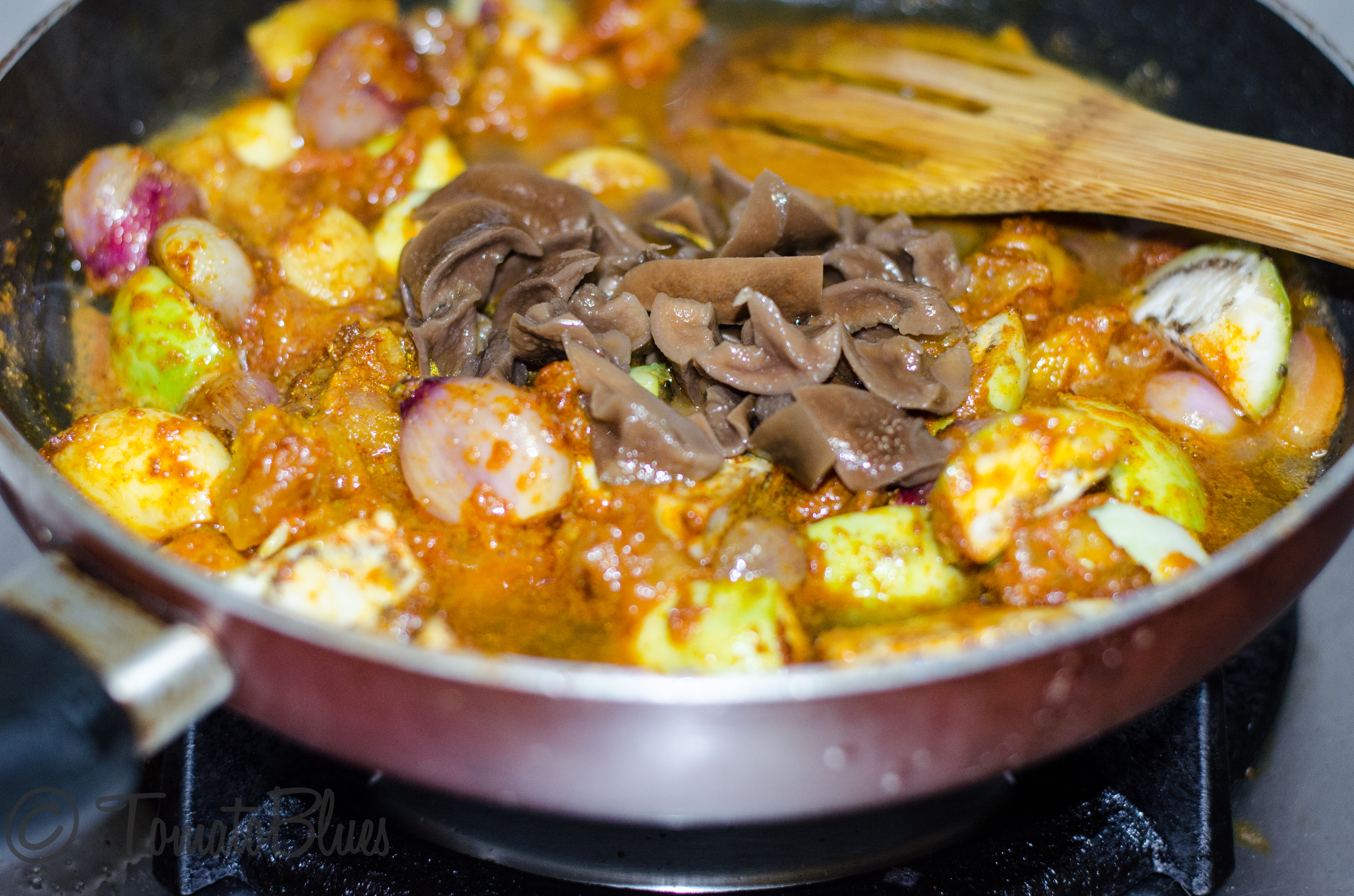At this stage, add all the spice powders and mix well. Cook for 30 secs. Now, add the sun dried mango pieces and mix well. Add tamarind extract next along with salt and jaggery and mix well. Let it simmer until raw smell of tamarind goes away