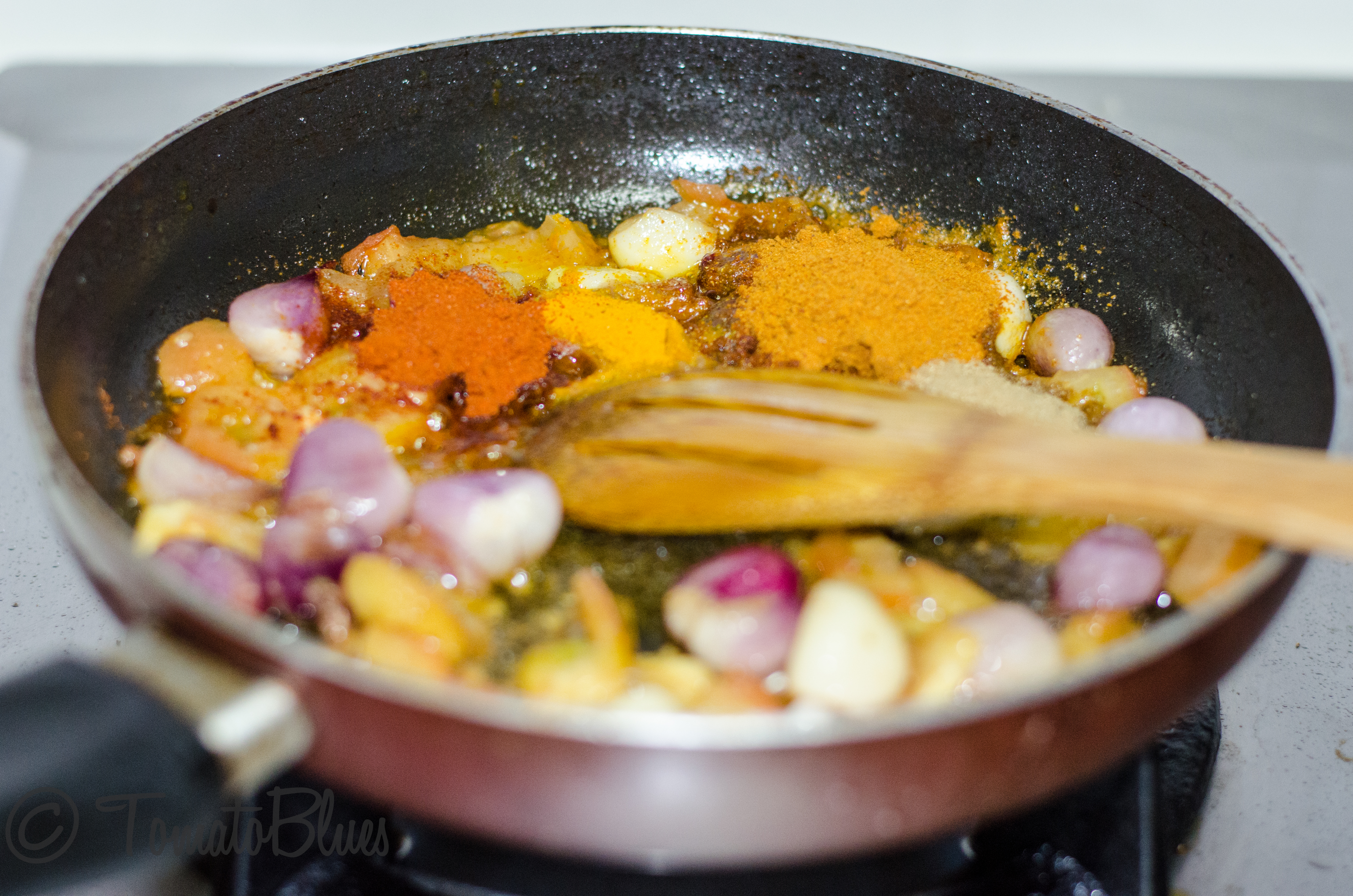 - At this stage, add kuzhambu milagai thool, red chili powder, turmeric powder and coriander powder and mix well. Cook for 30 secs.