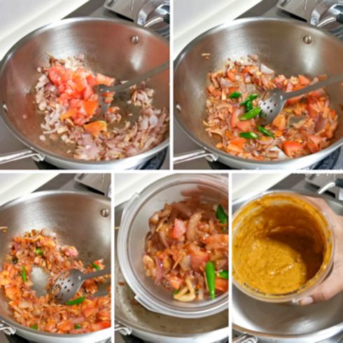 Add this fried onion tomato mixture to the blender jar with the other ingredients. Allow the mixture to cool. When cool, grind to a smooth paste without adding any water.