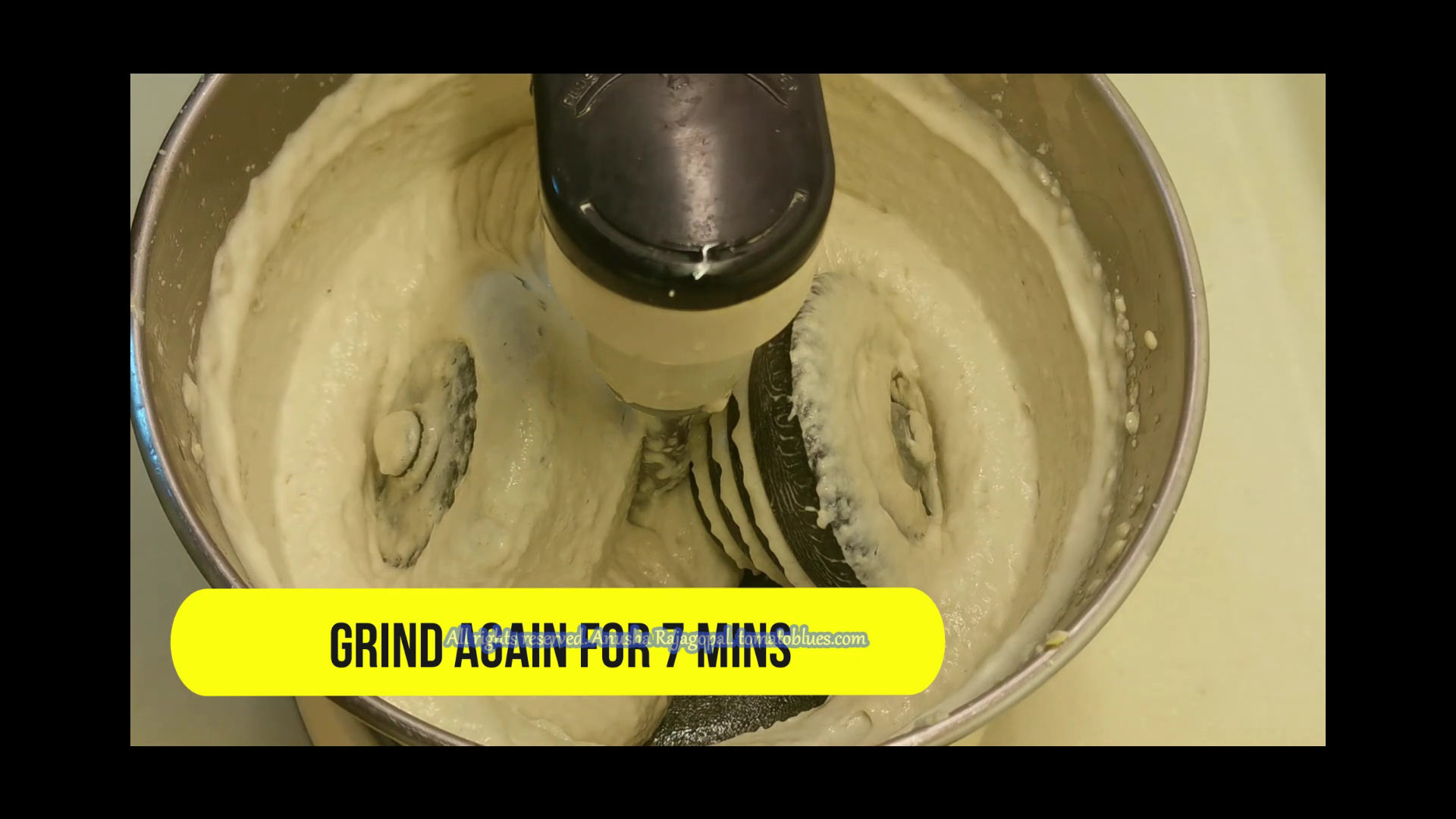 Stop, scrape down the sides, add 1/2 c more water for grind for another 6 to 7 mins. Again stop, scrape down the sides, add 1/2 c to 3/4 c water and continue to grind for 7 mins. By now, our urad dal batter will resemble butter in texture. This s the right consistency.