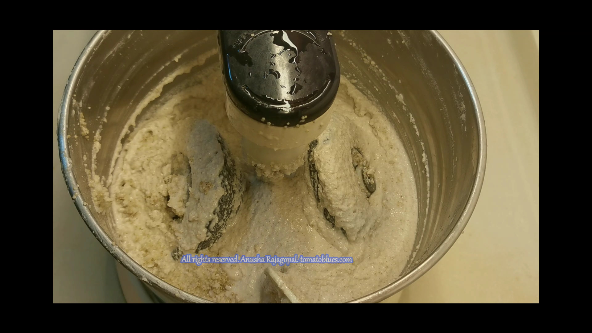 • Now, add the soaked urad and methi to the grinder along with 1/2 c water. Grind for 5 mins. Stop, scrape down the sides, add 1/2 c more water for grind for another 6 to 7 mins. Again stop, scrape down the sides, add 1/2 c to 3/4 c water and continue to grind for 7 mins. By now, our urad dal batter will resemble butter in texture. This s the right consistency.