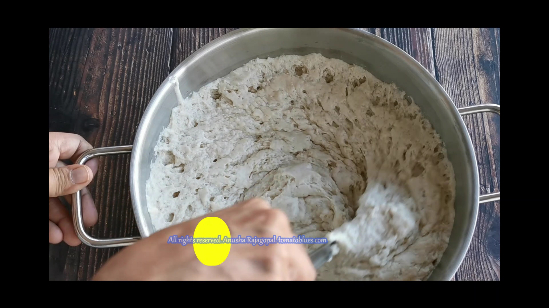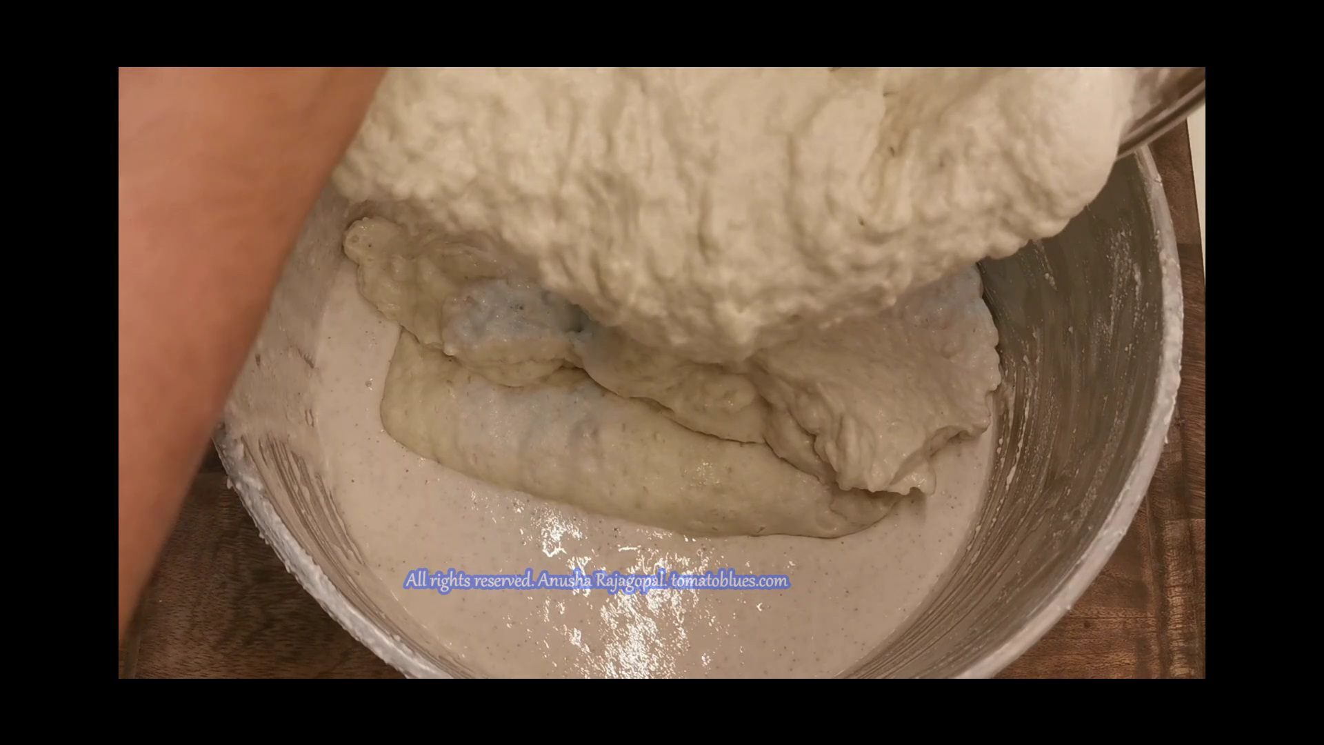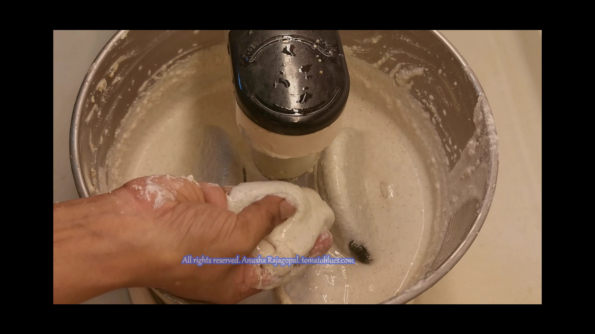 • Use your hands to mix urad dal batter and millet mixture. The good bacteria in your hands will help in better fermentation and the batter also will be evenly mixed. It s also easier to mix the batter using our hands. Make sure you wash your hands thoroughly before you do this.