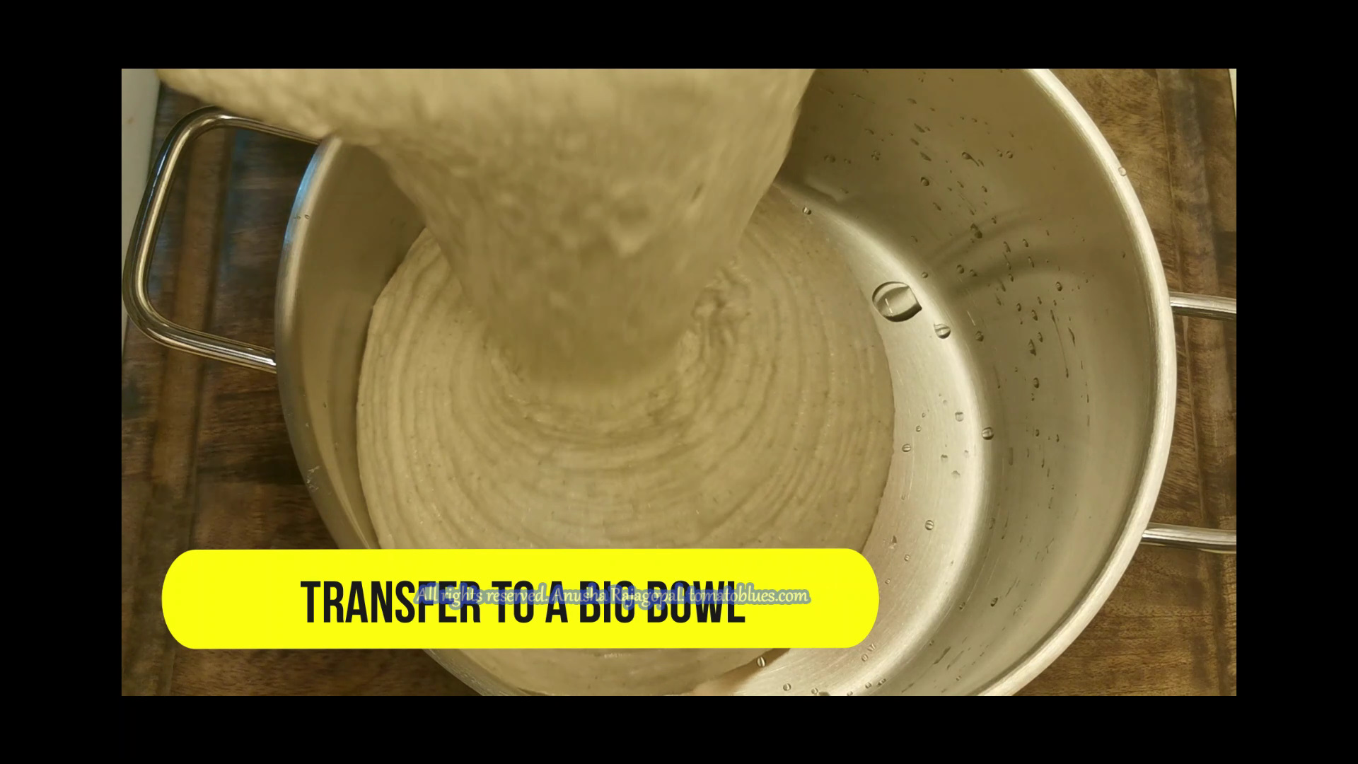 • Combine both the batters in a large bowl. The proportions used in this recipe yields 3 liters of batter approximately. So i have used a 6 liter capacity pot to store my batter.