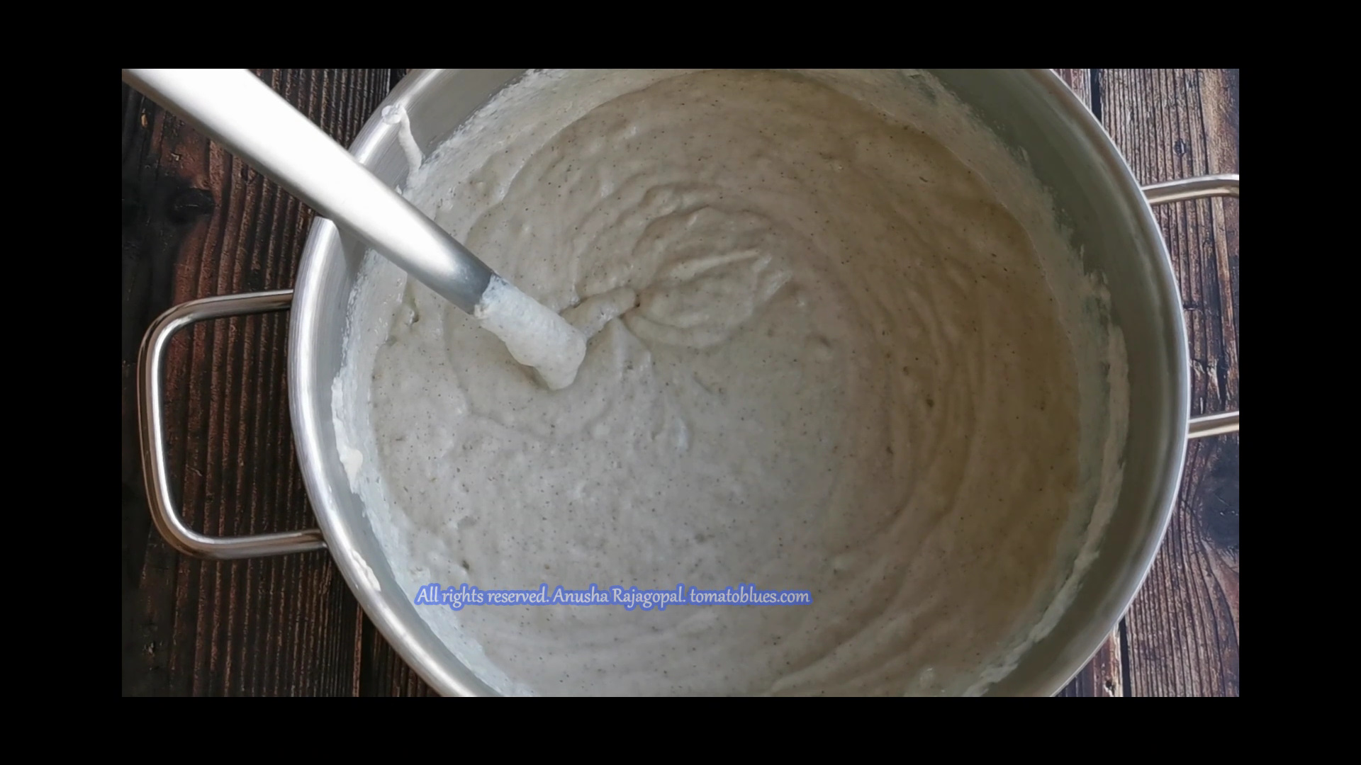 • Now, mix the batter well using a ladle. You can see that the batter is aerated and has many bubbles while mixing.