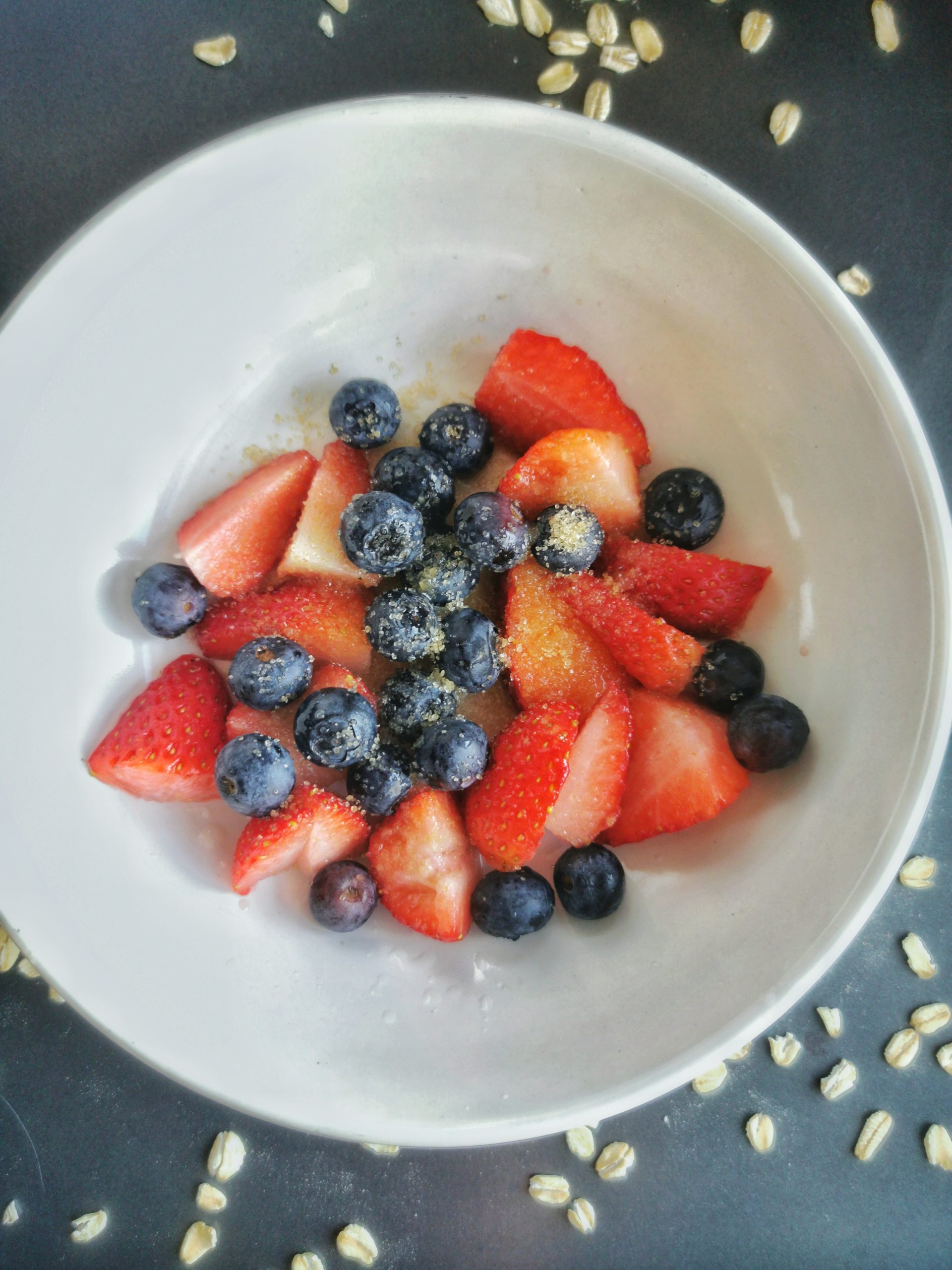 - Add the chopped strawberries and blueberries to a mixing bowl.