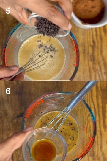 Tip in the coffee powder. Whisk rapidly until it is frothy. You can use an electric egg beater for this purpose. Even a coffee frother will work well here. Tip in the vanilla, mix well and set aside.