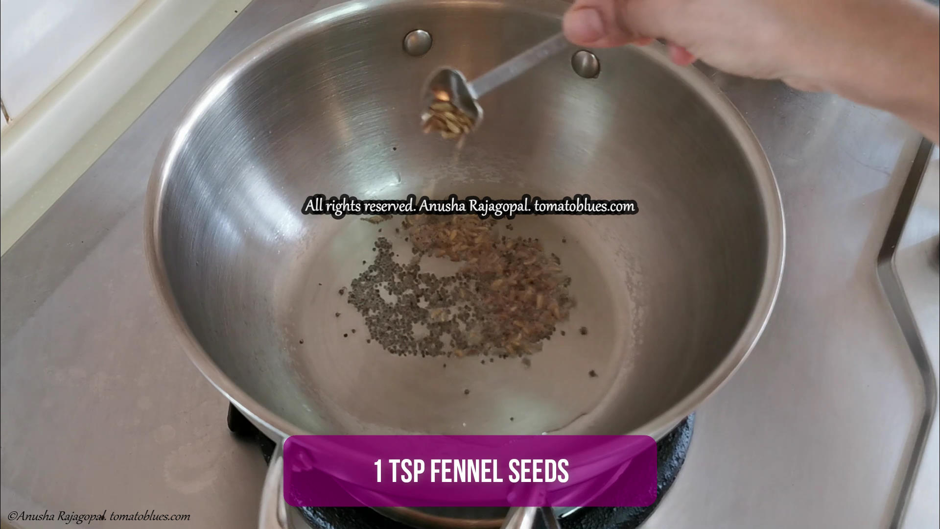 Heat a pan with oil. Add the mustard seeds and when they begin popping, add the fennel seeds.