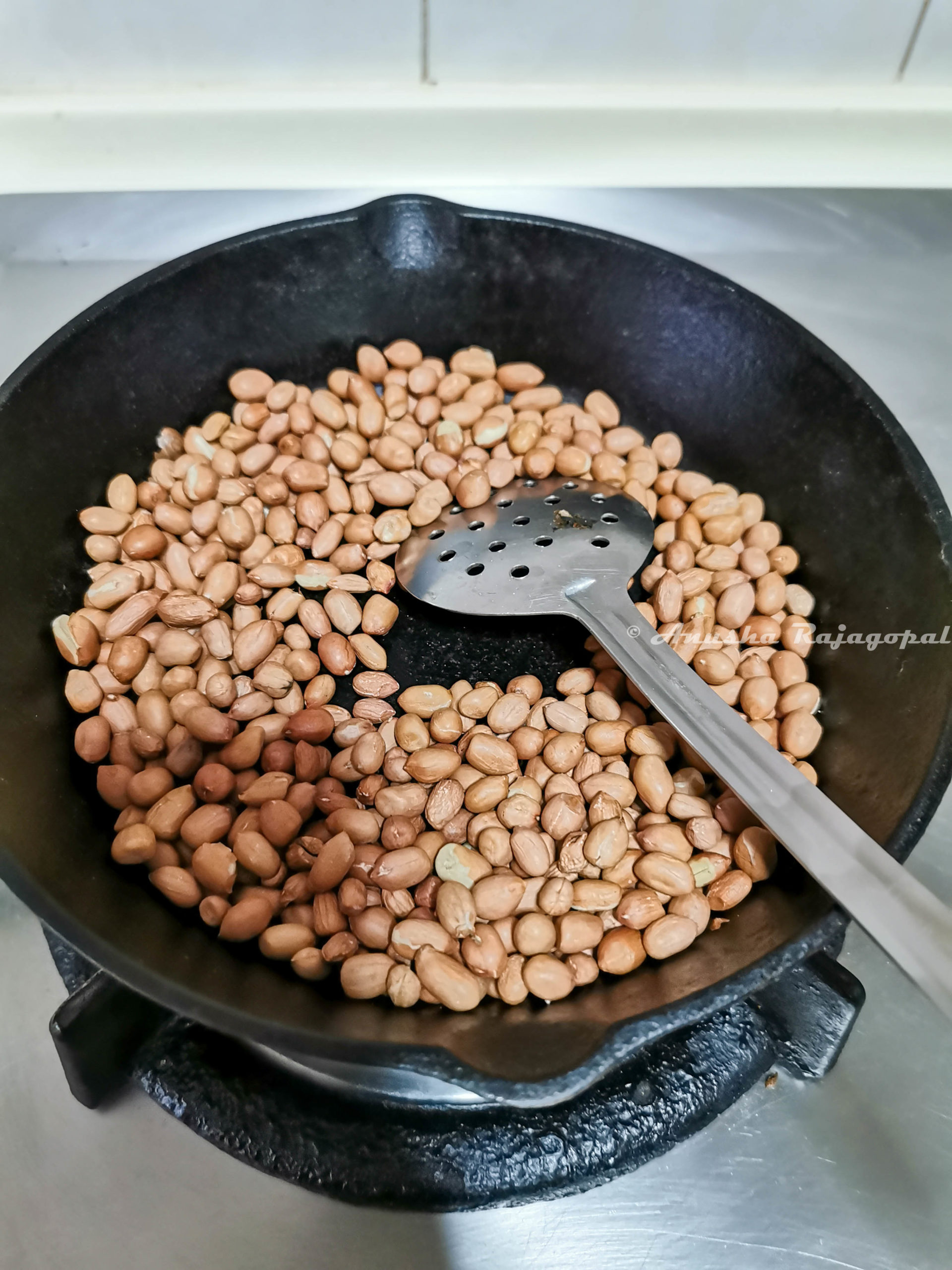 Pro Tip: Use a cast iron pan to roast your groundnuts on stove-top. You can also use the oven to roast them. If roasting a large batch, then place them in a single layer on a cookie tray and roast them in a preheated oven for 8 to 10 mins at 200C. Make sure you stop midway, shake them up well and proceed roasting.