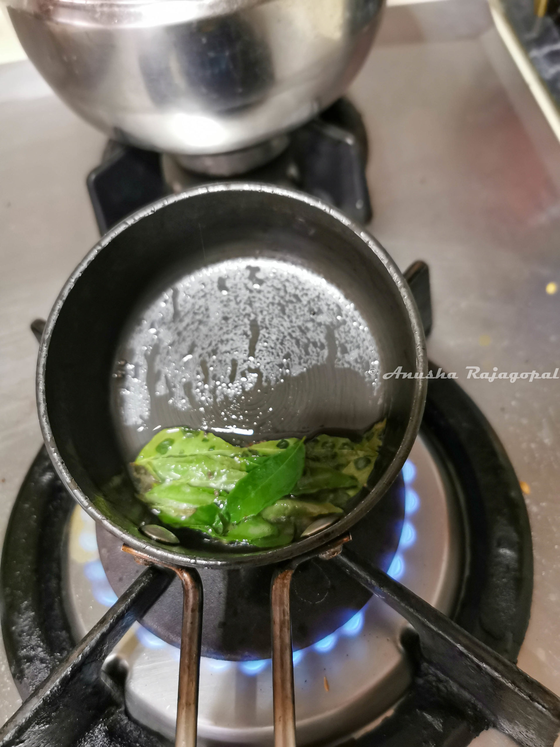 Now for the aromatics part. Heat a small pan. Add the oil for tempering. Once the oil has heated up, add the mustard seeds and wait for them to splutter., tip in the urad dal and add curry leaves. Allow the dal to become a golden brown.