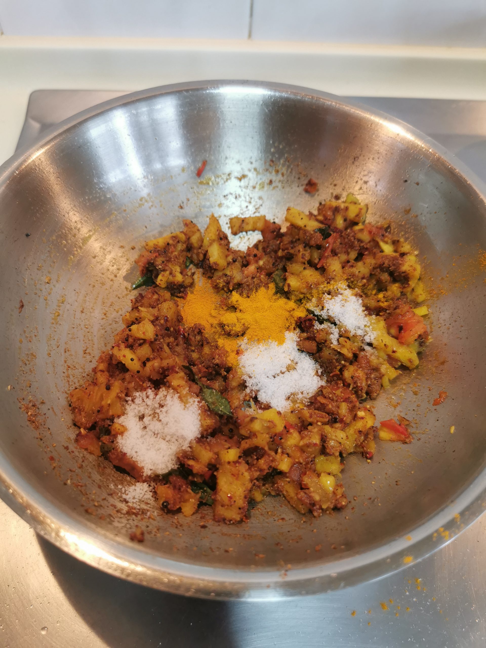 - Now, add the finely chopped pineapple chunks ,curry leaves and tomatoes.