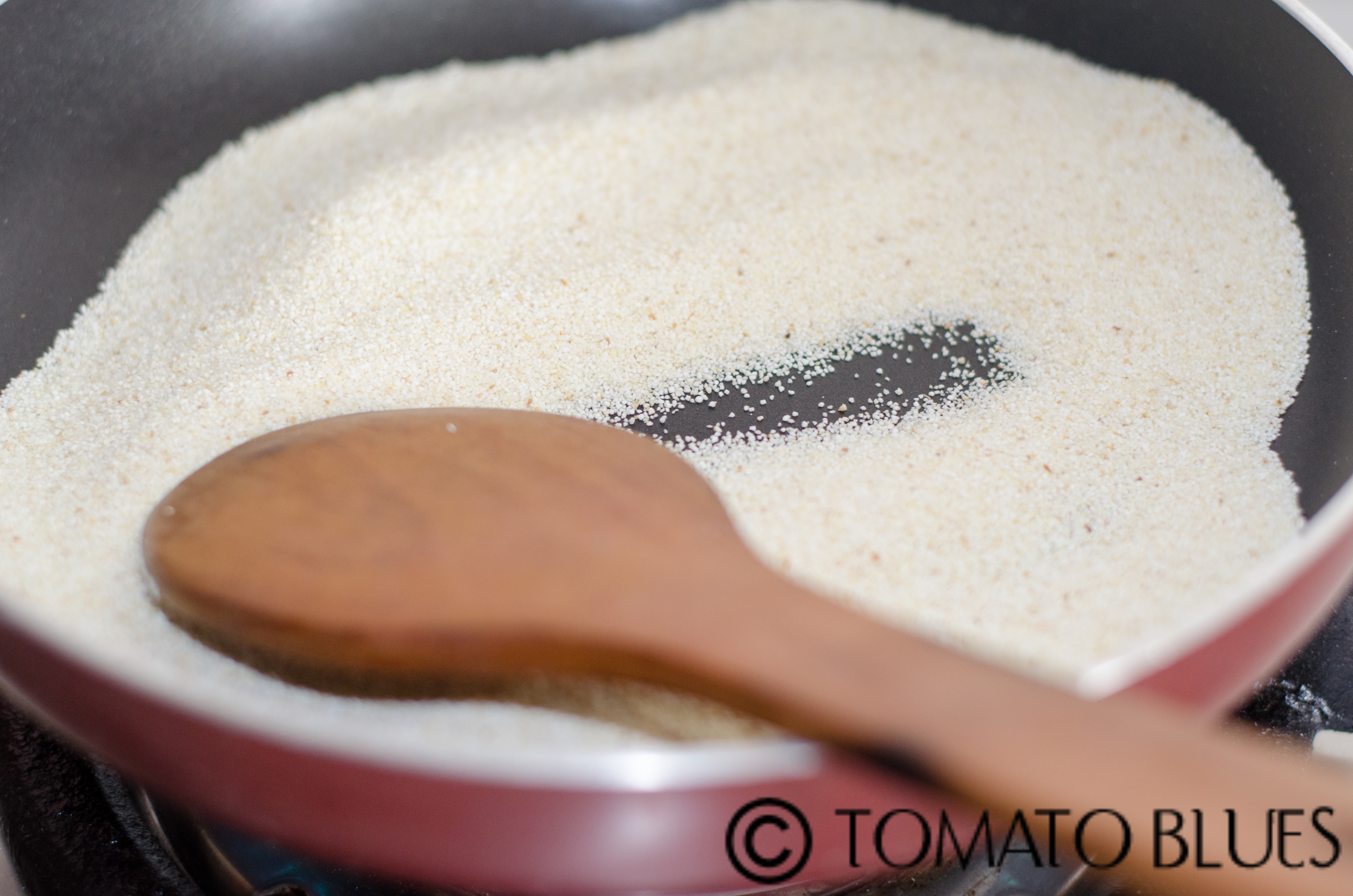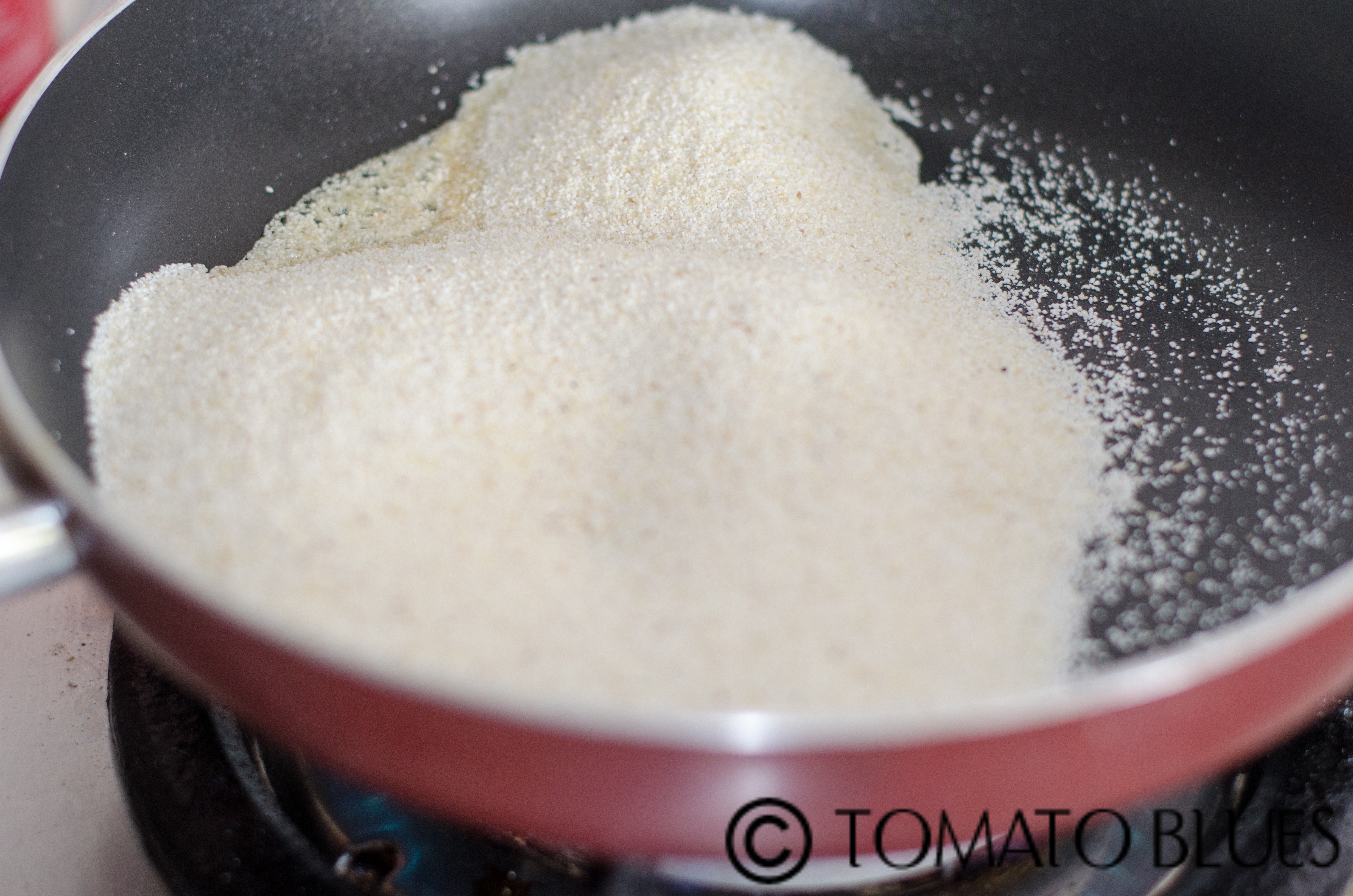 - Dry roast the sooji in a pan until aromatic and light brown. Takes about 5 to 7 mins