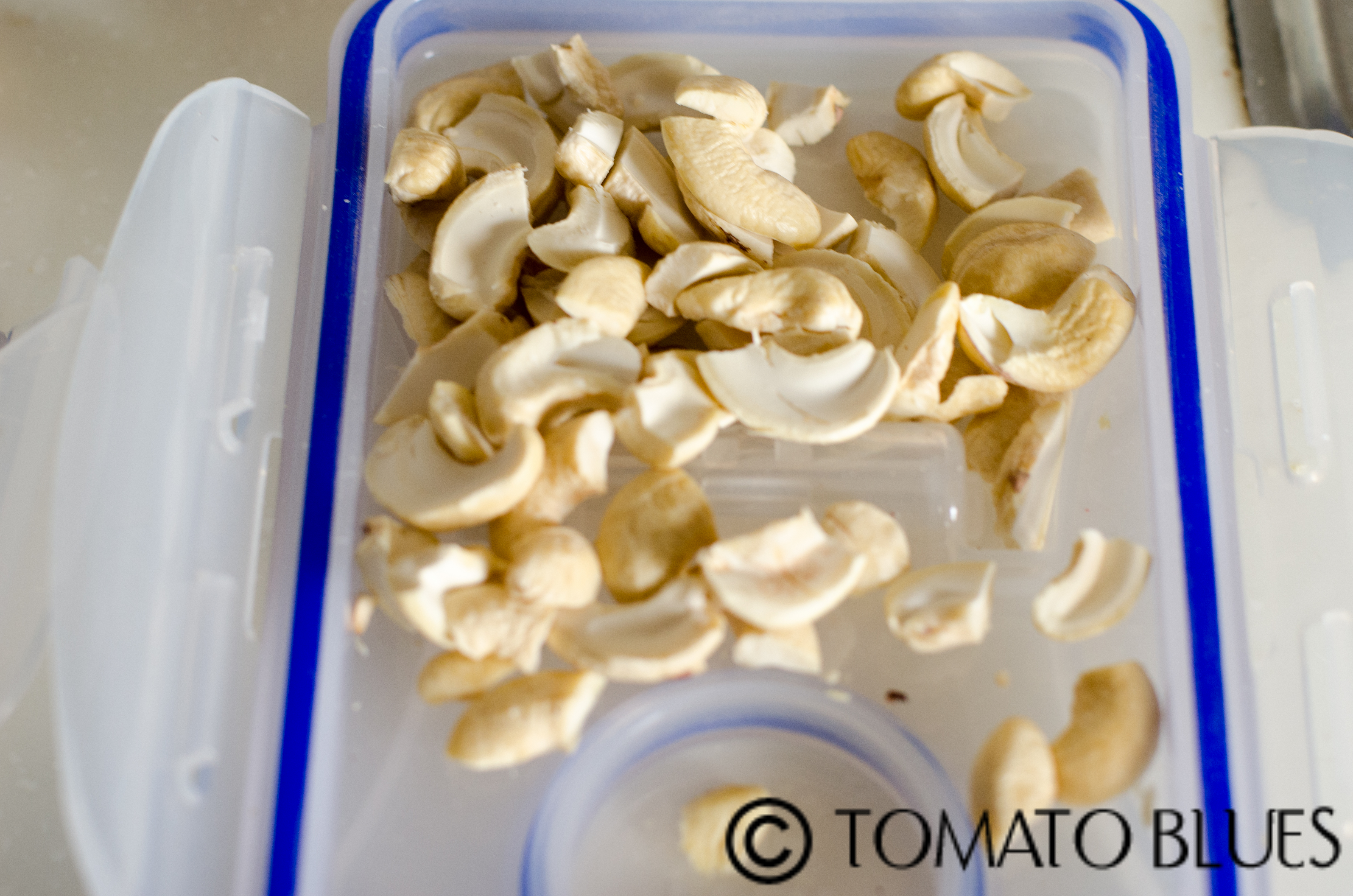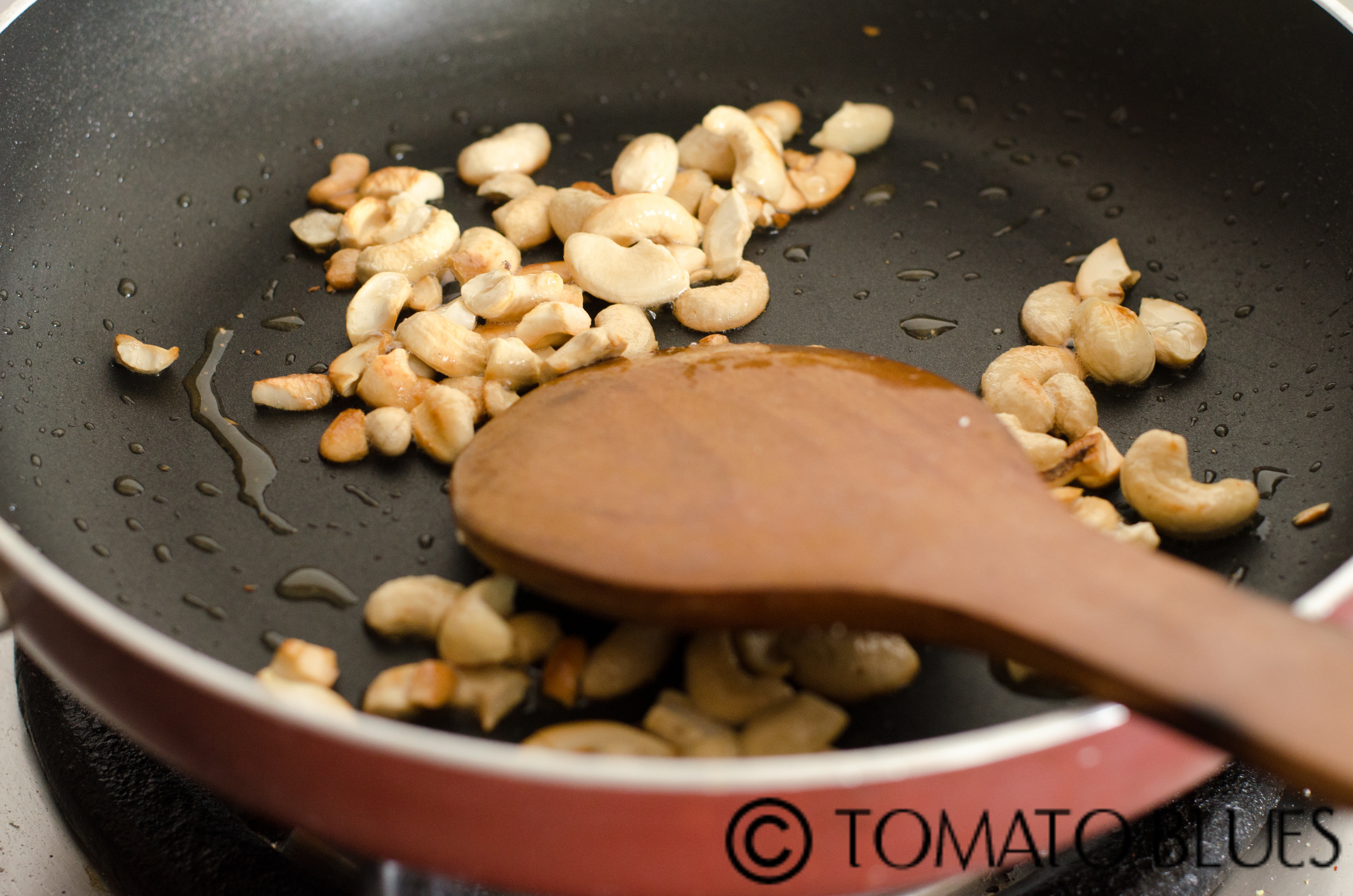 - In the meanwhile, add 1 tbsp of ghee in a pan and saute the cashews until light brown.