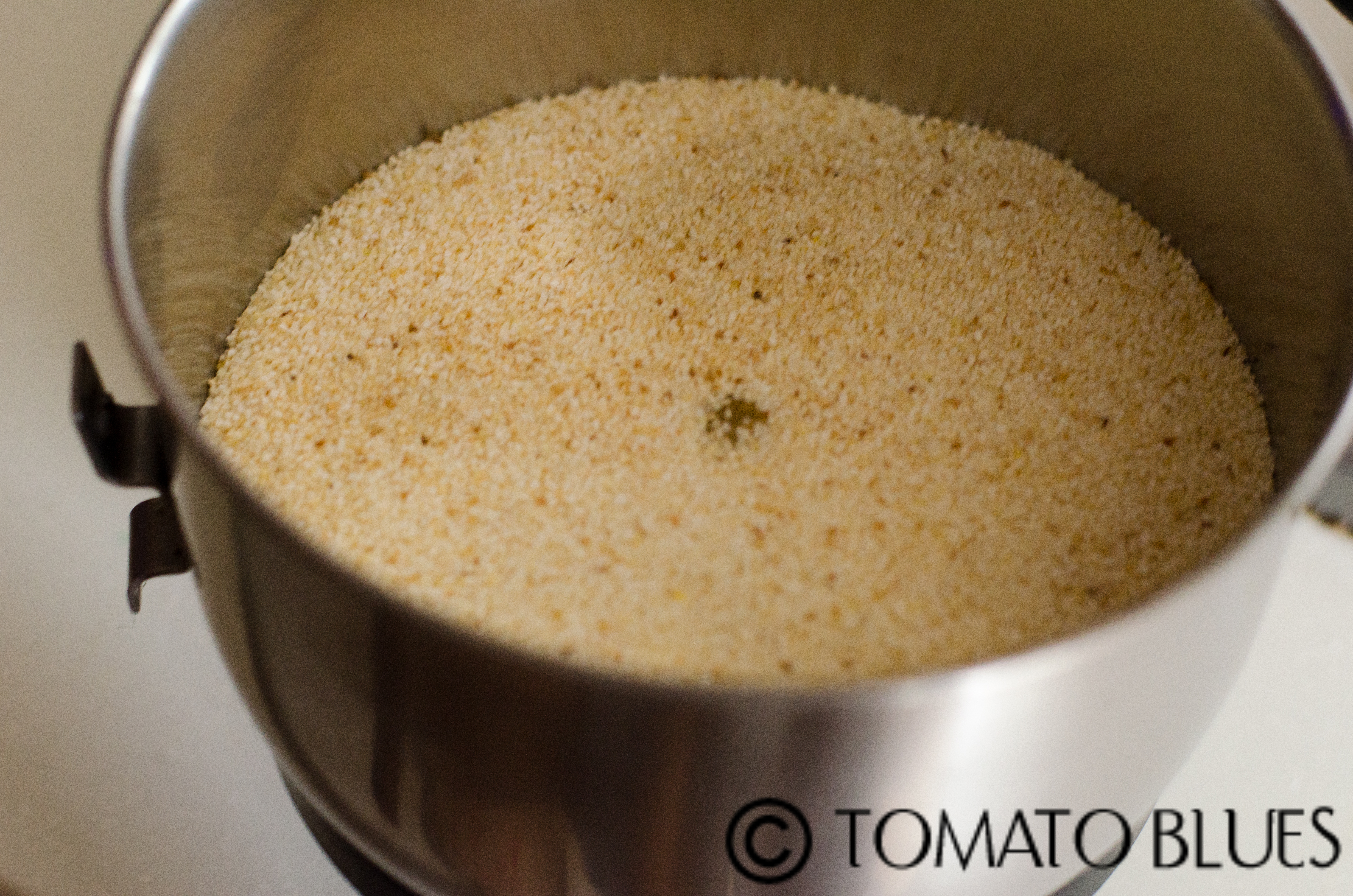 - In a mixer, powder the rava to a not very coarse powder. Do this in 2 batches.