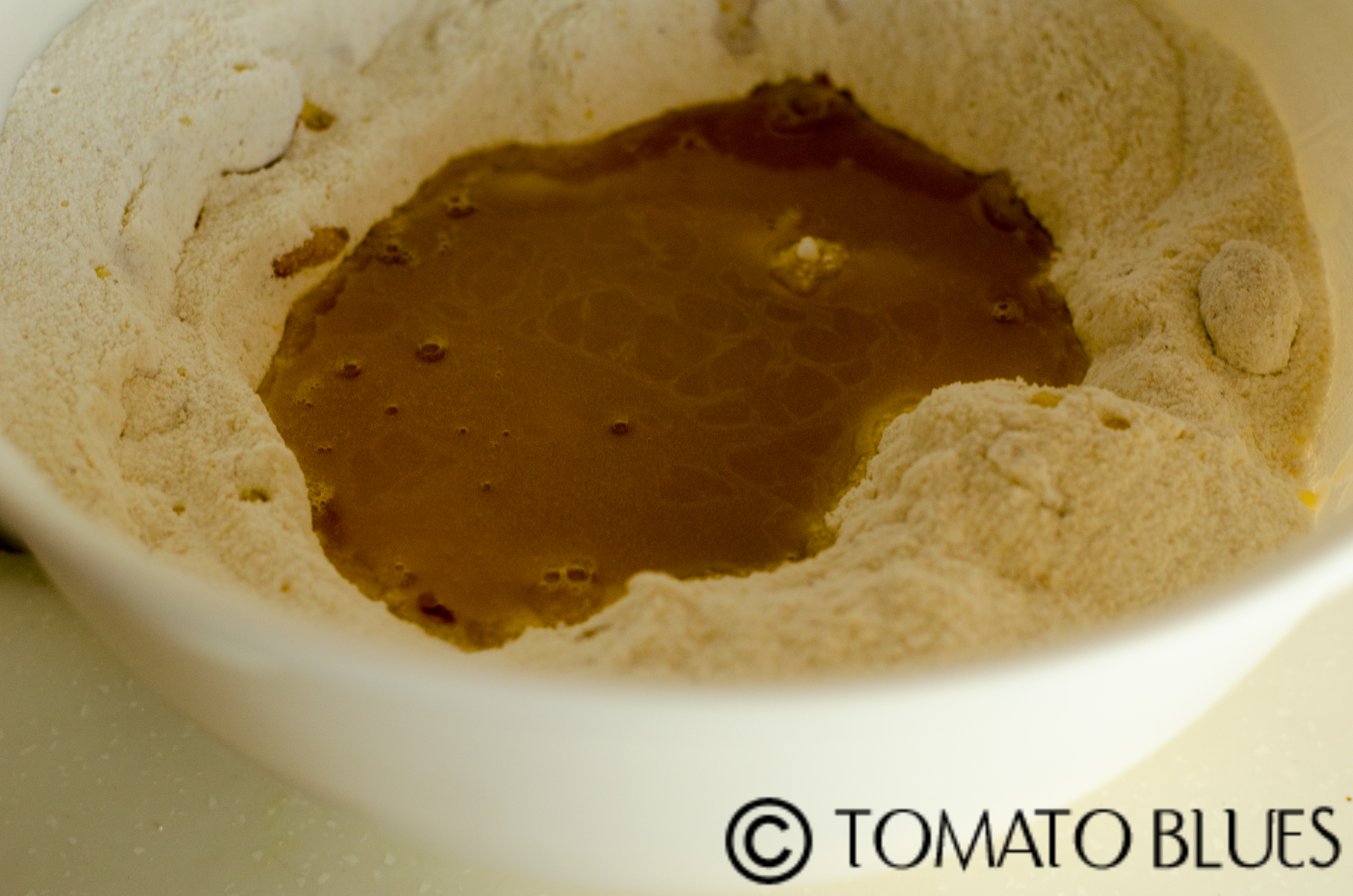 Now, powder the sugar along with the cardamom pods to a fine powder. Add this to a large mixing bowl along with the powdered semolina. Mix well using a wooden spatula.