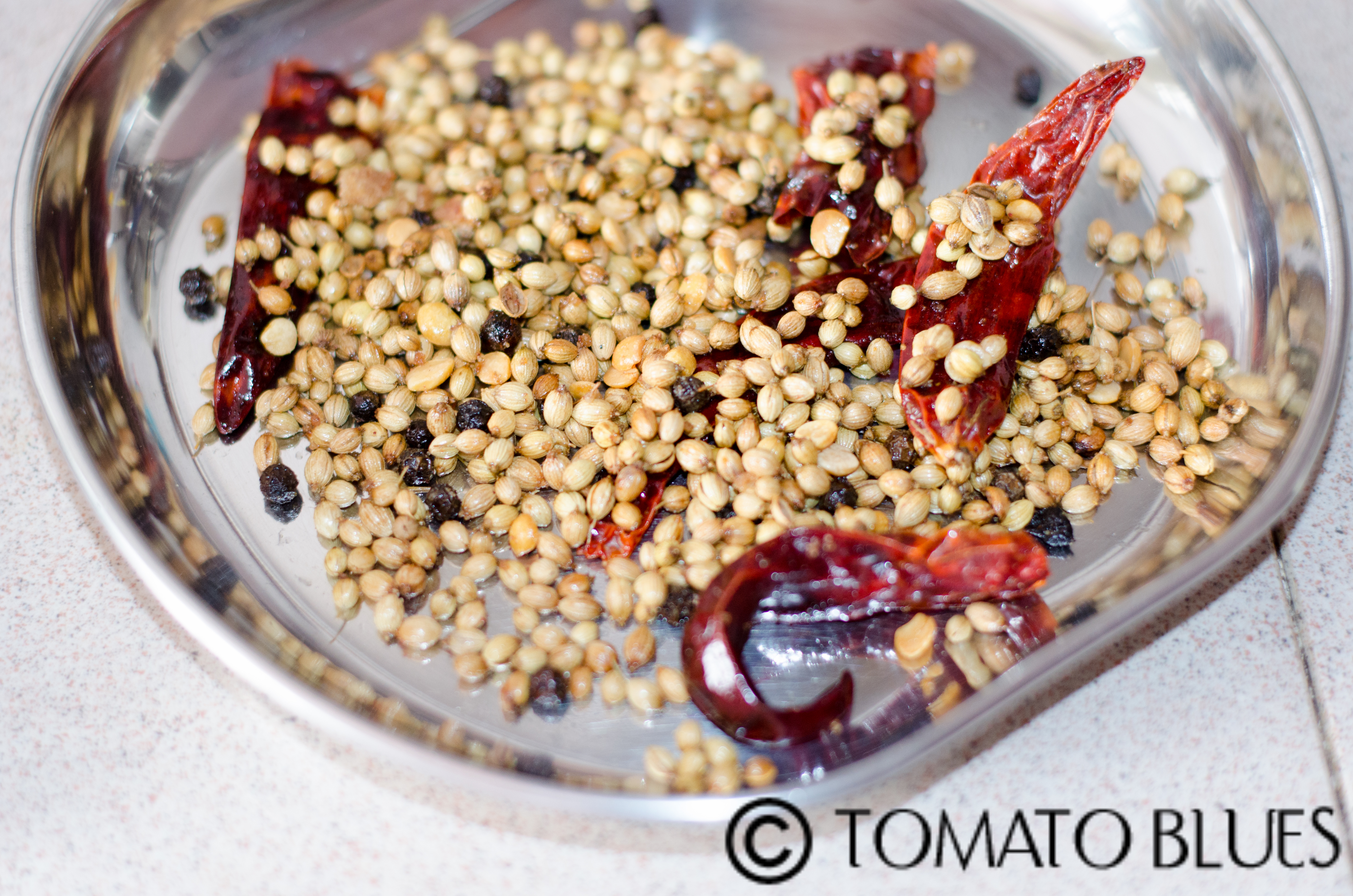 - Fry coriander seeds, cumin, peppercorns and dry red chilies on medium flame till fragrant and golden.