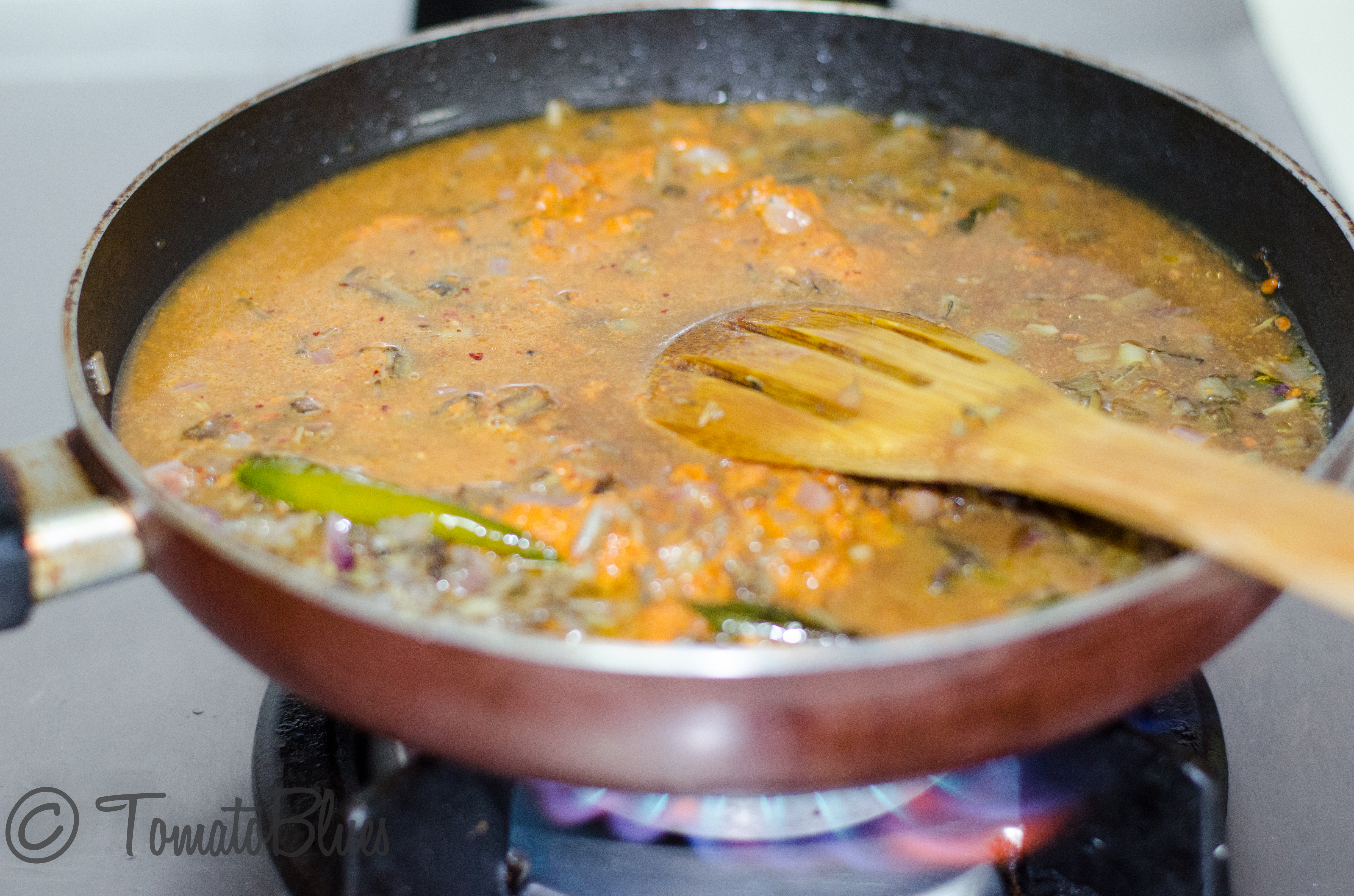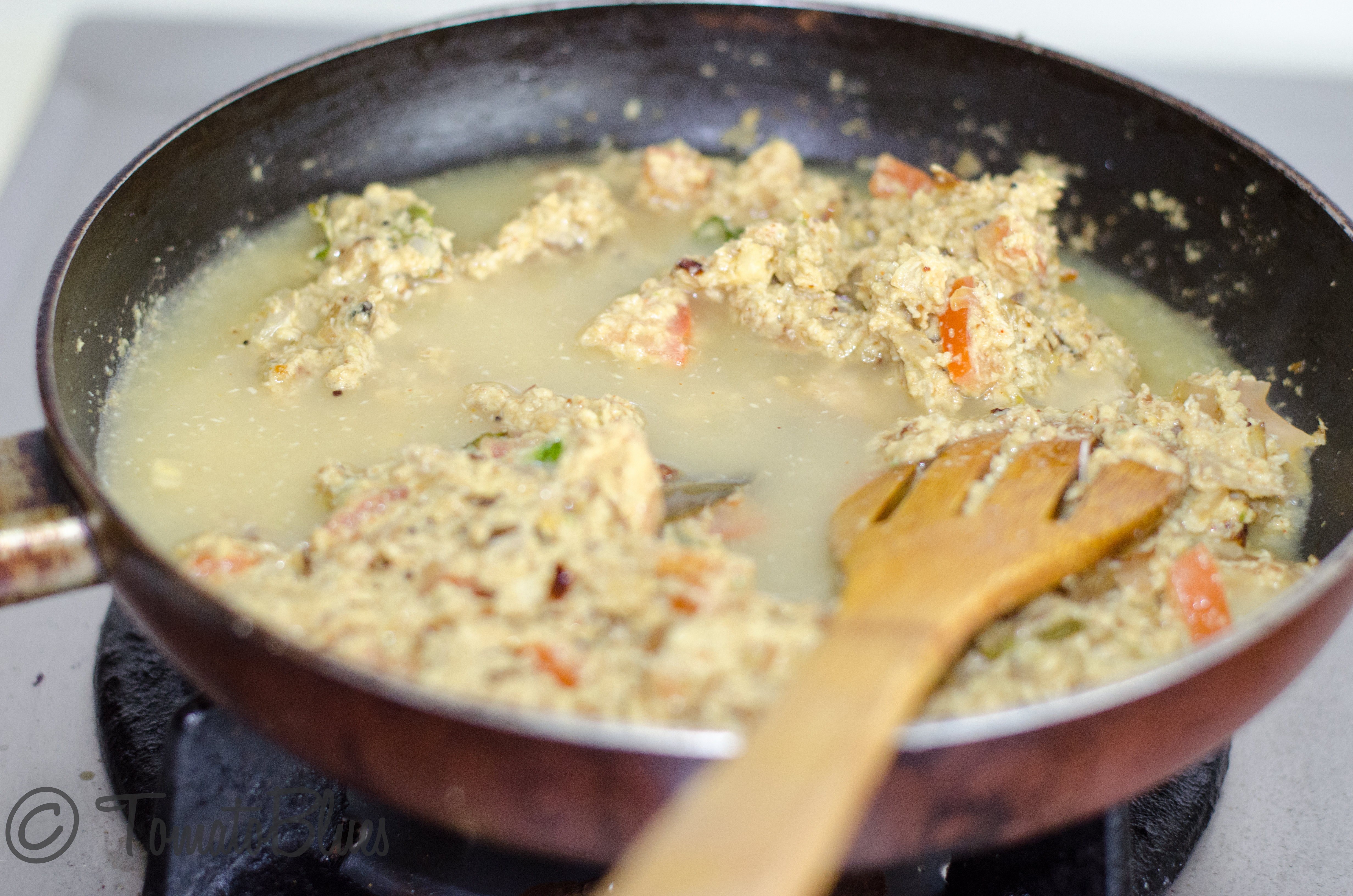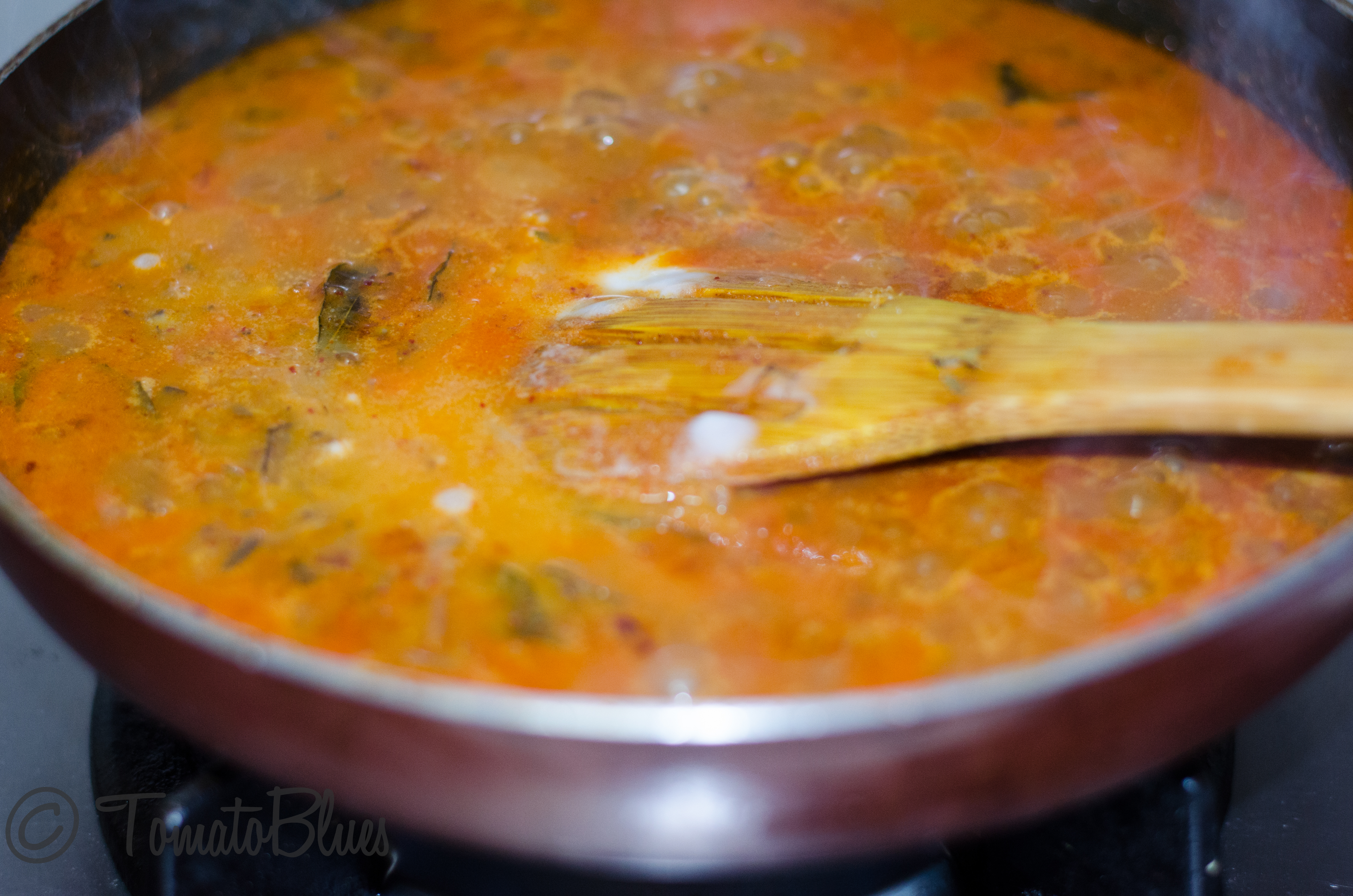 - Switch off the flame. Add the whisked yogurt. Mix well. Put it back on low flame, simmer for 30 secs. Switch off immediately. Do not simmer the mixture for a long time after adding the yogurt.