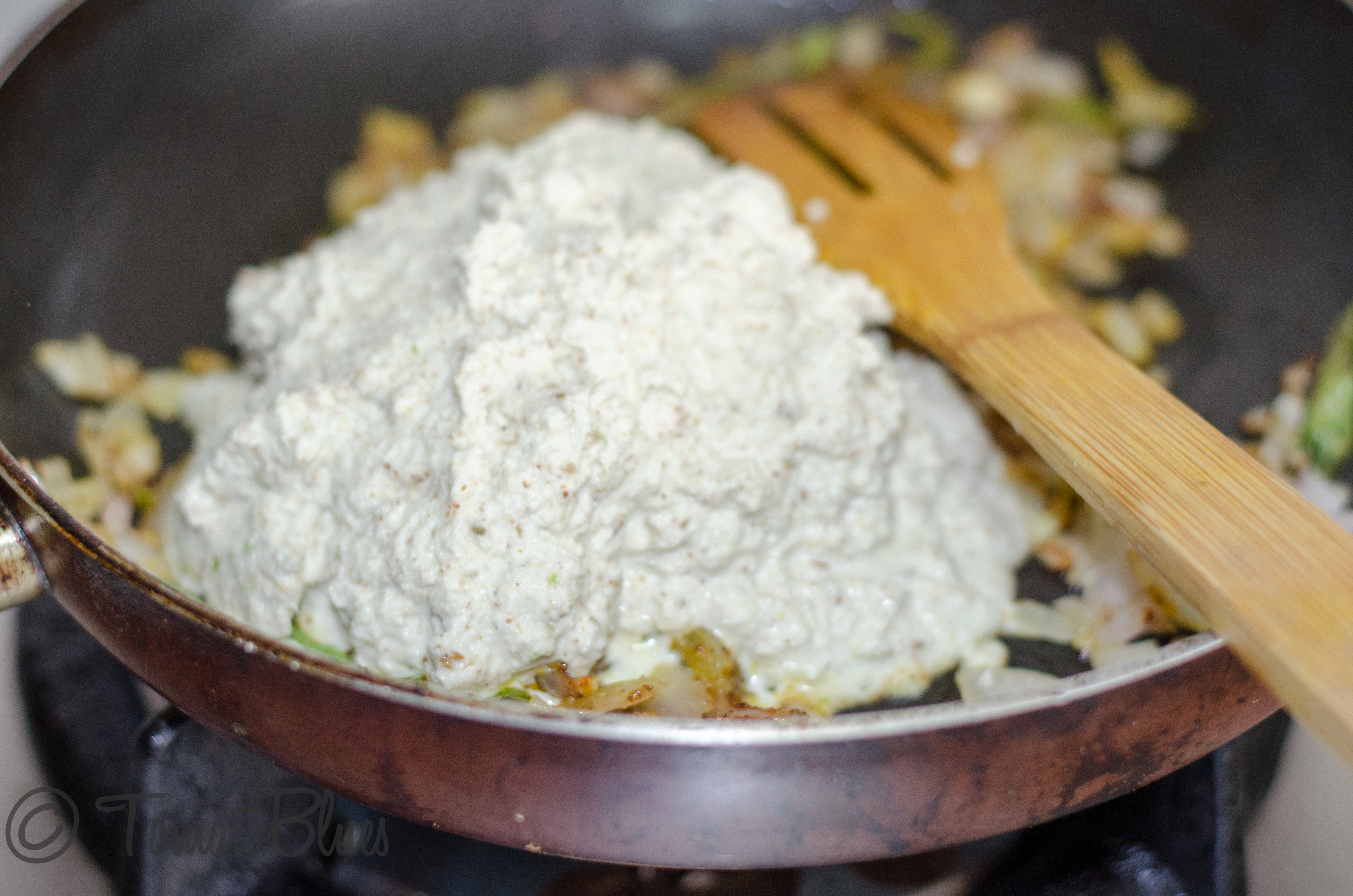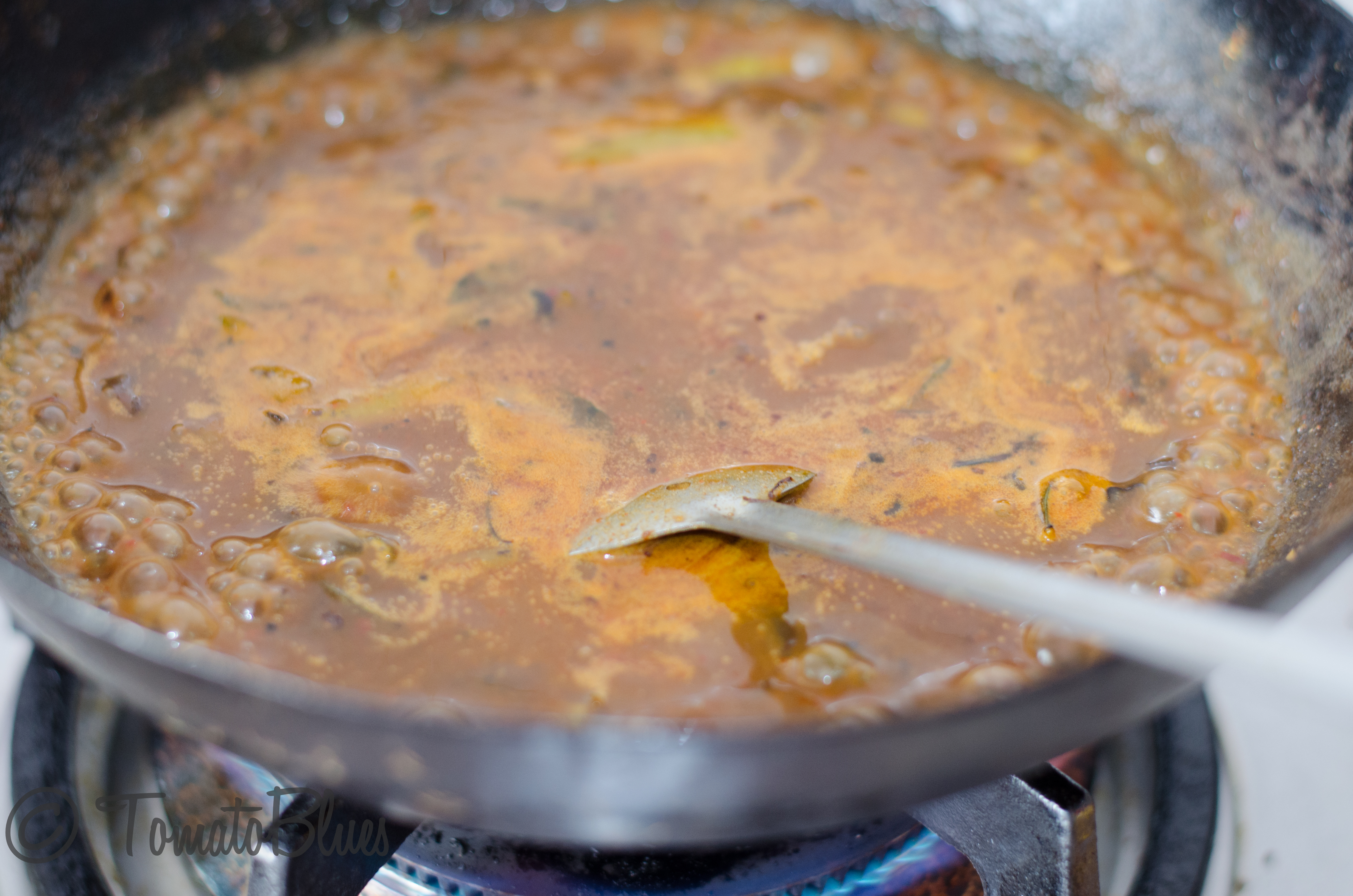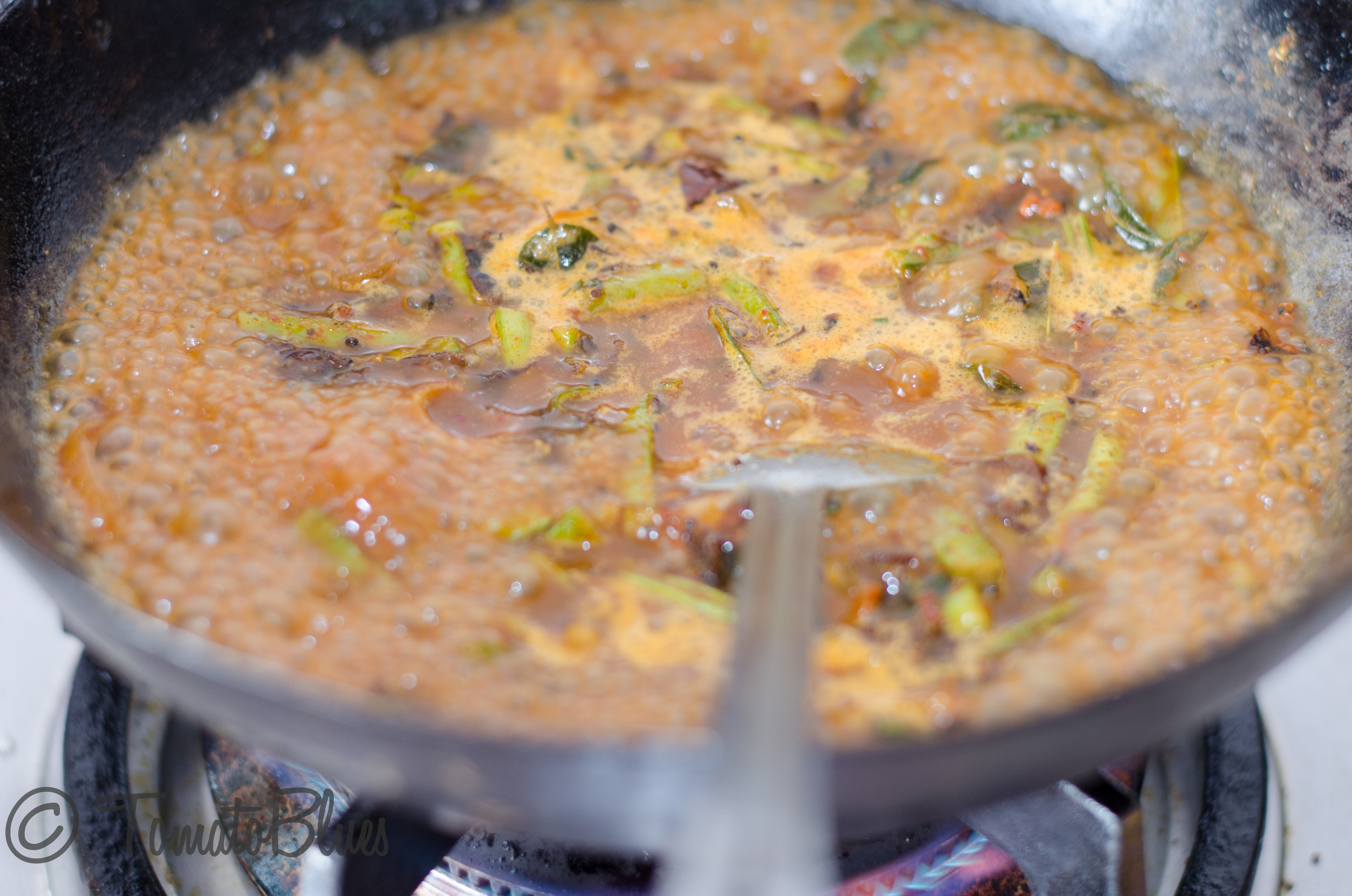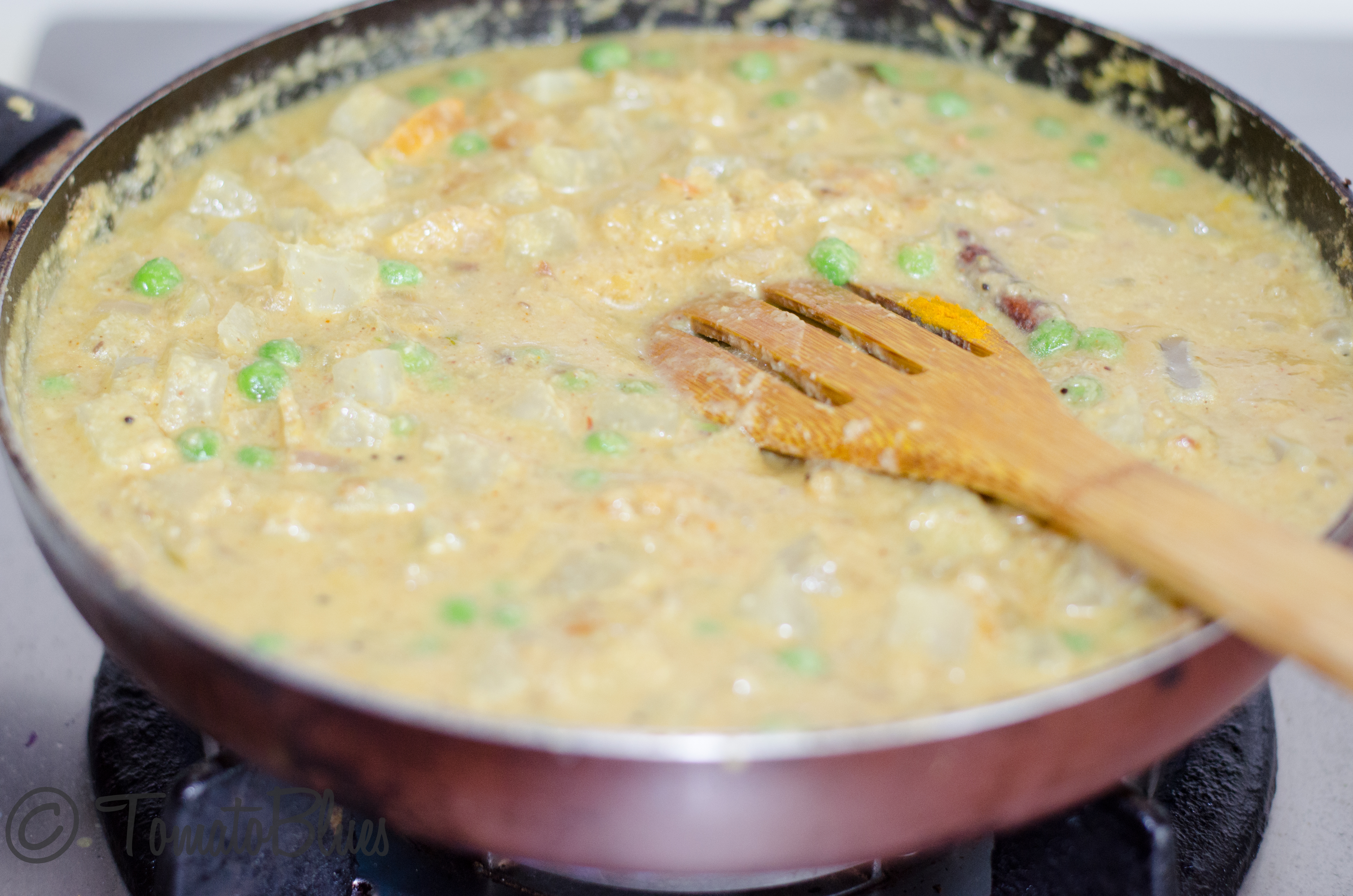 - Switch off the flame. Add the whisked yogurt. Mix well. Put it back on low flame, simmer for 30 secs. Switch off immediately. Do not simmer the mixture for a long time after adding the yogurt.