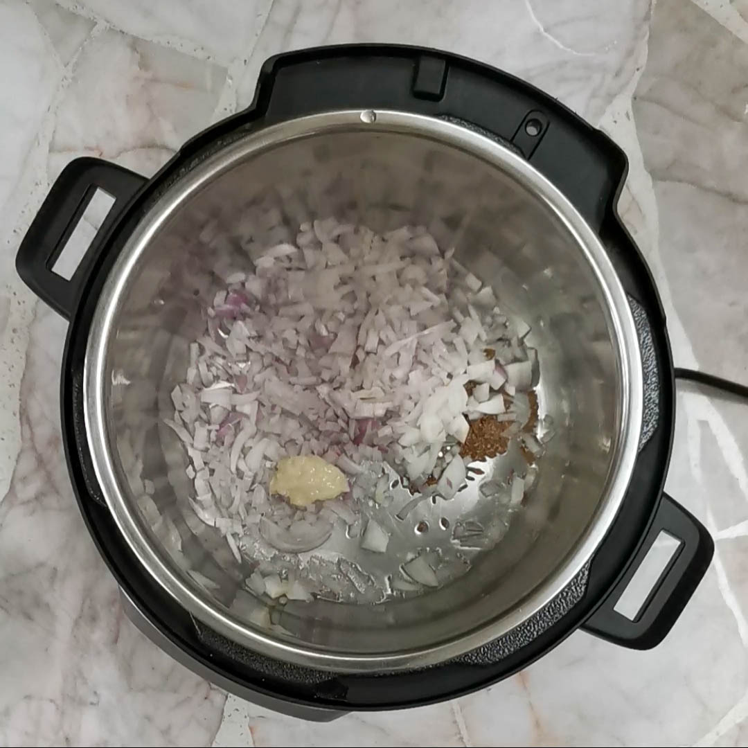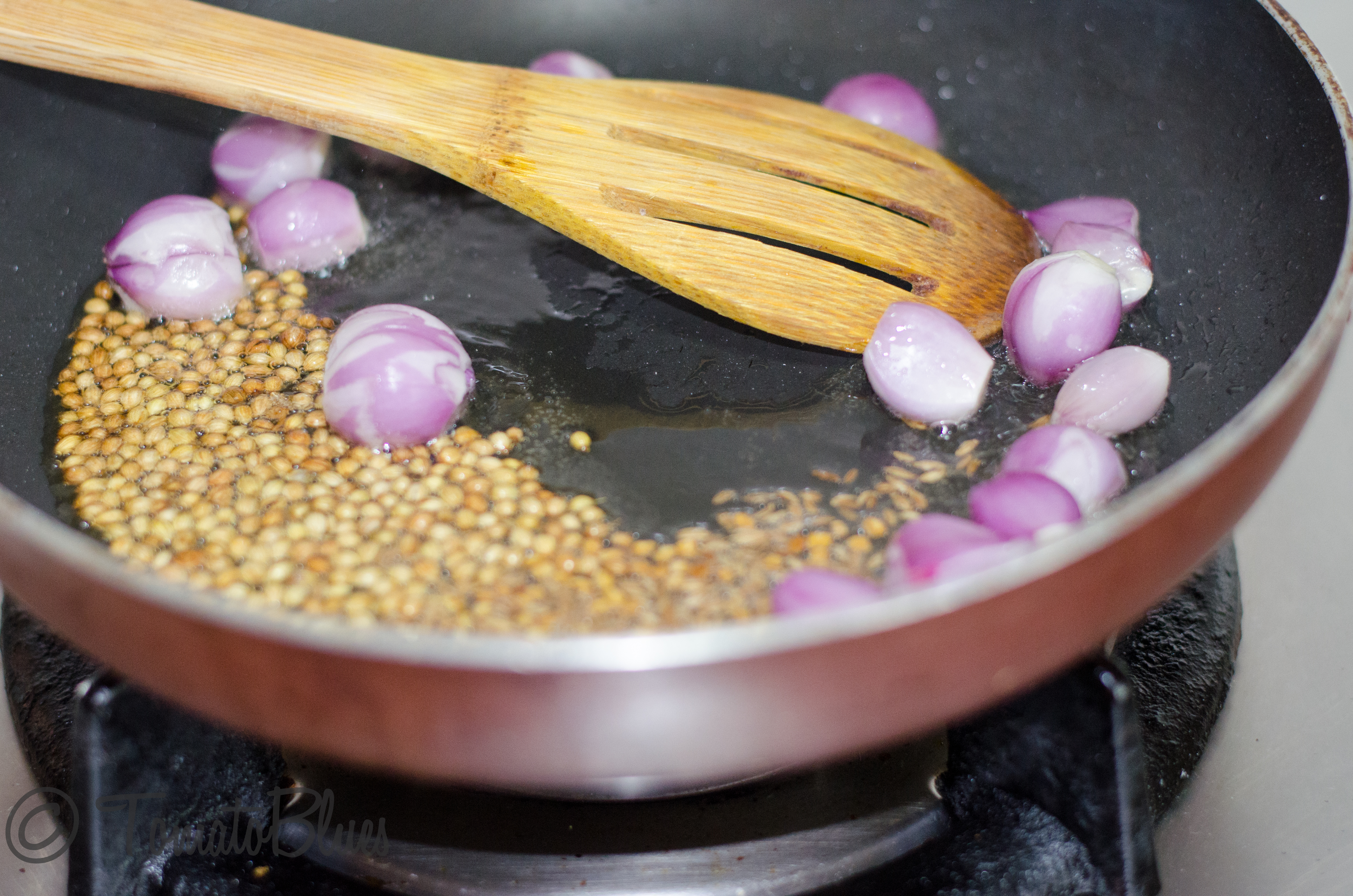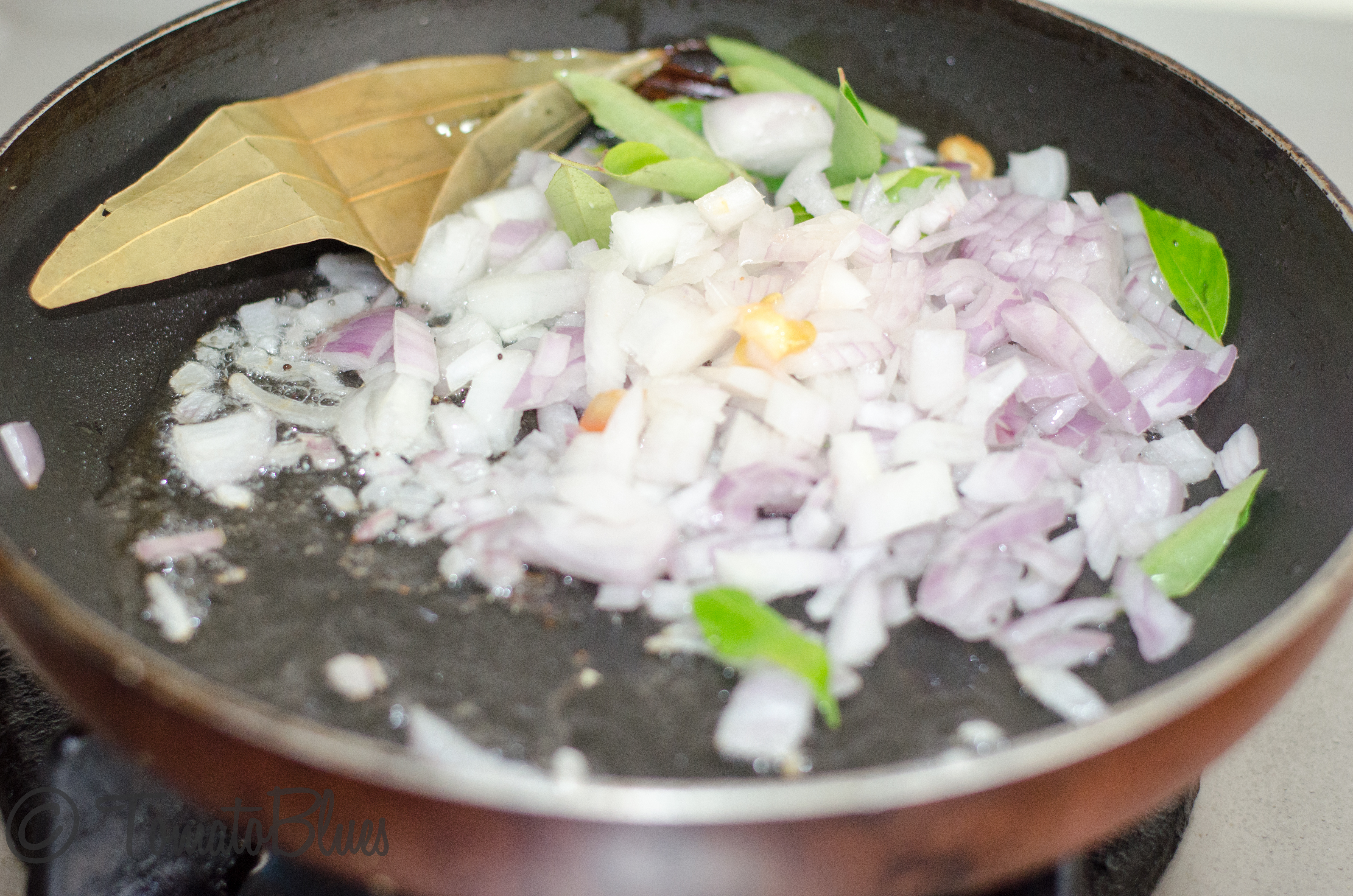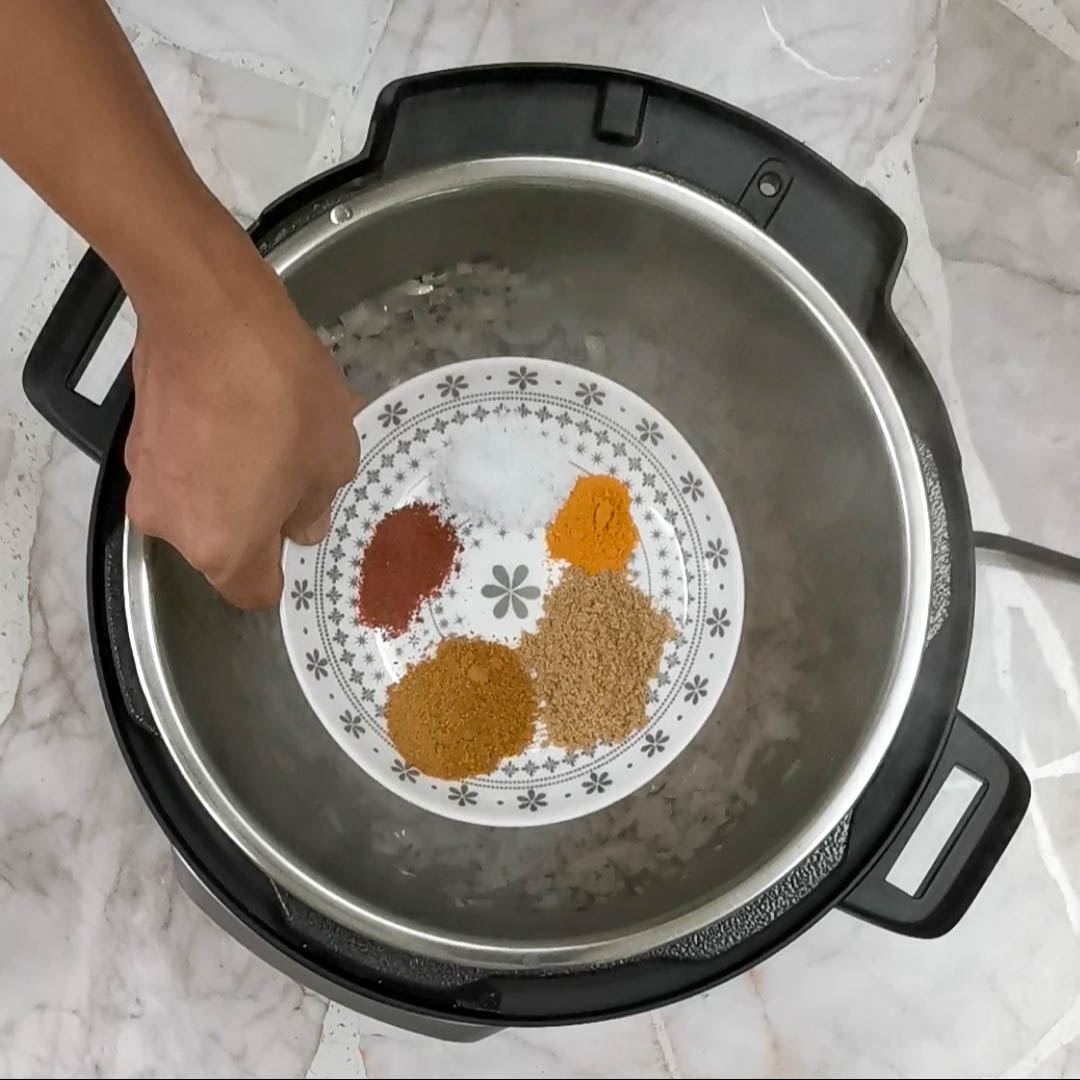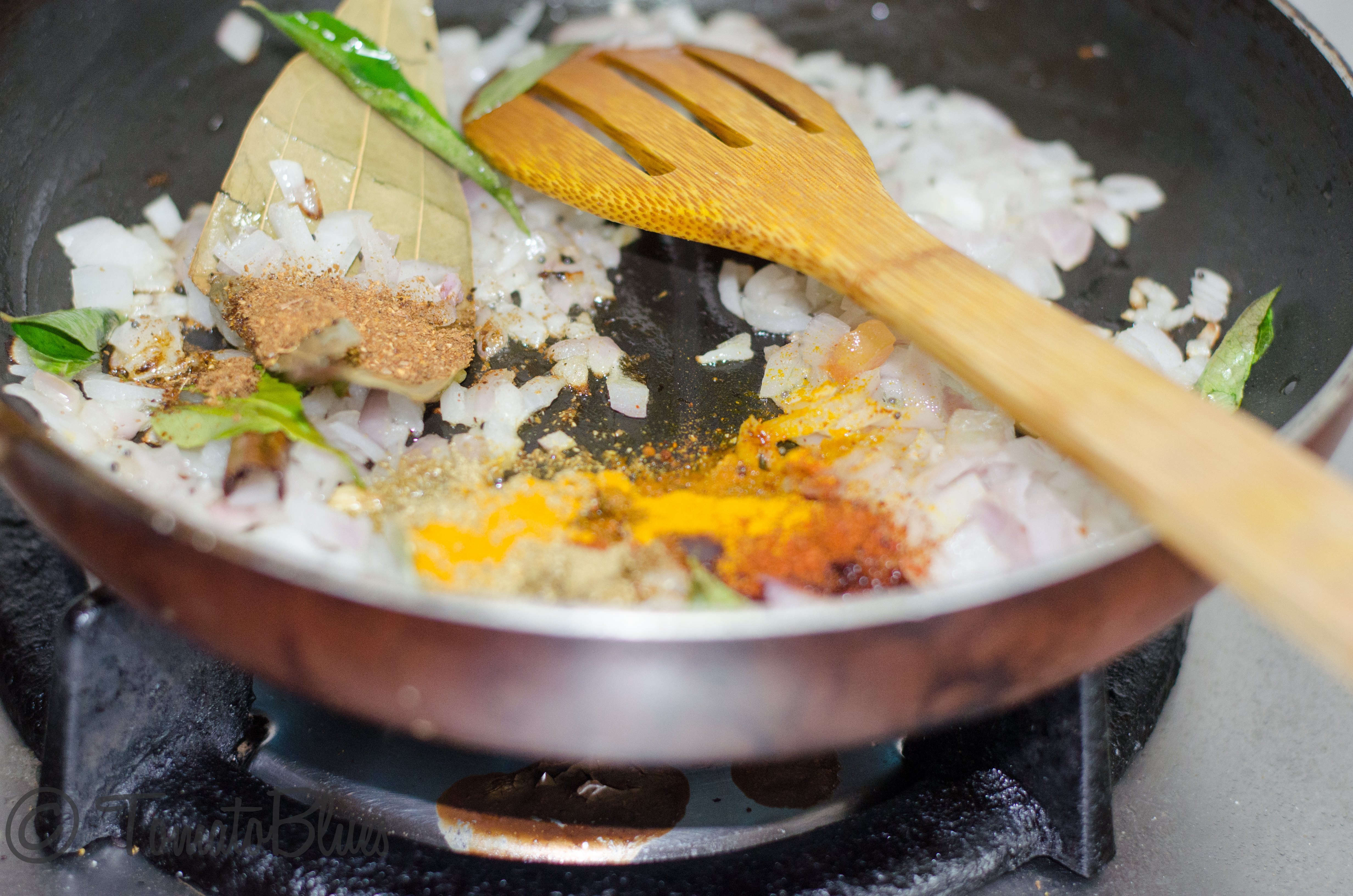 - In a kadai, heat oil. Add the onions and saute them till light brown. Now, add all the spice powders along with the turmeric powder and combine well.
