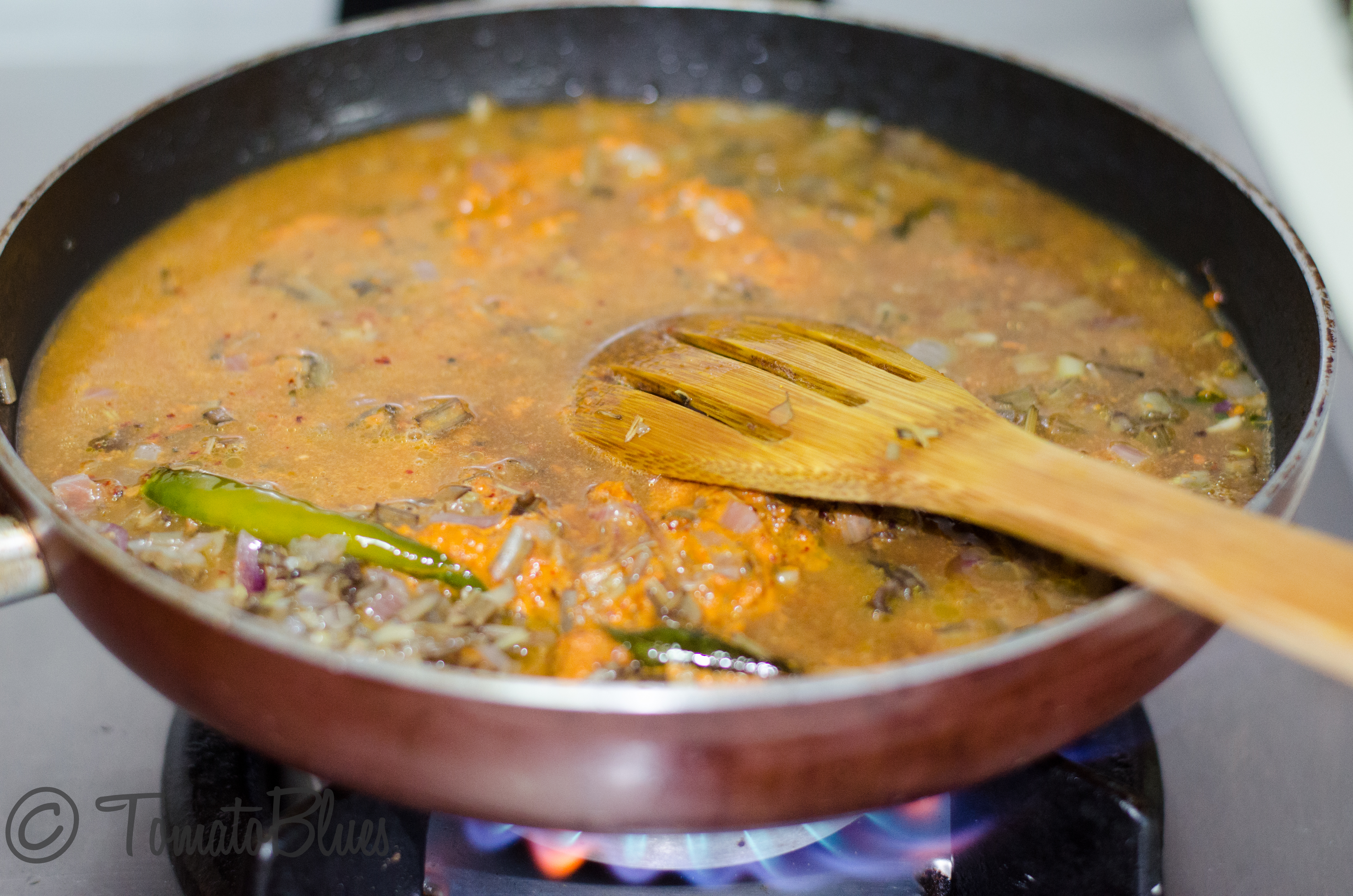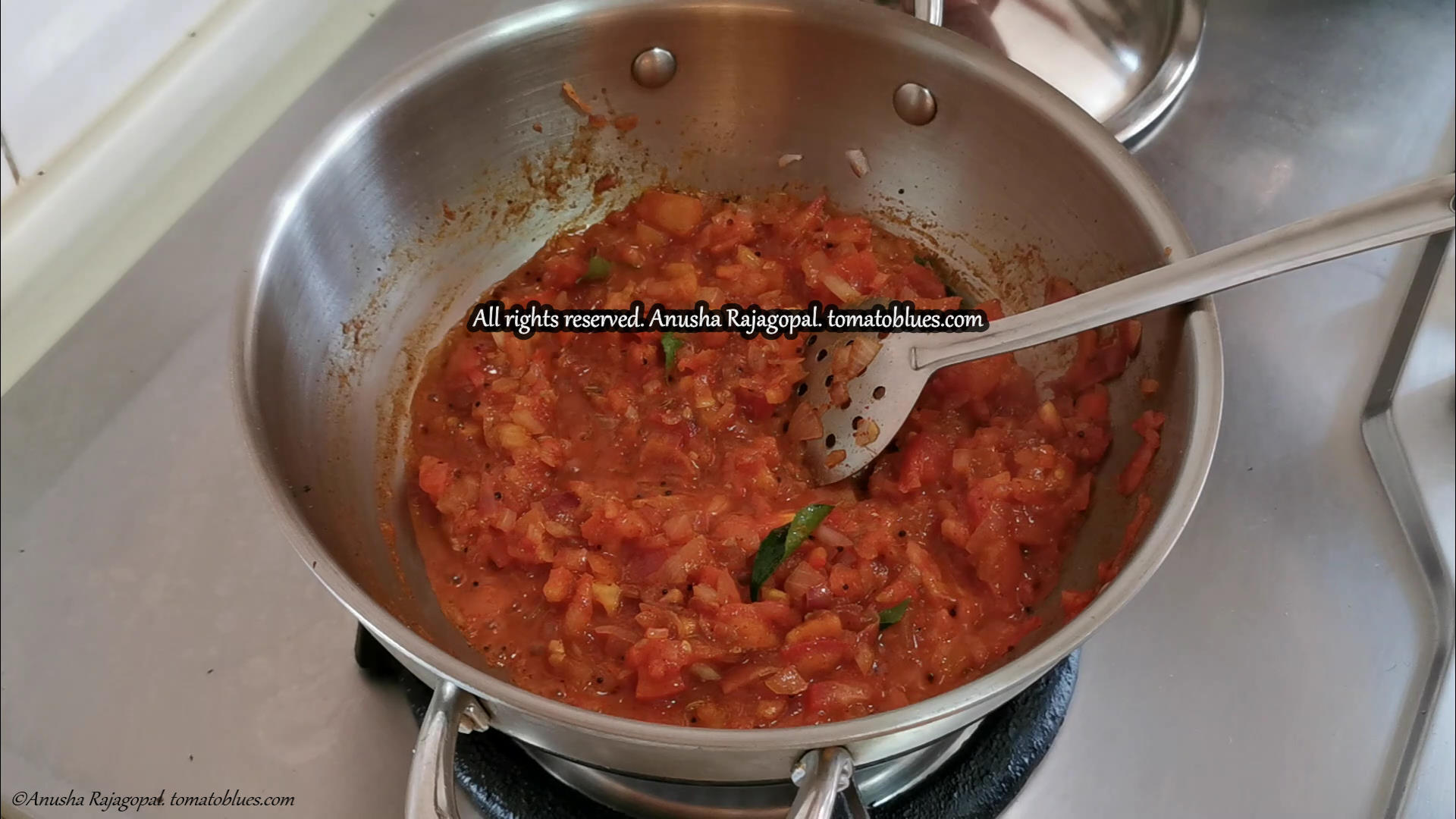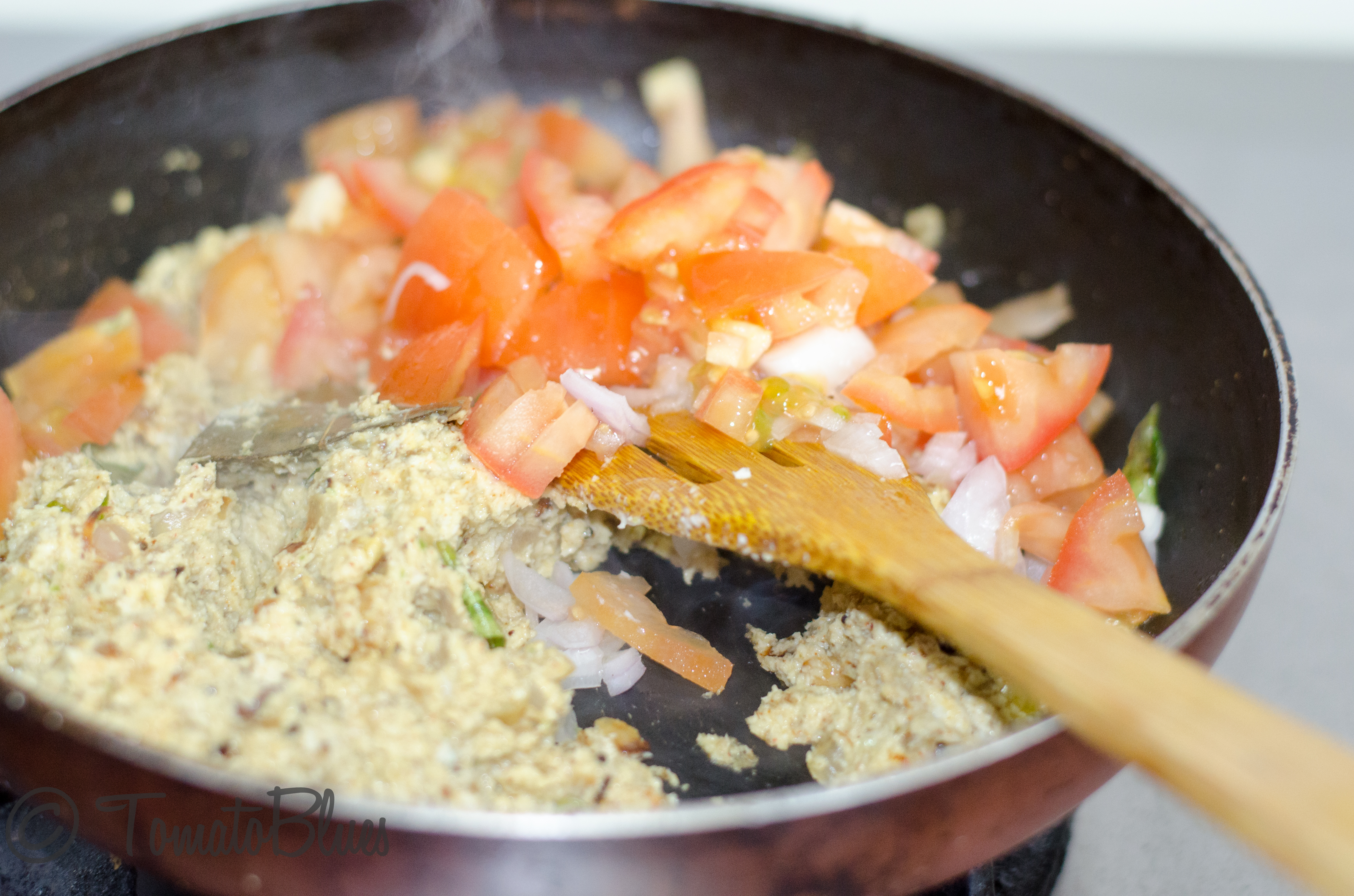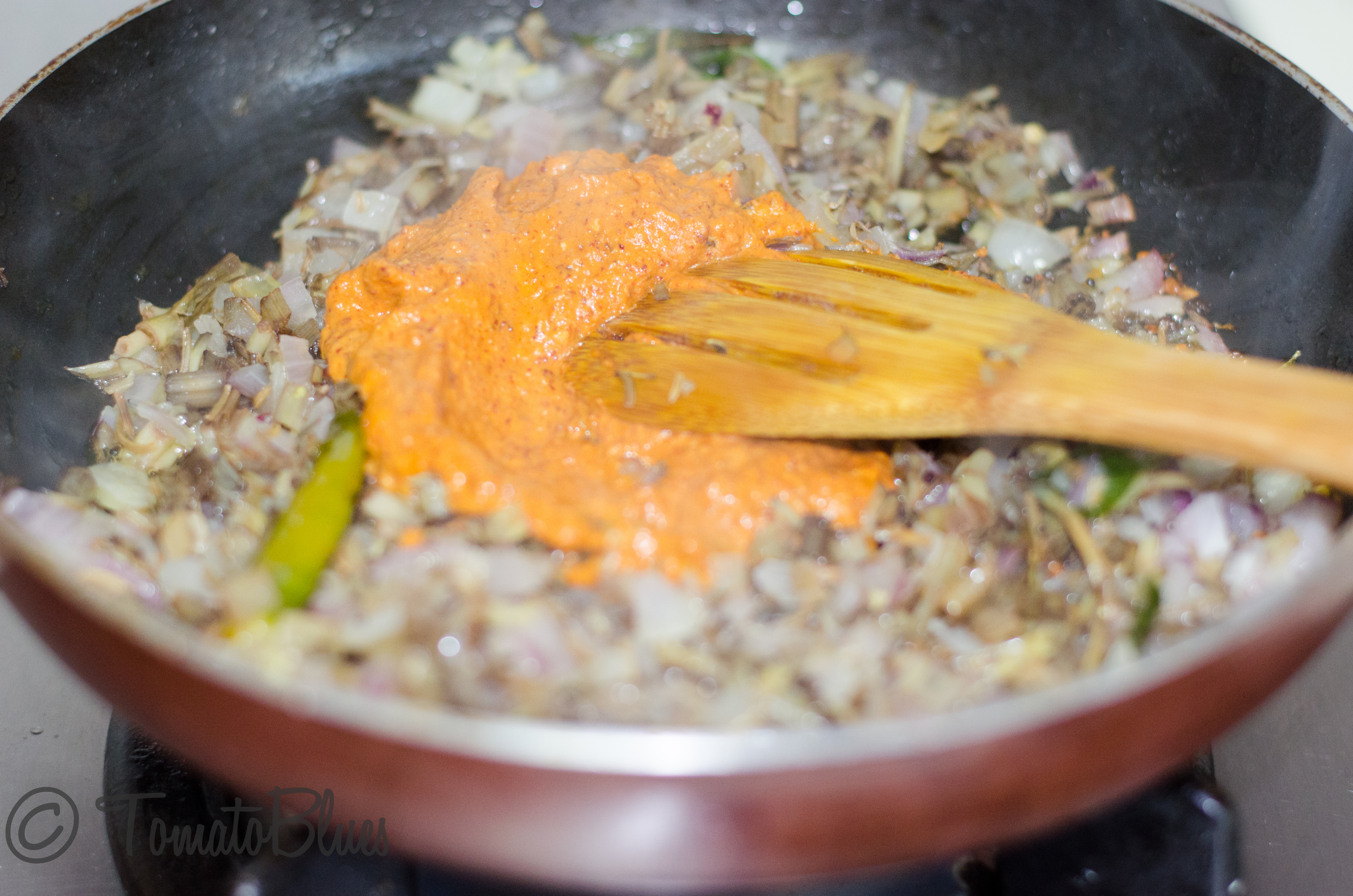 - Saute for a minute or 2. Add the pureed tomato and mix well. Saute till oil separates.