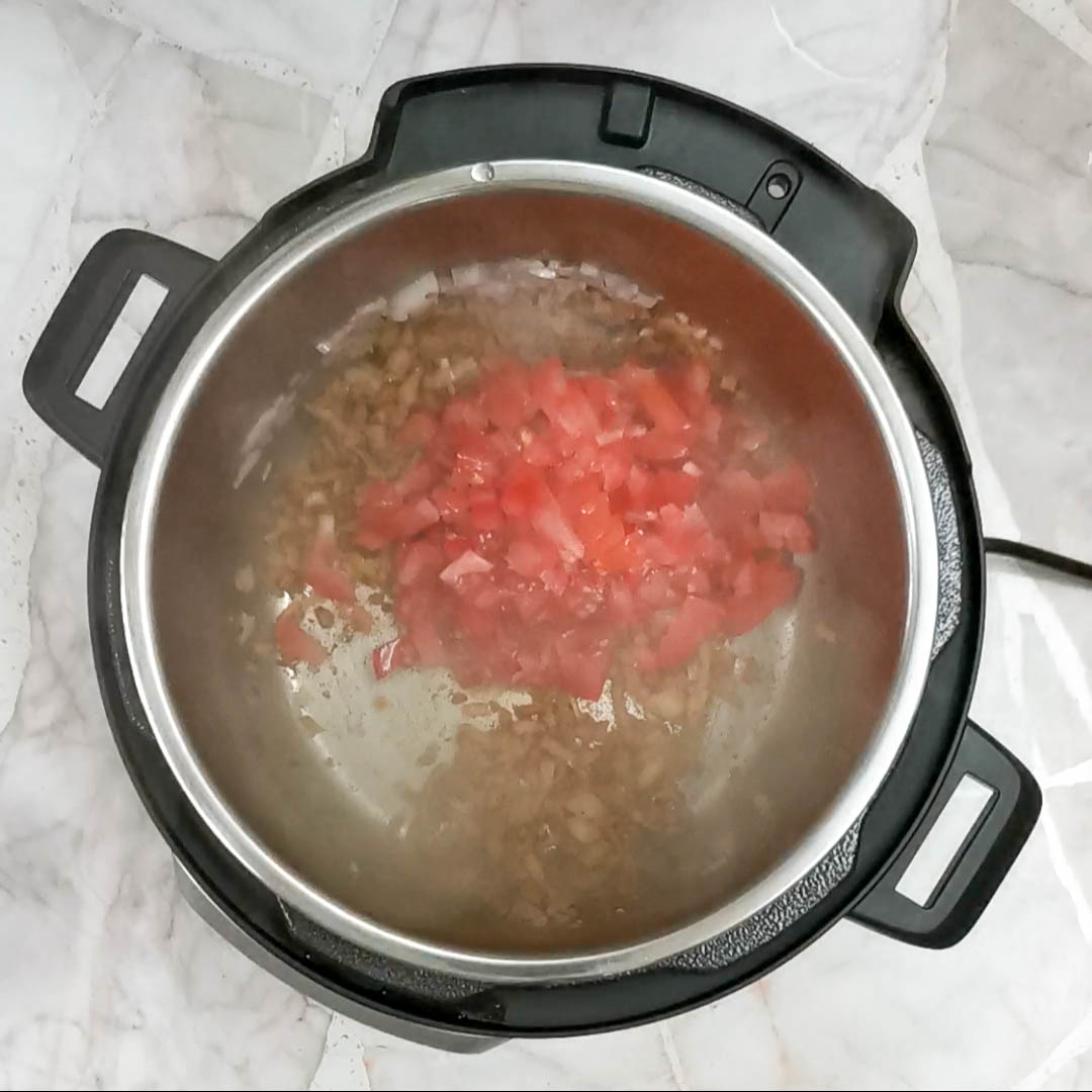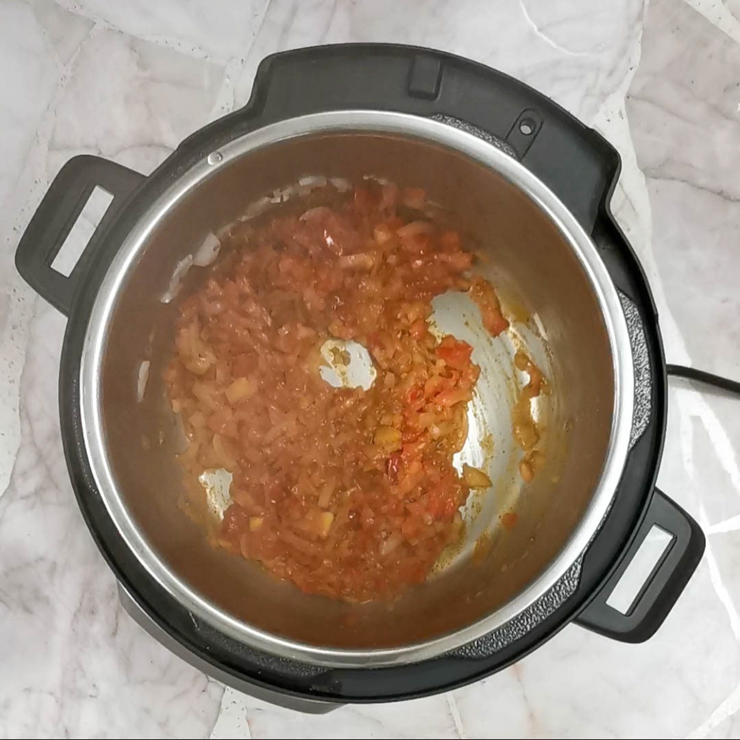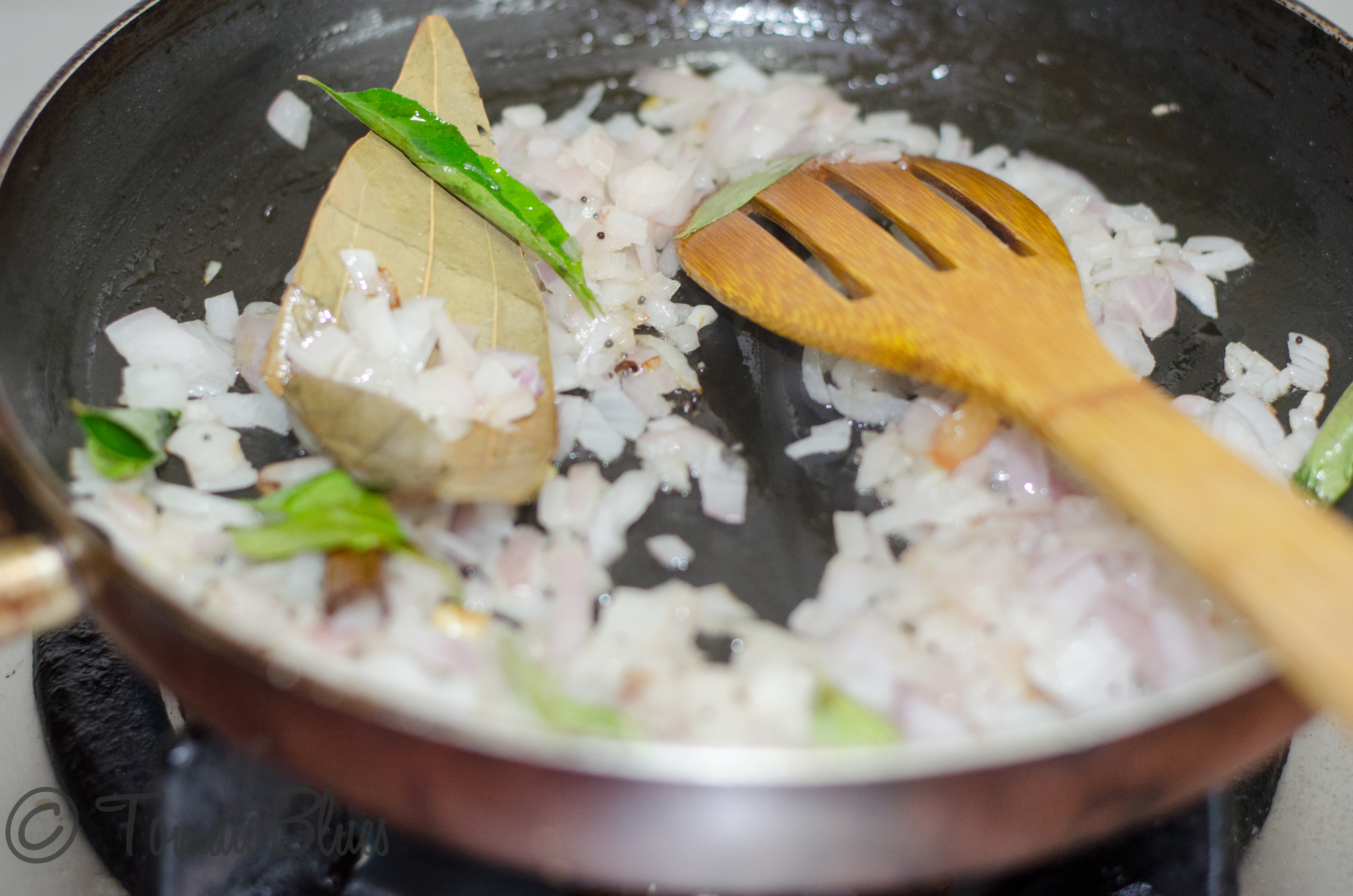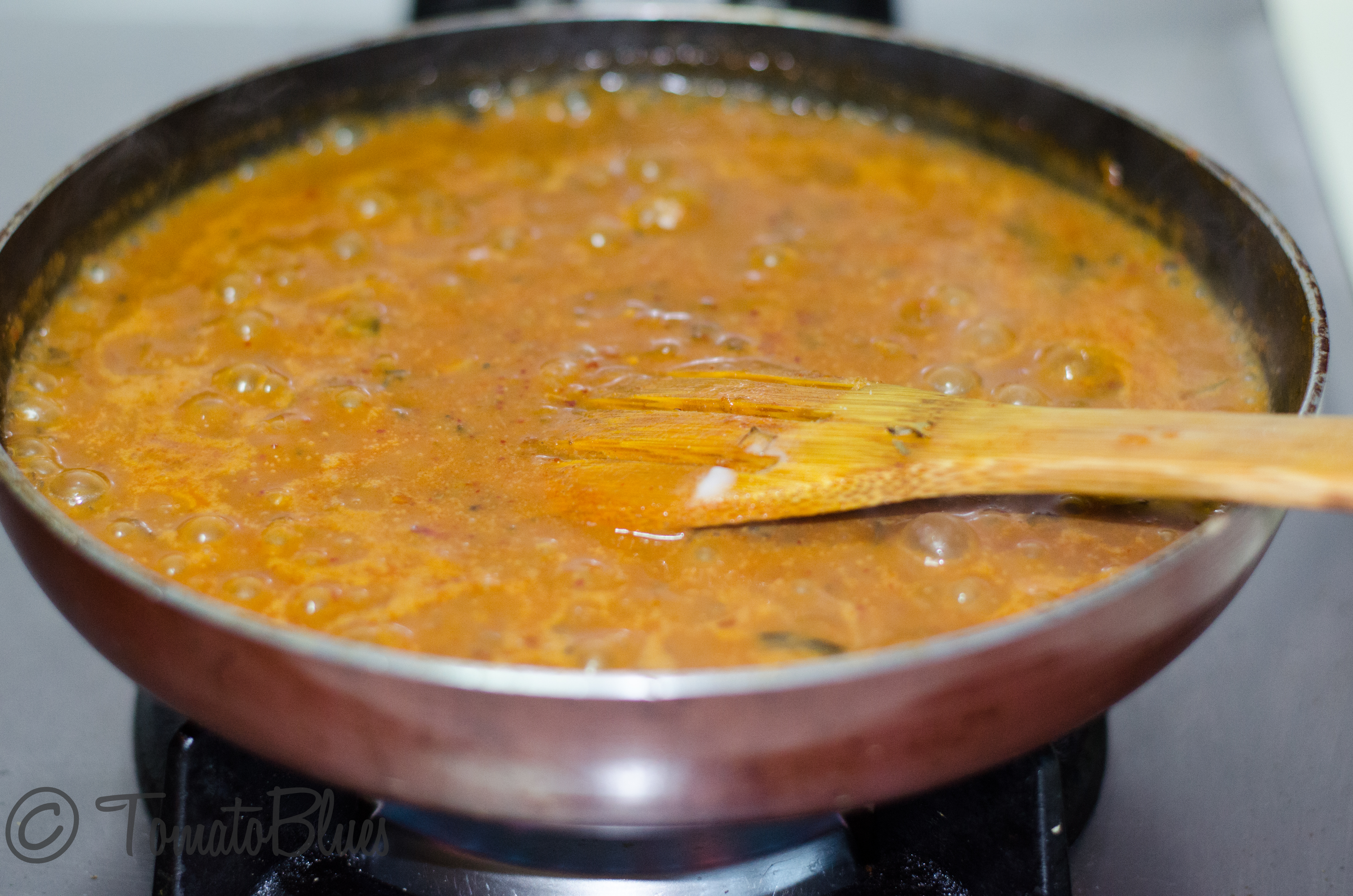 - Saute for a minute or 2. Add the pureed tomato and mix well. Saute till oil separates.