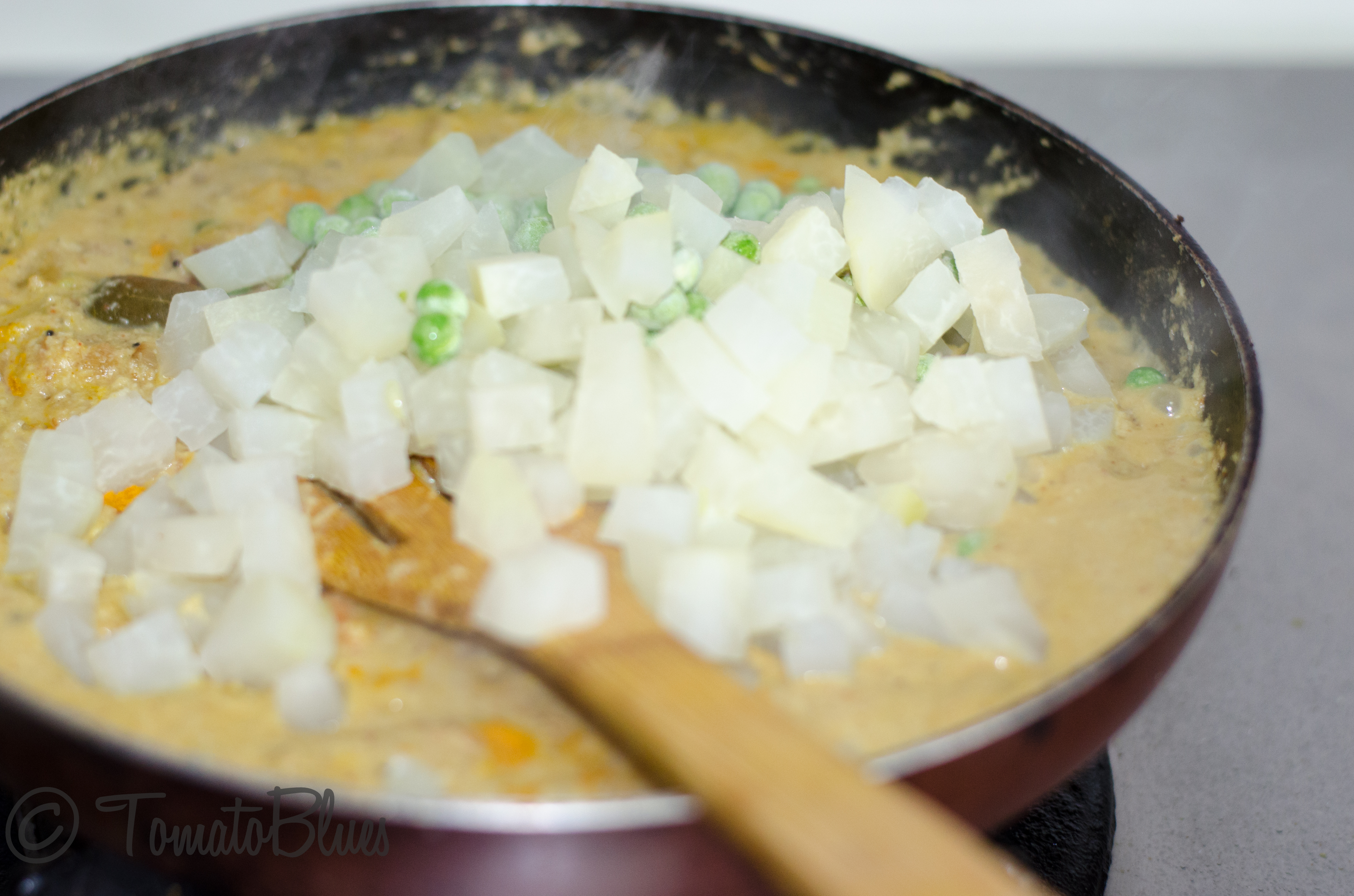 - Now, add the boiled peas and simmer again for 3 to 4 mins.