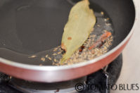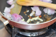 - Once spices begin to turn light brown, add a sprig of curry leaves, onions and ginger.