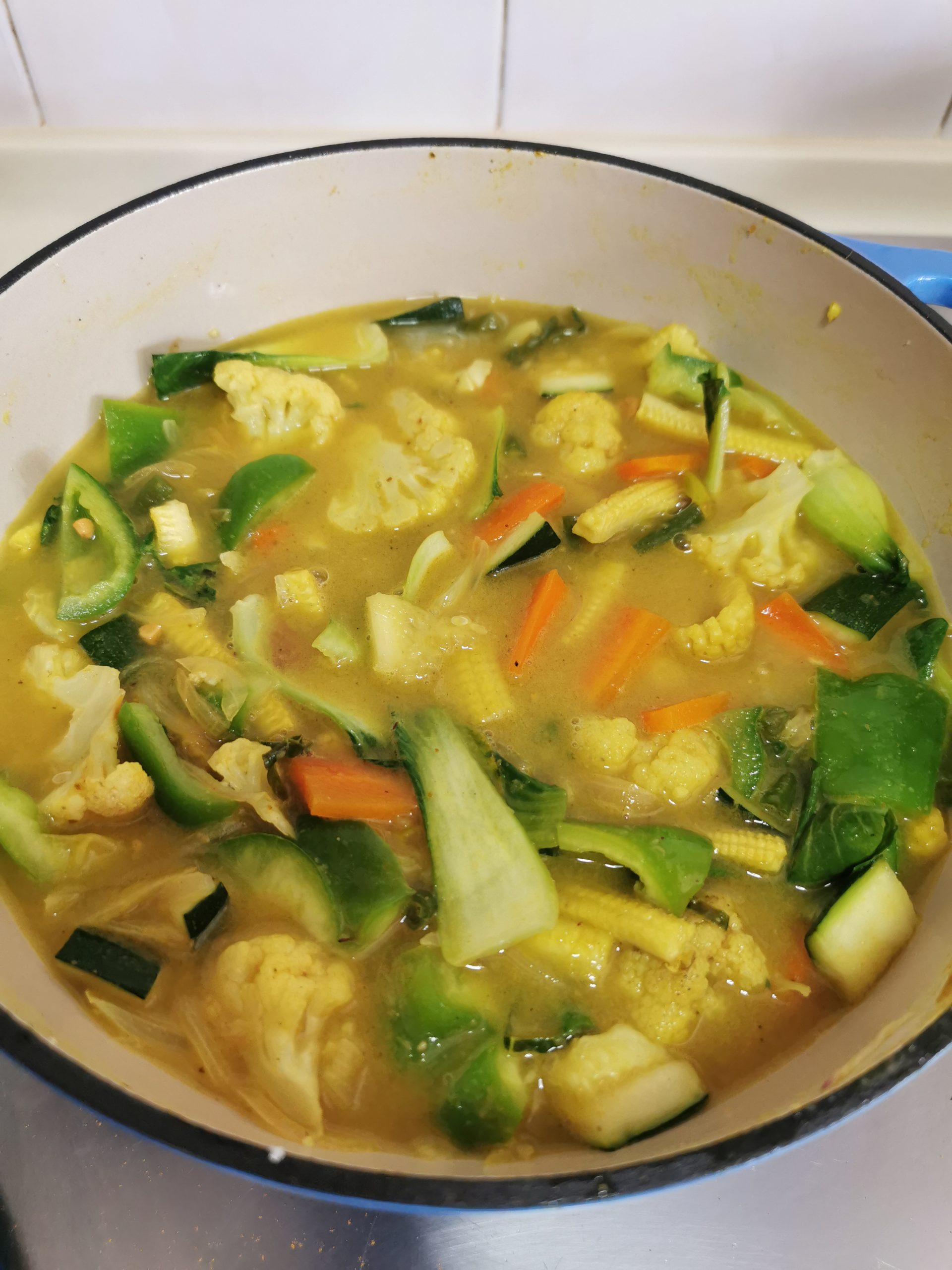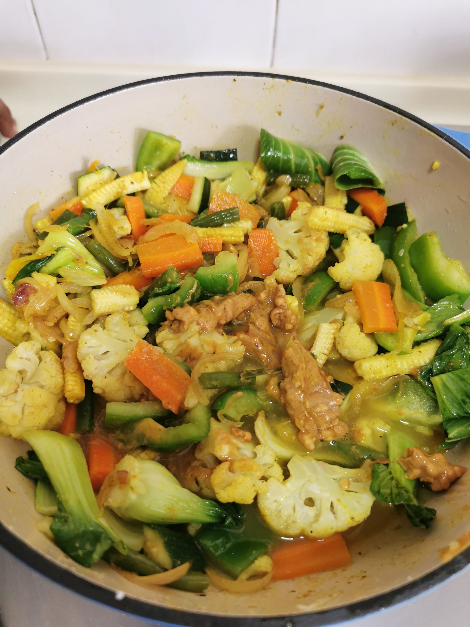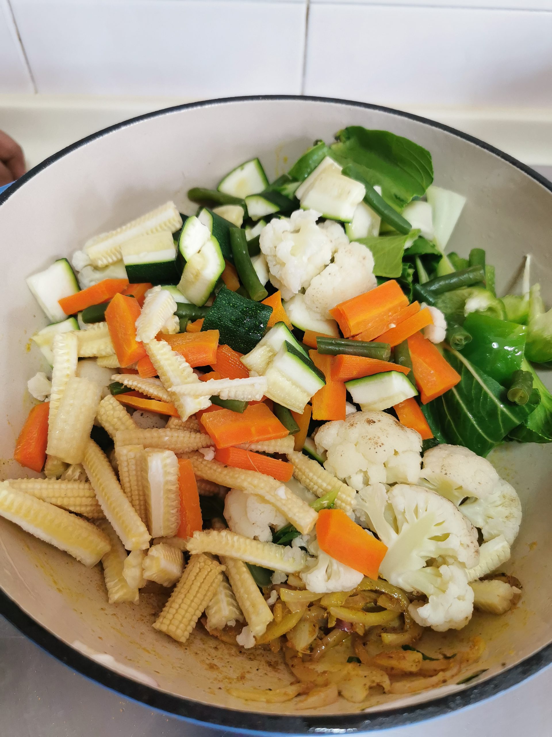- Simmer this for 5 mins until veggies turn fork tender but are still crunchy.