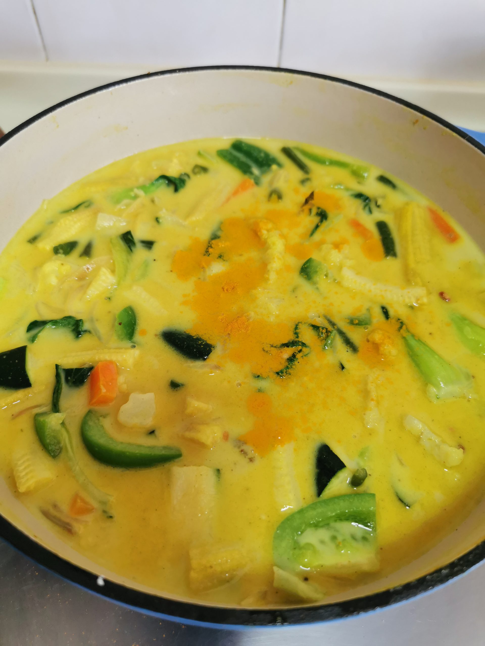 At this stage, add the coconut milk. Combine well and add the turmeric.