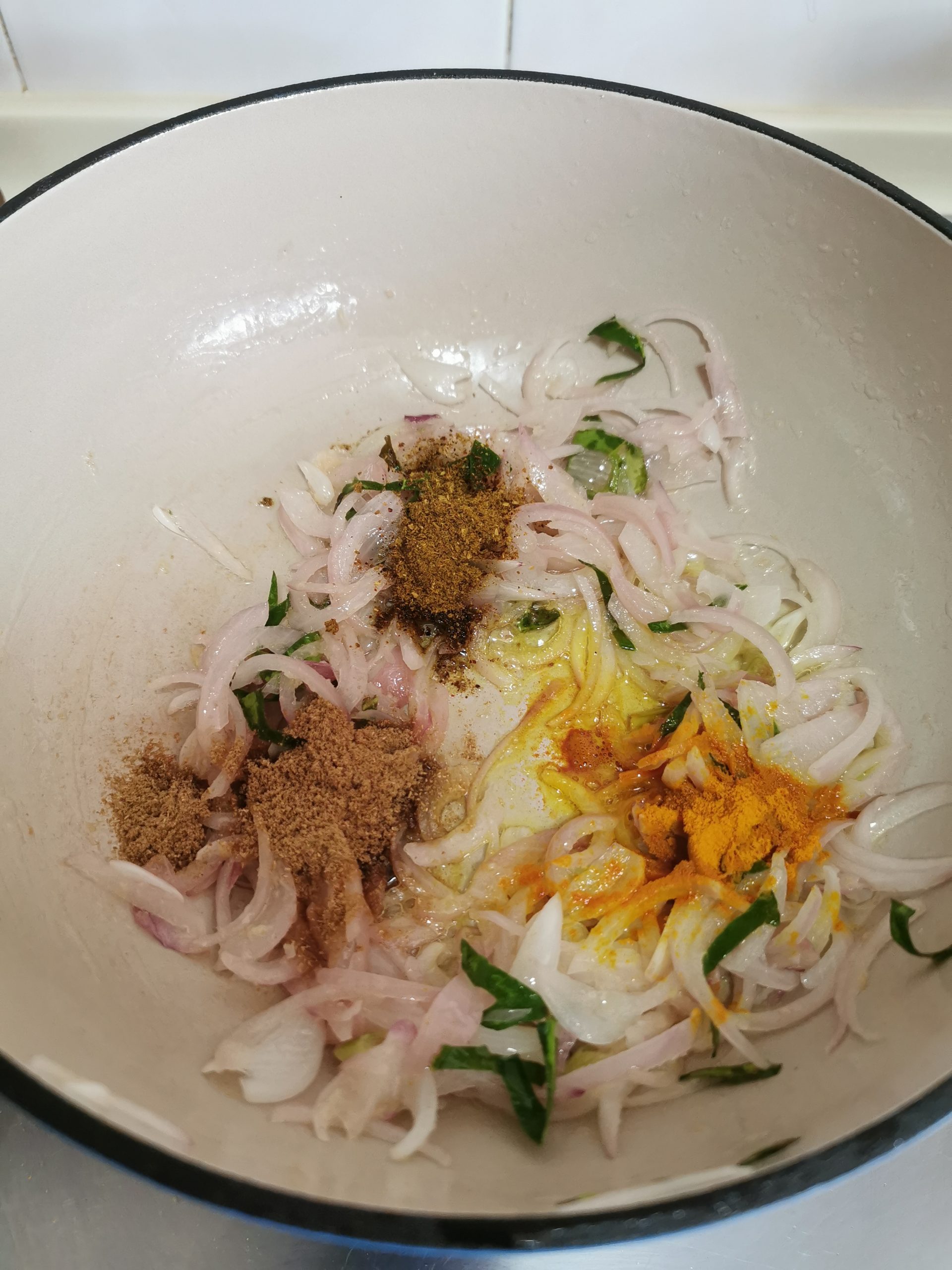 Heat a heavy bottomed pan with oil. You can use any neutral flavored vegetable oil or sesame oil too. Even cold-pressed coconut oil works here.