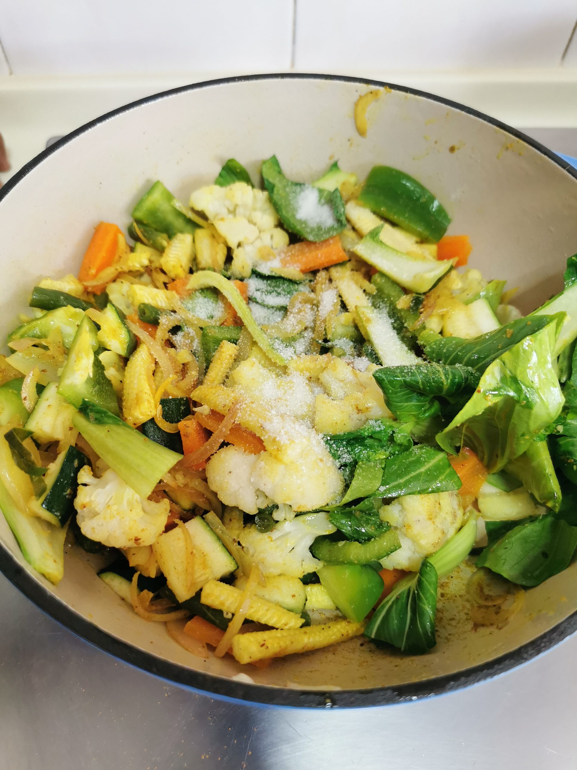 - Toss the veggies once and add the salt and sugar. Mix well.