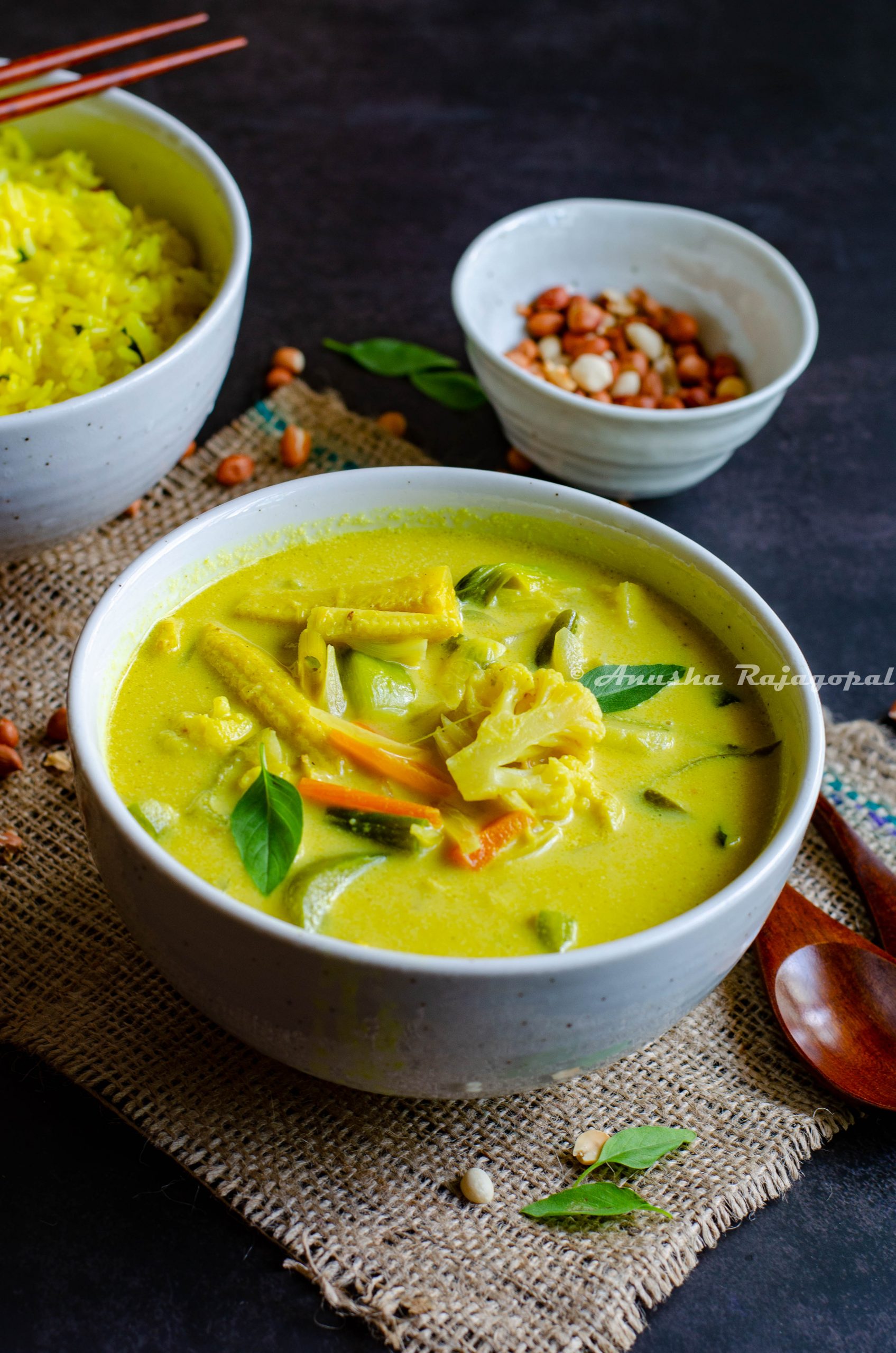 The moment you think of Thai food and their bewitching curries, you simply cannot dismiss the prospects of making curry paste. Right? Well, this vegan thai yellow curry with mixed vegetables does not use any curry paste. This is a mildly spiced, flavorful and light curry that is also soy-free. Yep, you heard me right. No tofu here as well.